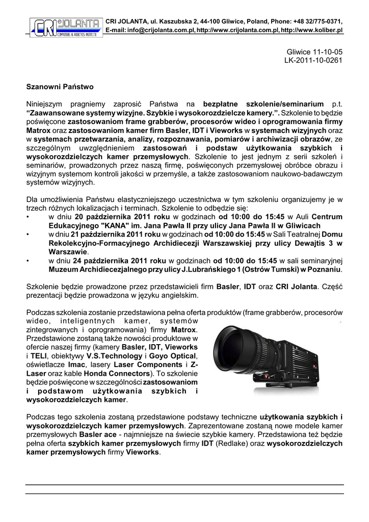 CRI JOLANTA, ul. Kaszubska 2, 44-100 Gliwice, Poland, Phone: +48 32/775-0371, E-mail: [email protected], http://www.crijolanta.com.pl, http://www.koliber.pl Gliwice 11-10-05 LK-2011-10-0261 Szanowni Państwo Niniejszym pragniemy zaprosić Państwa na bezpłatne szkolenie/seminarium p.t. “Zaawansowane systemy wizyjne. Szybkie i wysokorozdzielcze kamery.”. Szkolenie to będzie poświęcone zastosowaniom frame grabberów, procesorów wideo i oprogramowania firmy Matrox oraz zastosowaniom kamer firm Basler, IDT i Vieworks w systemach wizyjnych oraz w systemach przetwarzania, analizy, rozpoznawania, pomiarów i archiwizacji obrazów, ze szczególnym uwzględnieniem zastosowań i podstaw uŜytkowania szybkich i wysokorozdzielczych kamer przemysłowych. Szkolenie to jest jednym z serii szkoleń i seminariów, prowadzonych przez naszą firmę, poświęconych przemysłowej obróbce obrazu i wizyjnym systemom kontroli jakości w przemyśle, a takŜe zastosowaniom naukowo-badawczym systemów wizyjnych. Dla umoŜliwienia Państwu elastyczniejszego uczestnictwa w tym szkoleniu organizujemy je w trzech róŜnych lokalizacjach i terminach. Szkolenie to odbędzie się: • w dniu 20 października 2011 roku w godzinach od 10:00 do 15:45 w Auli Centrum Edukacyjnego "KANA" im. Jana Pawła II przy ulicy Jana Pawła II w Gliwicach • w dniu 21 października 2011 roku w godzinach od 10:00 do 15:45 w Sali Teatralnej Domu Rekolekcyjno-Formacyjnego Archidiecezji Warszawskiej przy ulicy Dewajtis 3 w Warszawie. • w dniu 24 października 2011 roku w godzinach od 10:00 do 15:45 w sali seminaryjnej Muzeum Archidiecezjalnego przy ulicy J.Lubrańskiego 1 (Ostrów Tumski) w Poznaniu. Szkolenie będzie prowadzone przez przedstawicieli firm Basler, IDT oraz CRI Jolanta. Część prezentacji będzie prowadzona w języku angielskim. Podczas szkolenia zostanie przedstawiona pełna oferta produktów (frame grabberów, procesorów wideo, inteligentnych kamer, systemów zintegrowanych i oprogramowania) firmy Matrox. Przedstawione zostaną takŜe nowości produktowe w ofercie naszej firmy (kamery Basler, IDT, Vieworks i TELI, obiektywy V.S.Technology i Goyo Optical, oświetlacze Imac, lasery Laser Components i ZLaser oraz kable Honda Connectors). To szkolenie będzie poświęcone w szczególności zastosowaniom i podstawom uŜytkowania szybkich i wysokorozdzielczych kamer. Podczas tego szkolenia zostaną przedstawione podstawy techniczne uŜytkowania szybkich i wysokorozdzielczych kamer przemysłowych. Zaprezentowane zostaną nowe modele kamer przemysłowych Basler ace - najmniejsze na świecie szybkie kamery. Przedstawiona teŜ będzie pełna oferta szybkich kamer przemysłowych firmy IDT (Redlake) oraz wysokorozdzielczych kamer przemysłowych firmy Vieworks. CRI JOLANTA, ul. Kaszubska 2, 44-100 Gliwice, Poland, Phone: +48 32/775-0371, E-mail: [email protected], http://www.crijolanta.com.pl, http://www.koliber.pl Zademonstrowane zostanie takŜe oprogramowanie StreamPix 5 firmy Norpix do pozyskiwania i archiwizacji sekwencji obrazów takŜe z szybkich kamer. Jako tradycyjny element szkolenia z podstaw systemów wizyjnych zostanie przedstawiona kolejna część tematu, jak dobierać systemy wizyjne dla róŜnych aplikacji. Podczas tego wykładu odpowiemy na pytanie jaka rozdzielczość i jaka szybkość kamery jest potrzebna dla aplikacji. Pokazane zostaną przykłady zastosowań w takich dziedzinach jak: • inspekcja, kontrola jakości w systemach produkcyjnych, • systemy widzenia maszynowego, • robotyka, • systemy nadzoru wizyjnego, • systemy bezpieczeństwa, • obrazowanie medyczne, • mikroskopia, • badania naukowe, • i wielu innych. Podczas szkolenia będzie moŜliwość przedyskutowania wymagań własnych aplikacji wizyjnych. Więcej informacji na temat szkolenia będzie moŜna znaleźć na naszych stronach: szkolenie w Gliwicach 20.10.2011: http://www.crijolanta.com.pl/cgi-bin/infolink.pl?2011.10.20 szkolenie w Warszawie 21.10.2011: http://www.crijolanta.com.pl/cgi-bin/infolink.pl?2011.10.21 szkolenie w Poznaniu 24.10.2011: http://www.crijolanta.com.pl/cgi-bin/infolink.pl?2011.10.24 Ze względu na ograniczoną ilość miejsc, prosimy o zgłaszanie swojego uczestnictwa do dnia 18 paźdzernika 2011 roku. O uczestnictwie będzie decydowała kolejność zgłoszeń. Zgłoszenia uczestnictwa osób moŜna dokonać poprzez adres e-mail: [email protected] lub za pośrednictwem faxu: +48 32 775 0372 lub telefonicznie: +48 32 775 0371. Dla zgłoszenia osób do uczestnictwa w szkoleniu naleŜy podać dane teleadresowe firmy, imiona i nazwiska zgłaszanych osób oraz adresy e-mail i telefony kontaktowe zgłaszanych osób. Z powaŜaniem, Jolanta Gan