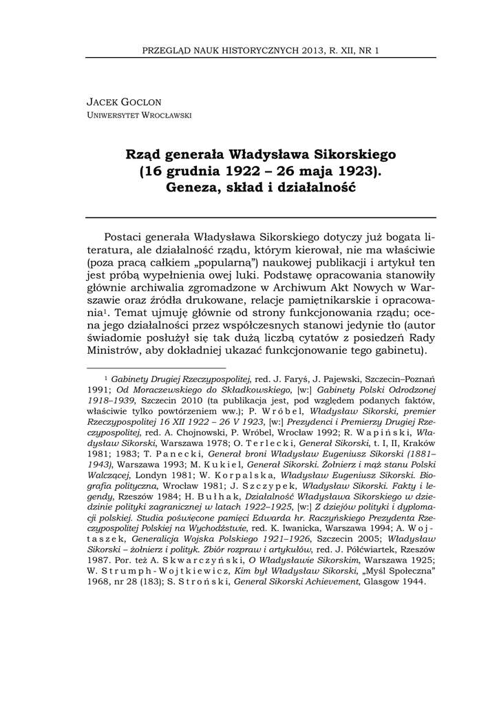 PRZEGLĄD NAUK HISTORYCZNYCH 2013, R. XII, NR 1 JACEK GOCLON UNIWERSYTET WROCŁAWSKI Rząd generała Władysława Sikorskiego (16 grudnia 1922 – 26 maja 1923). Geneza, skład i działalność Postaci generała Władysława Sikorskiego dotyczy już bogata literatura, ale działalność rządu, którym kierował, nie ma właściwie (poza pracą całkiem „popularną”) naukowej publikacji i artykuł ten jest próbą wypełnienia owej luki. Podstawę opracowania stanowiły głównie archiwalia zgromadzone w Archiwum Akt Nowych w Warszawie oraz źródła drukowane, relacje pamiętnikarskie i opracowania1. Temat ujmuję głównie od strony funkcjonowania rządu; ocena jego działalności przez współczesnych stanowi jedynie tło (autor świadomie posłużył się tak dużą liczbą cytatów z posiedzeń Rady Ministrów, aby dokładniej ukazać funkcjonowanie tego gabinetu). 1 Gabinety Drugiej Rzeczypospolitej, red. J. Faryś, J. Pajewski, Szczecin–Poznań 1991; Od Moraczewskiego do Składkowskiego, [w:] Gabinety Polski Odrodzonej 1918–1939, Szczecin 2010 (ta publikacja jest, pod względem podanych faktów, właściwie tylko powtórzeniem ww.); P. W r ó b e l, Władysław Sikorski, premier Rzeczypospolitej 16 XII 1922 – 26 V 1923, [w:] Prezydenci i Premierzy Drugiej Rzeczypospolitej, red. A. Chojnowski, P. Wróbel, Wrocław 1992; R. W a p i ń s k i, Władysław Sikorski, Warszawa 1978; O. T e r l e c k i, Generał Sikorski, t. I, II, Kraków 1981; 1983; T. P a n e c k i, Generał broni Władysław Eugeniusz Sikorski (1881– 1943), Warszawa 1993; M. K u k i e l, Generał Sikorski. Żołnierz i mąż stanu Polski Walczącej, Londyn 1981; W. K o r p a l s k a, Władysław Eugeniusz Sikorski. Biografia polityczna, Wrocław 1981; J. S z c z y p e k, Władysław Sikorski. Fakty i legendy, Rzeszów 1984; H. B u ł h a k, Działalność Władysława Sikorskiego w dziedzinie polityki zagranicznej w latach 1922–1925, [w:] Z dziejów polityki i dyplomacji polskiej. Studia poświęcone pamięci Edwarda hr. Raczyńskiego Prezydenta Rzeczypospolitej Polskiej na Wychodźstwie, red. K. Iwanicka, Warszawa 1994; A. W o j t a s z e k, Generalicja Wojska Polskiego 1921–1926, Szczecin 2005; Władysław Sikorski – żołnierz i polityk. Zbiór rozpraw i artykułów, red. J. Półćwiartek, Rzeszów 1987. Por. też A. S k w a r c z y ń s k i, O Władysławie Sikorskim, Warszawa 1925; W. S t r u m p h - W o j t k i e w i c z, Kim był Władysław Sikorski, „Myśl Społeczna” 1968, nr 28 (183); S. S t r o ń s k i, General Sikorski Achievement, Glasgow 1944. 182 JACEK GOCLON Utworzenie rządu W. Sikorskiego2 Gabinet gen. Sikorskiego został powołany w atmosferze pełnej napięcia; po wyborze Gabriela Narutowicza na urząd prezydenta RP ówczesny premier Julian Nowak, nie potrafiąc zapanować nad 2 Władysław Eugeniusz Sikorski urodził się 20 maja 1881 r. w Tuszowie Narodowym pod Mielcem, jako trzecie dziecko nauczyciela szkoły ludowej Tomasza Sikorskiego i matki, Emilii Albertowicz-Hawrowskiej. Uczęszczał do szkoły ludowej, a następnie do gimnazjum w Rzeszowie i seminarium nauczycielskiego. Studiował w latach 1902–1908 na Wydziale Inżynierii Politechniki Lwowskiej (otrzymując tytuł inżyniera), gdzie zaczął angażować się społecznie i politycznie jako sekretarz Towarzystwa Szkół Ludowych i jako prezes „Bratniaka”; należał także do „Zetu”. Przez jeden rok (1904–1905) odbył służbę w armii austriackiej jako ochotnik. Od 1909 r. rozpoczął pracę w Namiestnictwie we Lwowie (w departamencie budowli wodnych). Jeszcze w okresie studiów wystąpił z „Zetu” i nawiązał kontakty z lewicą niepodległościową – Związkiem Narodu Polskiego. Od 1907 r. prowadził kursy wojskowe organizowane przez Polską Partię Socjalistyczną, a później działał w Zawiązku Walki Czynnej i Tymczasowej Komisji Skonfederowanych Stronnictw Niepodległościowych. W dniu 5 sierpnia 1914 r. został zmobilizowany, ale dzięki politycznym znajomościom uniknął poboru. Po ogłoszeniu przez J. Piłsudskiego powstania „Rządu Narodowego” (który de facto nie zaistniał), został mianowany komisarzem na Galicję z ramienia tego „gabinetu”. Następnie wziął udział w organizacji legionów i w Naczelnym Komitecie Narodowym, gdzie kierował Departamentem Wojskowym; w tym czasie zaczęło dochodzić do rozdźwięków pomiędzy nim a J. Piłsudskim, którego „meandrów politycznych” W. Sikorski nie podzielał; dążył nadal do rozbudowy legionów, mimo odejścia już od realizacji tego zadania przez komendanta i nie stanął po stronie legionistów w okresie „kryzysu przysięgowego”. Od 1917 r. kierował Krajowym Inspektoratem Zaciągu. Z orientacją na państwa „centralne” zerwał dopiero po zawarciu pokoju brzeskiego pomiędzy Niemcami a Ukrainą (w lutym 1918 r.), tak niekorzystnego dla Polaków (oderwanie chełmszczyzny od Królestwa Polskiego); wydał wówczas rozkaz popierający zbuntowanych legionistów, za co go aresztowano (ponieważ nie wziął aktywnego udziału w buncie, został zwolniony). Z konieczności wrócił do pracy cywilnej (w firmie „Demobil”), ale już pod koniec 1918 r. wziął udział w walkach z Ukraińcami, dowodząc grupą operacyjną. Następnie objął dowodzenie 9. Dywizją Piechoty w walkach z oddziałami Armii Czerwonej w sierpniu 1919 r. (awansował wówczas na stopień generała porucznika). Największą rolę w swojej karierze wojskowej odegrał latem 1920 r., w wojnie polsko-bolszewickiej, dowodząc 5. Armią Ochotniczą „nad Wisłą i Wkrą” (tak później zatytułował swoją wspomnieniową książkę). Po zwycięskiej wojnie pozostał w służbie wojskowej i w 1921 r. został mianowany szefem Sztabu Generalnego. W ramach korpusu oficerskiego współtworzył tajną organizację „Honor i Ojczyzna”, która powstała z jego inicjatywy; miał rzeczywiście silną pozycję w armii, stąd w przełomowych dniach grudni
