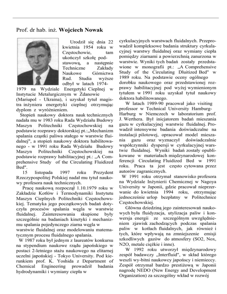 Prof. dr hab. inż. Wojciech Nowak Urodził się dnia 22 kwietnia 1954 roku w Częstochowie, tam ukończył szkołę podstawową, a następnie Techniczne Zakłady Naukowe Górnictwa Rud. Studia wyższe odbył w latach 19741979 na Wydziale Energetyki Cieplnej w Instytucie Metalurgicznym w Żdanowie (Mariupol - Ukraina), i uzyskał tytuł magistra inżyniera energetyki cieplnej otrzymując dyplom z wyróżnieniem. Stopień naukowy doktora nauk technicznych nadała mu w 1983 roku Rada Wydziału Budowy Maszyn Politechniki Częstochowskiej na podstawie rozprawy doktorskiej pt.:„Mechanizm spalania cząstki paliwa stałego w warstwie fluidalnej", a stopień naukowy doktora habilitowanego - w 1991 roku Rada Wydziału Budowy Maszyn Politechniki Częstochowskiej na podstawie rozprawy habilitacyjnej pt.: „A Comprehensive Study of the Circulating Fluidized Bed". 15 listopada 1997 roku Prezydent Rzeczypospolitej Polskiej nadał mu tytuł naukowy profesora nauk technicznych. Pracę naukową rozpoczął 1.10.1979 roku w Zakładzie Kotłów i Termodynamiki Instytutu Maszyn Cieplnych Politechniki Częstochowskiej. Tematyka jego początkowych badań dotyczyła procesów spalania węgla w warstwie fluidalnej. Zainteresowania skupione były szczególnie na badaniach kinetyki i mechanizmu spalania pojedynczego ziarna węgla w warstwie fluidalnej oraz modelowaniu matematycznym procesu fluidalnego spalania. W 1987 roku był jednym z laureatów konkursu na stypendium naukowe rządu japońskiego w postaci 2-letniego stażu naukowego na elitarnej uczelni japońskiej - Tokyo University. Pod kierunkiem prof. K. Yoshida z Department of Chemical Engineering prowadził badania hydrodynamiki i wymiany ciepła w cyrkulacyjnych warstwach fluidalnych. Przeprowadził kompleksowe badania struktury cyrkulacyjnej warstwy fluidalnej oraz wymiany ciepła pomiędzy ziarnami a powierzchnią zanurzona w warstwie. Wyniki tych badań zostały przedstawione w monografii pt.: „A Comprehensive Study of the Circulating Dluitized Bed" w 1989 roku. Na podstawie oceny ogólnego dorobku naukowego oraz przedstawionej rozprawy habilitacyjnej pod wyżej wymienionym tytułem w 1991 roku uzyskał tytuł naukowy doktora habilitowanego. W latach 1989-90 pracował jako visiting professor w Technical University HamburgHarburg w Niemczech w laboratorium prof. J. Werthera. Był inicjatorem badań mieszania gazu w cyrkulacyjnej warstwie fluidalnej. Prowadził intensywne badania doświadczalne na instalacji pilotowej, opracował model mieszania gazu oraz wyznaczył doświadczalnie współczynniki dyspersji w cyrkulacyjnej warstwie fluidalnej. Wyniki badań zostały opublikowane w materiałach międzynarodowej konferencji Circulating Fluidized Bed w 1991 roku. Praca ta jest często cytowana przez autorów zagranicznych. W 1991 roku otrzymał stanowisko profesora na Wydziale Inżynierii Chemicznej w Nagoya University w Japonii, gdzie pracował nieprzerwanie do kwietnia 1994 roku, otrzymując jednocześnie urlop bezpłatny w Politechnice Częstochowskiej. Główna dziedziną jego zainteresowań naukowych była fluidyzacja, utylizacja paliw i konwersja energii ze szczególnym uwzględnieniem zjawisk zachodzących podczas spalania paliw w kotłach fluidalnych, jak również i tych, które wpływają na zmniejszenie emisji szkodliwych gazów do atmosfery (SO2, Nox, N2O, metale ciężkie i inne). W 1992 roku utworzył międzynarodowy zespół badawczy „Interfluid", w skład którego weszli wy-bitni naukowcy japońscy i niemieccy. Zespół otrzymał bardzo prestiżową w Japonii nagrodę NEDO (New Energy and Development Organization) za szczególny wkład w rozwój czystych technologii węgla. W ramach 3-letnich badań międzynarodowego zespołu Interfluid opracowano wiele ciekawych technologii utylizacji paliw i konwersji energii, które zostały szczegółowo opisane w licznych publikacjach zagranicznych. W ramach programu współpracy był współorganizatorem dwóch seminariów naukowych: w 1993 roku „Current Trends in Power Generation" w Hamburgu oraz w 1994 roku „Fluidized Bed Combustion" w Nagoii. W okresie swojej pracy w Nagoya University był wielokrotnie zapraszany jako wykładowca na inne uczelnie japońskie oraz wygłosił kilkanaście wykładów na uczelniach szwedzkich i niemieckich. W 1992 roku został zaproszony przez Japan Society of Chemical Engineering do wygłoszenia referatu plenarnego na 5* Sumposium on Circulating Fluidized Bed w Tokio. Był recenzentem wielu artykułów naukowych dla Japan Journal of Chemical Engineering, Powder Technology i AIChE Symp. Ser. Z dniem 1 kwietnia 1994 roku został mianowany na stanowisko profesora nadzwyczajnego Politechniki Częstochowskiej w Instytucie Inżynierii Środowiska. 15 listopada 1997 roku Prezydent Rzeczypospolitej Polskiej nadał mu tytuł naukowy profesora. 1 grudnia 1997 roku otrzymał nominację na stanowisko profesora nadzwyczajnego na stałe w Politechnice Częstochowskiej. Obecnie pełni funkcję kierownika Instytutu Zaawansowanych Technologii Energetycznych na Wydziale Inżynierii Środowiska i Biotechnologii Politechniki Częstochowskiej oraz funkcję Prodziekana ds. Nauki na tym Wydziale. Opublikowany dorobek naukowy prof. Wojciecha Nowaka stanowi ponad 240 publikacji, w tym ponad 100 oryginalnych prac twórczych.
