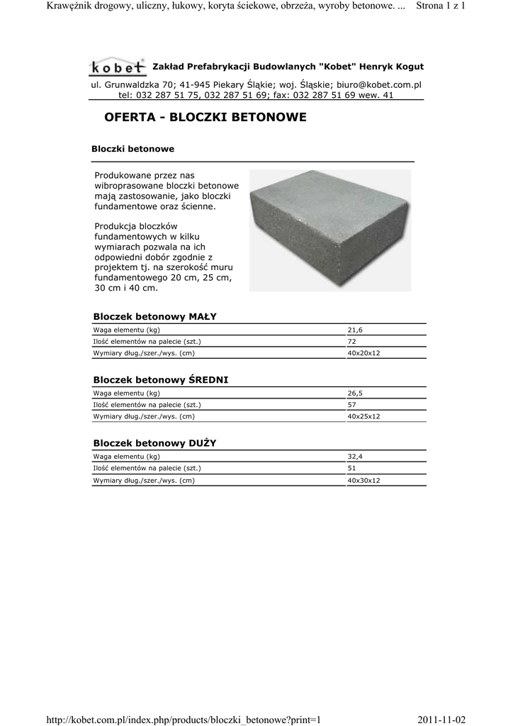 Krawężnik drogowy, uliczny, łukowy, koryta ściekowe, obrzeża, wyroby betonowe. ... Strona 1 z 1 Zakład Prefabrykacji Budowlanych "Kobet" Henryk Kogut ul. Grunwaldzka 70; 41-945 Piekary Śląkie; woj. Śląskie; [email protected] tel: 032 287 51 75, 032 287 51 69; fax: 032 287 51 69 wew. 41 OFERTA - BLOCZKI BETONOWE Bloczki betonowe Produkowane przez nas wibroprasowane bloczki betonowe mają zastosowanie, jako bloczki fundamentowe oraz ścienne. Produkcja bloczków fundamentowych w kilku wymiarach pozwala na ich odpowiedni dobór zgodnie z projektem tj. na szerokość muru fundamentowego 20 cm, 25 cm, 30 cm i 40 cm. Bloczek betonowy MAŁY Waga elementu (kg) 21,6 Ilość elementów na palecie (szt.) 72 Wymiary dług./szer./wys. (cm) 40x20x12 Bloczek betonowy ŚREDNI Waga elementu (kg) 26,5 Ilość elementów na palecie (szt.) 57 Wymiary dług./szer./wys. (cm) 40x25x12 Bloczek betonowy DUŻY Waga elementu (kg) 32,4 Ilość elementów na palecie (szt.) 51 Wymiary dług./szer./wys. (cm) 40x30x12 http://kobet.com.pl/index.php/products/bloczki_betonowe?print=1 2011-11-02