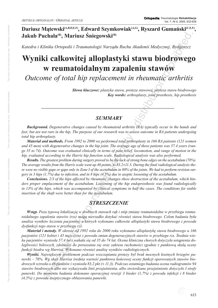 Vol. 7, Nr 6, 2005, 633-638 ed . DariuszMątewski(A,B,D,E,F),EdwardSzymkowiak(A,G),RyszardGumański(C,E,F), JakubPuchała(B),MariuszŚniegowski(B) tio np roh ibit Katedrai KlinikaOrtopediii TraumatologiiNarząduRuchuAkademiiMedycznej, Bydgoszcz Wynikicałkowitejalloplastykistawubiodrowego w reumatoidalnymzapaleniustawów Outcomeoftotalhipreplacementinrheumaticarthritis Summary dis tr ibu Słowakluczowe:plastykastawu,protezastawowa,protezastawubiodrowego Keywords:arthroplasty,jointprosthesis,hipprosthesis rso na lu se on ly - Background. Degenerativechangescausedbyrheumatoidarthritis(RA)typicallyoccurinthehandsand feet,butarenotrareinthehip.ThepurposeofourresearchwastoassessoutcomeinRApatientsundergoing totalhiparthroplasty. materialandmethods. From 1992to 2000weperformedtotalarthroplastyin 166RApatients(121women and 45men)withdegenerativechangesinthehipjoint.Theaverageageofthesepatientswas 57.4years(range 35to 74).Outcomewasevaluatedclinicallyintermsofpainrelief,locomotion,andrangeofmotioninthe hip,evaluatedaccordingtotheHarrishipfunctionscale.Radiologicalanalysiswasalsoperformed. results. Thegreatestproblemduringsurgeryprovedtobethelackofstrongboneedgesontheacetabulum(78%). TheaverageresultsfromtheHarrisscalewentup 46points,to 83.2±11.3.DuringthefinalradiologicalanalysistherewerenovisiblegapsorgapsonlyinZone I oftheacetabulumin 80%ofthejoints.Wehadtoperformrevisionsurgeryin 3hips(1.7%)duetoinfection,andin 8hips(4.5%)duetoasepticlooseningoftheacetabulum. Conclusions. 2/3ofthehipsaffectedbyrheumaticchangesshowdestructionoftheacetabulum,whichhinders proper emplacement of the acetabulum. Loosening of the hip endoprosthesis was found radiologically in 13%ofthehips,whichwasaccompaniedbyclinicalsymptomsinhalfthecases.Theconditionsforstable insertionoftheshaftwerebetterthanfortheacetabulum. pe StreSzCzenie Th is c op y is for Wstęp. Pozatypowąlokalizacjąw drobnychstawachrąki stópzmianyreumatoidalnew przebiegureumatoidalnegozapaleniastawów(rzs)mogąnierzadkodotykaćrównieżstawubiodrowego.Celembadaniabyła analizawynikówleczeniapacjentów,u którychwykonanocałkowitealloplastykistawubiodrowegoz powodu dysfunkcjitegostawuw przebiegurzs. materiałi metody. W okresieod 1992rokudo 2000rokuwykonanoalloplastykęstawubiodrowegou 166 pacjentów(121kobieti 45mężczyzn)z powoduzmiandegeneracyjnychstawóww przebiegurzs.Średniawiekupacjentówwyniosła 57,4lati wahałasięod 35do 74lat.Ocenaklinicznachorychdotyczyłaustąpieniadolegliwości bólowych, zdolności do poruszania się oraz zakresu ruchomości zgodnie z punktową skalą oceny funkcjibiodrawgHarrisa.Wykonanorównieżanalizęwynikówradiologicznych. Wyniki. Największym problemem podczas wszczepiania protezy był brak mocnych kostnych brzegów panewki– 78%.WgskaliHarrisaśredniawartośćpunktowakońcowejocenyfunkcjioperowanychstawówbiodrowychwzrosłao 46punktówi wyniosła 83,2pkt(± 11,3).Podczasostatniegobadaniaocenaradiogramów 94 stawówbiodrowychalboniewykazywałaliniiprzejaśnienia,albostwierdzaneprzejaśnieniedotyczyło I strefy panewki. Do momentu badania dokonano operacyjnej rewizji 3 bioder (1,7%) z powodu infekcji i 8 bioder (4,5%)z powoduaseptycznegoobluzowaniapanewki. - This copy is for personal use only - distribution prohibited. - This copy is for personal use only - distribution prohibited. - This copy is for personal use only - distribution prohibited. - This copy is for personal use only - distribution prohibited. O r t o p e d i a Traumatologia Rehabilitacja ARTYKUŁORYGINALNY/ORIGINALARTICLE 633 ed . tio np roh ibit WStęP CElBADAniA Reumatoidalne zapalenie stawów jest chorobą układowącharakteryzującąsięzajęciemwielustawów, a w szczególności drobnych stawów rąk i stóp. [1] Wskaźnikzachorowalnościna RZSwahasię 0,5do 1,5%populacjiw krajachuprzemysłowionychi występuje 2,5 razy częściej u kobiet, niż u mężczyzn [2].W Polscenotujesię 30000nowychzachorowań na rzs rocznie [3]. Poza typową lokalizacją zmiany reumatoidalnemogąnierzadkodotykaćrównieżdużychstawówtakichjakstawbiodrowylubkolanowy. Eberhard i wsp. stwierdzili, że w ciągu 5 latach od początku choroby dotyczą one już co 5-go biodra u pacjentówz rozpoznanymreumatoidalnymzapaleniemstawów[4]. Zmiany zapalne w zajętych procesem reumatoidalnymstawachprowadządo ichznacznejdestrukcjiwiążącejsięz upośledzeniemichfunkcji.Reumatoidalnezapaleniestawubiodrowegoczęstopowodujepierwotneczynnościoweosłabienieogólnejsprawnościchorychz wielostawowąlokalizacjązmian.Powodem tego jest znaczenie stawu biodrowego dla sprawności człowieka, jednoczesnego wpływu jego stanu czynnościowego na funkcję kończyny dolnej i miednicypodczaschodu. Ustąpienie bólu oraz znacząca poprawa czynnościstawubiodrowegomożezostaćosiągniętau większościpacjentówz reumatoidalnymzapaleniemstawów w wyniku wykonania całkowitej alloplastyki stawubiodrowego,uważanejobecnieza metodęzwyboruw leczeniutegoschorzenia.PotwierdzajątowynikiosiągnięteprzezUngera[5],Creightona [6]czy Severta[7].Wskazaniemdo jejwykonaniajestznacząceosłabieniefunkcjii/lubsilnyupośledzającyból związanyczęstoz szybkopostępującądestrukcjąstawuw wynikunasileniasięreumatoidalnegoprocesu zapalnego. Niestetywysokaczęstośćinfekcji,wyraźna osteoporoza panewki oraz zajęcie wielu stawów wspólniemogąprowadzićdo obluzowywaniasiękomponentówendoprotezy.Jesttonierzadkiepóźnepowikłanie w alloplastyce stawu biodrowego u chorych z reumatoidalnymzapaleniemstawów.Równieżczęstaobecnośćprotruzjipanewkiwymagaprzywróceniaanatomicznejpozycjii orientacjipanewkiendoprotezy podczas osadzania, gdyż niepowodzenie w jejrekonstrukcjimożepredysponowaćdo obluzowaniai migracjipanewki[6,8,9]. Celembadaniabyłaanaliza wynikówleczenia166 pacjentów,u którychwykonano 228całkowitychalloplastykstawubiodrowegoz powodujegodysfunkcjiw przebiegureumatoidalnegozapaleniastawów. MAtERiAłi MEtoDA se on ly - dis tr ibu W okresie od 1992 roku do 2000 roku leczyliśmy 166pacjentó