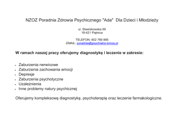 NZOZ Poradnia Zdrowia Psychicznego "Ada" Dla Dzieci i Młodzieży ul. Stawiskowska 69 18-421 Piątnica TELEFON: 602 769 885 EMAIL: [email protected] W ramach naszej pracy oferujemy diagnostykę i leczenie w zakresie: Zaburzenia nerwicowe Zaburzenia zachowania emocji Depresje Zaburzenia psychotyczne Uzależnienia Inne problemy natury psychicznej Oferujemy kompleksową diagnostykę, psychoterapię oraz leczenie farmakologiczne.