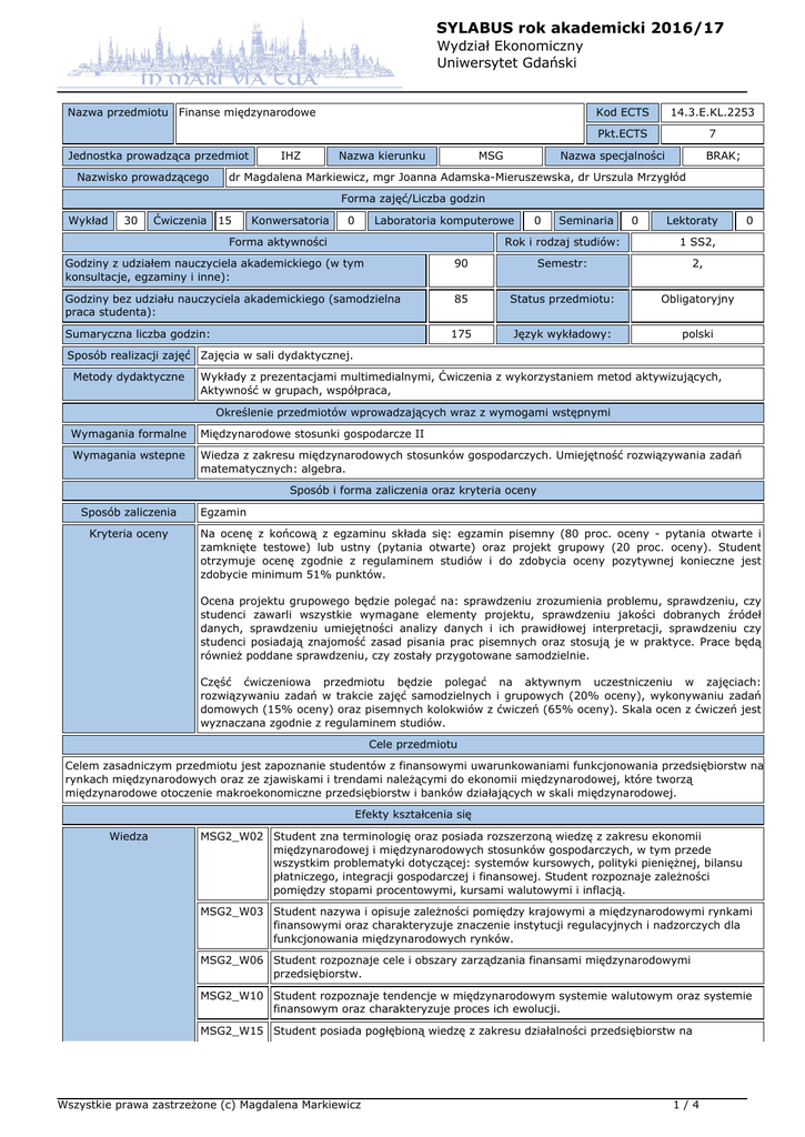 SYLABUS rok akademicki 2016/17 Wydział Ekonomiczny Uniwersytet Gdański Nazwa przedmiotu Finanse międzynarodowe Jednostka prowadząca przedmiot Nazwisko prowadzącego IHZ Nazwa kierunku MSG Kod ECTS 14.3.E.KL.2253 Pkt.ECTS 7 Nazwa specjalności BRAK; dr Magdalena Markiewicz, mgr Joanna Adamska-Mieruszewska, dr Urszula Mrzygłód Forma zajęć/Liczba godzin Wykład 30 Ćwiczenia 15 Konwersatoria 0 Laboratoria komputerowe Forma aktywności 0 Seminaria 0 Lektoraty Rok i rodzaj studiów: 1 SS2, Godziny z udziałem nauczyciela akademickiego (w tym konsultacje, egzaminy i inne): 90 Semestr: 2, Godziny bez udziału nauczyciela akademickiego (samodzielna praca studenta): 85 Status przedmiotu: Obligatoryjny 175 Język wykładowy: polski Sumaryczna liczba godzin: 0 Sposób realizacji zajęć Zajęcia w sali dydaktycznej. Metody dydaktyczne Wykłady z prezentacjami multimedialnymi, Ćwiczenia z wykorzystaniem metod aktywizujących, Aktywność w grupach, współpraca, Określenie przedmiotów wprowadzających wraz z wymogami wstępnymi Wymagania formalne Międzynarodowe stosunki gospodarcze II Wymagania wstepne Wiedza z zakresu międzynarodowych stosunków gospodarczych. Umiejętność rozwiązywania zadań matematycznych: algebra. Sposób i forma zaliczenia oraz kryteria oceny Sposób zaliczenia Kryteria oceny Egzamin Na ocenę z końcową z egzaminu składa się: egzamin pisemny (80 proc. oceny - pytania otwarte i zamknięte testowe) lub ustny (pytania otwarte) oraz projekt grupowy (20 proc. oceny). Student otrzymuje ocenę zgodnie z regulaminem studiów i do zdobycia oceny pozytywnej konieczne jest zdobycie minimum 51% punktów. Ocena projektu grupowego będzie polegać na: sprawdzeniu zrozumienia problemu, sprawdzeniu, czy studenci zawarli wszystkie wymagane elementy projektu, sprawdzeniu jakości dobranych źródeł danych, sprawdzeniu umiejętności analizy danych i ich prawidłowej interpretacji, sprawdzeniu czy studenci posiadają znajomość zasad pisania prac pisemnych oraz stosują je w praktyce. Prace będą również poddane sprawdzeniu, czy zostały przygotowane samodzielnie. Część ćwiczeniowa przedmiotu będzie polegać na aktywnym uczestniczeniu w zajęciach: rozwiązywaniu zadań w trakcie zajęć samodzielnych i grupowych (20% oceny), wykonywaniu zadań domowych (15% oceny) oraz pisemnych kolokwiów z ćwiczeń (65% oceny). Skala ocen z ćwiczeń jest wyznaczana zgodnie z regulaminem studiów. Cele przedmiotu Celem zasadniczym przedmiotu jest zapoznanie studentów z finansowymi uwarunkowaniami funkcjonowania przedsiębiorstw na rynkach międzynarodowych oraz ze zjawiskami i trendami należącymi do ekonomii międzynarodowej, które tworzą międzynarodowe otoczenie makroekonomiczne przedsiębiorstw i banków działających w skali międzynarodowej. Efekty kształcenia się Wiedza MSG2_W02 Student zna terminologię oraz posiada rozszerzoną wiedzę z zakresu ekonomii międzynarodowej i międzynarodowych stosunków gospodarczych, w tym przede wszystkim problematyki dotyczącej: systemów kursowych, polityki pieniężnej, bilansu płatniczego, integracji gospodarczej i finansowej. Student rozpoznaje zależności pomiędzy stopami procentowymi, kursami walutowymi i inflacją. MSG2_W03 Student nazywa i opisuje zależności pomiędzy krajowymi a międzynarodowymi rynkami finansowymi oraz charakteryzuje znaczenie instytucji regulacyjnych i nadzorczych dla funkcjonowania międzynarodowych rynków. MSG2_W06 Student rozpoznaje cele i obszary zarządzania finansami międzynarodowymi przedsiębiorstw. MSG2_W10 Student rozpoznaje tendencje w międzynarodowym systemie walutowym oraz systemie finansowym oraz charakteryzuje proces ich ewolucji. MSG2_W15 Student posiada pogłębioną wiedzę z zakresu działalności przedsiębiorstw na Wszystkie prawa zastrzeżone (c) Magdalena Markiewicz 1/4 SYLABUS rok akademicki 2016/17 Wydział Ekonomiczny Uniwersytet Gdański międzynarodowych rynkach, w tym bezpośrednich inwestycji zagranicznych. Student rozpoznaje specyfikę funkcjonowania przedsiębiorstw i instytucji finansowych na rynkach międzynarodowych, w tym także rozpoznaje znaczenie ryzyka politycznego w tym zakresie. Weryfikacja efektów kształcenia - Wiedza Efekty MSG2_W02 X MSG2_W03 X MSG2_W06 X MSG2_W10 X MSG2_W15 X Umiejętności X X X X X X X X X X MSG2_U01 Student analizuje relacje pomiędzy zjawiskami ekonomicznymi należącymi do ekonomii międzynarodowej, w tym przede wszystkim: potrafi prawidłowo interpretować i wyjaśniać zależności pomiędzy stopami procentowymi, kursami walutowymi i inflacją; rozumie i identyfikuje zależności występujące w gospodarce otwartej (sytuacja w bilansie płatniczym, zależności pomiędzy rynkami finansowymi, procesy integracji). MSG2_U04 Student analizuje zjawiska ekonomiczne za pomocą wybranych danych statystycznych i wskaźników ekonomicznych. Student dokonuje obserwacji i potrafi określić wpływ współczesnego otoczenia makroekonomicznego na decyzje przedsiębiorstw w zakresie internacjonalizacji ich działalności oraz ich sytuacji finansowej. MSG2_U08 Student poszukuje źródeł danych w celu weryfikacji oceny wybranego problemu z finansów międzynarodowych. Student potrafi ocenić efektywność decyzji finansowych i inwestycyjnych przedsiębiorstw za pomocą metod matematycznych i statystycznych. MSG2_U11 Student identyfikuje podstawowe rodzaje ryzyk w działalności podmiotów gospodarczych związanych z działalnością międzynarodową, w tym przede wszystkim ryzyka politycznego i kursowego. Potrafi ocenić konsekwencje tych ryzyk m.in. dla kosztów finansowania oraz efektywności inwestycji. MSG2_U13 Student w sposób precyzyjny stosuje język pojęciowy finansów międzynarodowych w przygotowywanych pracach pisemnych dotyczących wybranych zagadnień z finansów międzynarodowych. Weryfikacja efektów kształcenia - Umiejętności Efekty MSG2_U01 X MSG2_U04 X X X MSG2_U08 X X X MSG2_U11 X X X MSG2_U13 X Kompetencje X X M