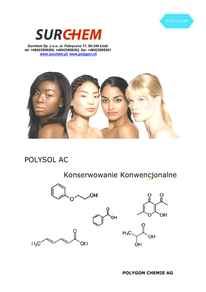Surchem Sp. z o.o. ul. Fabryczna 17, 90-344 Łódź tel: +48422908260, +48422908262, fax: +48422908261 www.surchem.pl, www.polygon.ch POLYSOL AC Konserwowanie Konwencjonalne POLYGON CHEMIE AG POLYSOL AS Dla konserwowania konwencjonalnego Dowód działania: test obciążeniowy POLYSOL AS to środek konserwujący – synergiczna mieszanka alkoholi aromatycznych i kwasów karboksylowych przeznaczona dla kosmetyków zmywalnych i niezmywalnych. Działanie główne: POLYSOL AS wykazuje szerokie i zrównoważone działanie mikrobiologiczne przeciwko: bakteriom gram-dodatnim bakteriom gram-ujemnym drożdżom i grzybom. INCI: Phenoxyethanol, Dehydroacetic Acid, Benzoic Acid, Lactic Acid, Sorbic Acid Opis substancji czynnej: Konserwantami są fenoksyetanol oraz kwasy dehydrooctowy, benzoesowy, mlekowy i sorbinowy. Trzy ostatnie występują w żywności naturalnej. Badania skuteczności: POLYSOL AS zbadano w emulsji O/W o zawartości wody 83,8%, przy stężeniu aplikacji 0,5% osiągając następujące rezultaty: Zakres stosowania: Dla wszystkich rodzajów kosmetyków zmywalnych i niezmywalnych, niezależnie od tego, czy są to układy kationowe, anionowe czy niejonowe Stężenia aplikacji: 0,1-0,5%. Stosowane stężenie zależy od kompozycji kosmetycznej, czystości mikrobiologicznej surowców oraz higieny produkcji. Aplikacja: POLYSOL AC jest dobrze rozpuszczalny w kosmetykach spłukiwanych zawierających tenzydy oraz kosmetykach niespłukiwalnych o zawartości emulgatorów. W przypadku aplikacji do fazy wodnej potrzebne jest zastosowanie solubilizatora lub emulgatora, jeśli ten ostatni nie jest łatwo dostępny. Dzięki swojej dobrej odporności temperaturowej pozwala on także na aplikację do fazy lipofilowej, w temperaturze około 40 - 50 º C, z dobrą homogenizacją mieszaniny. Trwałość termiczna: krótkoterminowo stabilny do 85 º C Informacje o produkcie: Klasyfikacja wg 67/548/EWG i (EG) 1272/2008 Xn R22, Xi R36 resp. Acute Tox oral 4 H302, Eye Irrit. 2 H319 składniki CMR/wrażliwe brak konserwanty GMO zagrożenie BSE/TSE próby na zwierzętach metale ciężkie / As 100% konserwantów brak brak produkt nie testowany na zwierzętach <20 ppm / <1 ppm Wszystkie informacje oddają stan wiedzy w chwili powstawania dokumentu i nie stanowią żadnej gwarancji właściwości produktów. POLYSOL AS