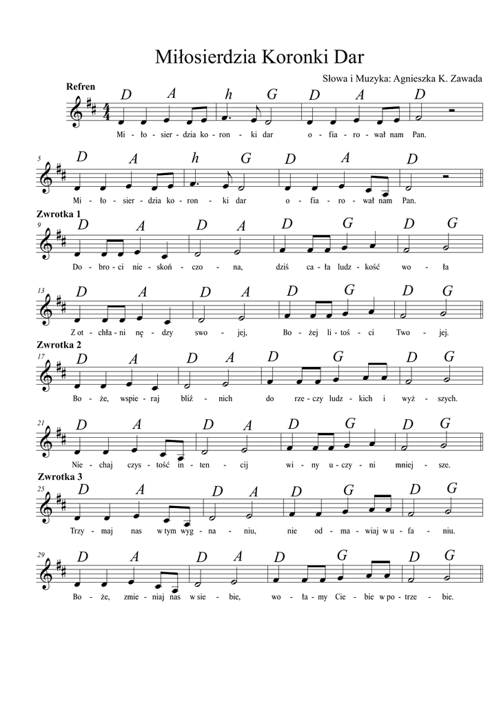 Miłosierdzia Koronki Dar Słowa i Muzyka: Agnieszka K. Zawada ## 4 D & 4 œ œ Refren A G œ œ œ. œ Mi - ło - sier - dzia ko - ron ## D & œ œ A 5 œ h Mi - ło - sier - dzia ko - ron Zwrotka 1 Do - bro - ci nie - skoń czo A ## D & œ œ œ œ œ Z ot - chła - ni ## D & œ œ 17 Bo - że, ## D & œ œ 21 Nie - chaj A œ A œ ## D & œ œ Trzy - maj ## D & œ œ 29 Bo - że, D bliź na, A œ nas A œ w tym wyg - na œ œ zmie - niaj nas cij ˙ w sie - wi - ny A D œ ˙ niu, A D ˙ bie, œ œ œ œ nie wo œ - G œ ˙ Two œ œ œ ˙ - ła i œ G ˙ - jej. G D ˙ wyż ˙ - szych. G D ˙ mniej ˙ - sze. G D œ œ ˙ od - ma - wiaj w u - fa G D œ œ D D u - czy - ni G Ó wo œ œ G D ˙ li - toś - ci œ œ œ D ˙ - œ rze - czy ludz - kich A ˙ œ œ œ G œ D G œ D D œ œ œ œ œ Pan. œ œ ˙ wał nam Pan. ca - ła ludz - kość do - G Bo - żej nich œ fia - ro - D jej, ˙ ˙ - dziś ˙ A Ó œ œ ˙ œ œ œ œ A - œ œ o ˙ czys - tość in - ten Zwrotka 3 25 ˙ wspie - raj A - D œ D A swo D A o - fia - ro - wał nam ki dar - ˙ nę - dzy ki dar œ D 13 Zwrotka 2 - ˙ - œ j œ ˙ D 9 - D G œ œ œ. A ## D & œ œ œ œ œ j œ ˙ h œ œ - ła - my Cie - bie w po - trze niu. G D ˙ ˙ - ˙ bie. 2 Miłosierdzia Koronki Dar ## D & œ œ Zwrotka 4 33 Ciesz się A œ œ œ ˙ wszel - kie stwo - rze A D ## D & œ œ œ œ œ œ ˙ Dał łas - ki i do - bro - dziej nie, A - œ ˙ - 37 D A D ˙ stwa, Bóg D œ G œ œ œ œ ko - cha nie - skoń G œ œ œ œ któ - rych nikt przed - tem G D - ˙ cze D ˙ nie - ˙ nie. G ˙ znał.