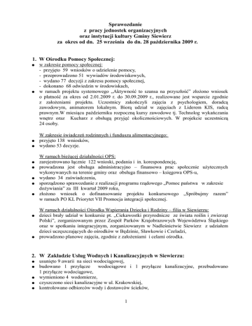 Sprawozdanie z pracy jednostek organizacyjnych oraz instytucji kultury Gminy Siewierz za okres od dn. 25 września do dn. 28 października 2009 r. 1. W Ośrodku Pomocy Społecznej: ● ● ● ● ● ● ● ● ● ● ● w zakresie pomocy społecznej: - przyjęto 59 wniosków o udzielenie pomocy, - przeprowadzono 51 wywiadów środowiskowych, - wydano 77 decyzji z zakresu pomocy społecznej, - dokonano 68 odwiedzin w środowiskach, w ramach projektu systemowego „Aktywność to szansa na przyszłość” złożono wniosek o płatność za okres od 2.01.2009 r. do 30.09.2009 r., realizowane jest wsparcie zgodnie z założeniami projektu. Uczestnicy zakończyli zajęcia z psychologiem, doradcą zawodowym, animatorem lokalnym. Biorą udział w zajęciach z Liderem KIS, radcą prawnym.W miesiącu październiku rozpoczną kursy zawodowe tj. Technolog wykańczania wnętrz oraz Kucharz z obsługą przyjęć okolicznościowych. W projekcie uczestniczą 24 osoby. W zakresie świadczeń rodzinnych i funduszu alimentacyjnego: przyjęto 138 wniosków, wydano 53 decyzje. W ramach bieżącej działalności OPS: zarejestrowano łącznie 122 wnioski, podania i in. korespondencję, prowadzona jest obsługa administracyjno – finansowa prac społecznie użytecznych wykonywanych na terenie gminy oraz obsługa finansowo – księgowa OPS-u, wydano 34 zaświadczenia, sporządzono sprawozdanie z realizacji programu rządowego „Pomoc państwa w zakresie dożywiania” za III kwartał 2009 roku, złożono wniosek o dofinansowanie projektu konkursowego „Spróbujmy razem” w ramach PO KL Priorytet VII Promocja integracji społecznej. W ramach działalności Ośrodka Wspierania Dziecka i Rodziny – filia w Siewierzu: dzieci brały udział w konkursie pt. „Ciekawostki przyrodnicze ze świata roślin i zwierząt Polski”, zorganizowanym przez Zespół Parków Krajobrazowych Województwa Śląskiego oraz w spotkaniu integracyjnym, zorganizowanym w Nadleśnictwie Siewierz z udziałem dzieci uczęszczających do ośrodków w Będzinie, Sławkowie i Czeladzi, prowadzono planowe zajęcia, zgodnie z założeniami i celami ośrodka. 2. W Zakładzie Usług Wodnych i Kanalizacyjnych w Siewierzu: ● ● ● ● ● usunięto 9 awarii na sieci wodociągowej, budowano 1 przyłącze wodociągowe i 1 przyłącze kanalizacyjne, przebudowano 1 przyłącze wodociągowe, wymieniono 4 wodomierze, czyszczono sieci kanalizacyjne w ul. Krakowskiej, kontrolowano odbiorców wody i dostawców ścieków, 1 ● ● ● ● ● ● czyszczono pompownię główną w oczyszczalni „Północ” oraz 2 przepompownie na sieci kanalizacyjnej, rozpoczęto budowę wodociągu przesyłowego z GZD do miasta Siewierza, połączono ślepe odcinki sieci wodociągowej po obydwu stronach drogi w Rynku, zakupiono koparko-ładowarkę Catepillar, wydano uzgodnienia i warunki techniczne przyłączenia do sieci wodociągowej (5 sztuk) oraz do sieci kanalizacyjnej (2 sztuki), wykonano końcowe odbiory przyłączy kanalizacyjnych wraz z podpisaniem umowy na Osiedlu „Zachód” (11 sztuk), 3. W Miejsko-Gminnym Ośrodku Kultury w Siewierzu: w zakresie bieżącej organizacji imprez i widowni odbyły się zajęcia stałych grup zainteresowań, zespołów artystycznych oraz imprezy kulturalne i okolicznościowe, a w tym: - Inauguracja Roku Kulturalnego – Benefis Bernarda Sołtysika, - Bajkolandia Najmłodszych – przedstawienie teatralne dla dzieci pt. „ Jaś i drzewo fasolowe”, - Jubileusz 50 - lecia Pożycia Małżeńskiego – „ Złote Gody”, - Koncert Papieski w wykonaniu Orkiestr Dętych z Siewierza i Wojkowic Kościelnych połączony z projekcją filmu o historii pontyfikatu Jana Pawła II, - Seniorada – Artystyczna Biesiada Złotego Wieku, • do Kalendarza Imprez Kulturalnych woj. Śląskiego w 2010 r. zgłoszono imprezy o charakterze ponadlokalnym tj. - Kuźnia Młodych Talentów (z wysłanym zaproszeniem do Wiesława Ochmana) , - Skrzatolandia 2010 – Festiwal Artystyczny Przedszkolaków pod patronatem czasopism dla dzieci „Miś” i „ Świerszczyk ”, - Seniorada 2010 – Festiwal Artystyczny Złotego Wieku. • • W zakresie spraw organizacyjno-administracyjnych i gospodarczych: - przygotowano projekt w ramach RPO działanie 9.5 Kapitał Ludzki pn. „Z pocztą e-mailową i www. stroną – jesteśmy w internecie globalną ikoną” na kwotę 49.540 zł. Projekt przewiduje powstanie stron internetowych i poczty e-mailowej dla sołectw działających w obrębie Centrum Kształcenia w Żelisławicach oraz wyposażenie ich w domeny internetowe i tablice informacyjne z danymi strony internetowej, które będą umieszczone przy wjeździe do miejscowości, - Powiatowy Inspektorat Sanitarny – Higiena Komunalna w Dąbrowie Górniczej przeprowadził kontrolę w MGOK-u. W wyniku kontroli nie sformułowano uwag i zaleceń pokontrolnych, - wykonano roboty remontowe w części przeciekającego dachu w obiekcie MGOK-u, ● w okresie od 24.08 do 26.10. 2009 r. Centrum Ksztalcenia w Zelisławicach odwiedziło ogółem 598 osób w tym 518 dzieci i młodzieży. 2 4. W Miejsko-Gminnej Bibliotece Publicznej w Siewierzu w ramach różnych form promocji książki, w bibliotece w Siewierzu oraz w filiach zorganizowano i przeprowadzono następujące przedsięwzięcia: ● ● ● ● ● ● z okazji Międzynarodowego Miesiąca Bibliotek Szkolnych siewierska książnica zorganizowała 3 spotkania autorskie: z pisarzem dla dzieci - Wiesławem Drabikiem, dziennikarzem, podróżnikiem i poetą - Zbigniewem Wieczorkiem, pracownikiem PAN w Krakowie - Iwoną Borek oraz spotkanie z poezją, w październiku odbyły się 3 lekcje biblioteczne, 3 spotkania poświęcone głośnemu czytaniu oraz konkurs dla najmłodszych (w spotkaniach uczestniczyło ponad 380 osób), Dyrektor MGBP uczestniczyła w szkoleniu dotyczącym Programu Rozwoju Bibliotek, które odbyło się w Bibliotece Śląskiej w Katowicach oraz w V Forum Bibliotekarzy Samorządowych Powiatu