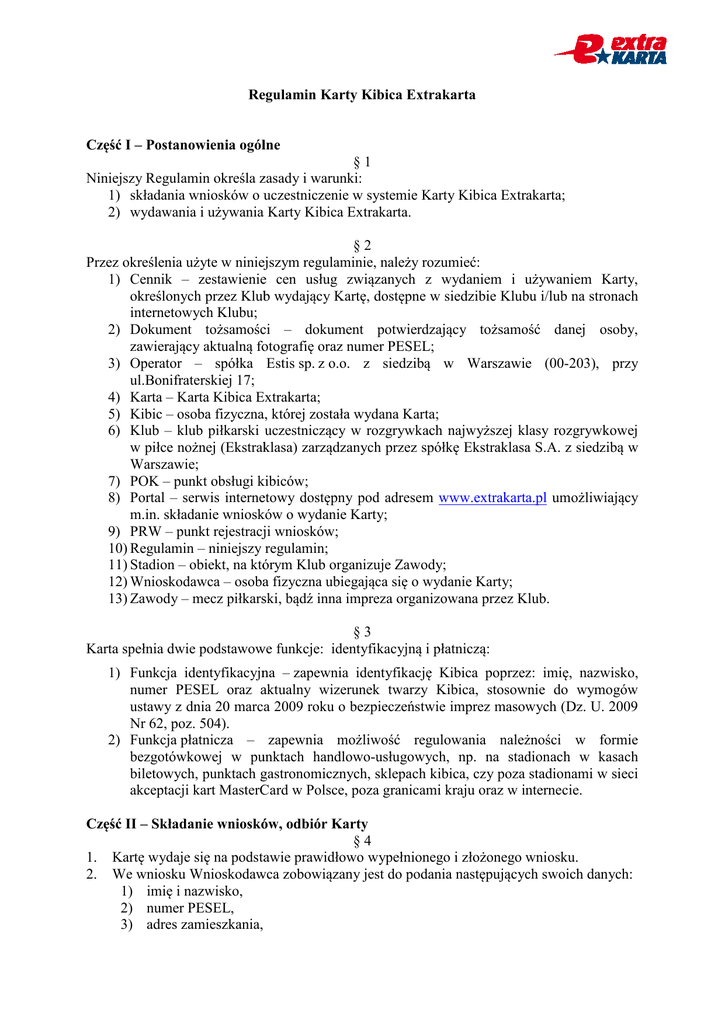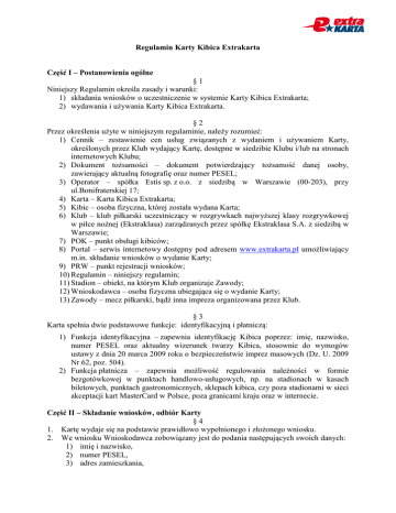 Regulamin Karty Kibica Extrakarta Część I – Postanowienia ogólne §1 Niniejszy Regulamin określa zasady i warunki warunki: 1) składania wniosków o uczestniczenie w sy systemie stemie Karty Kibica Extrakarta; Extrakarta 2) wydawania i używania żywania Karty Kibica Extrakarta. §2 Przez określenia użyte w niniejszym regulaminie, należy rozumieć: 1) Cennik – zestawienie cen usług związanych z wydaniem i używaniem Karty, Karty określonych przez Klub wydający Kartę, dostępne w siedzibie Klubu i/lub na stronach internetowych Klubu; 2) Dokument tożsamości amości – dokument potwierdzający tożsamość danej dane osoby, zawierający aktualną fotografię oraz numer PESEL; 3) Operator – spółka Estis sp. z o.o. z siedzibą w Warszawie (00-203), (00 przy ul.Bonifraterskiej 17; Extrakarta; 4) Karta – Karta Kibica Extrakarta 5) Kibic – osoba fizyczna, na, której została wydana Karta; 6) Klub – klub piłkarski uczestniczący w rozgrywkach najwyższej klasy rozgrywkowej w piłce nożnej (Ekstraklasa) zarządzanych przez spółkę Ekstraklasa S.A. z siedzibą w Warszawie; 7) POK – punkt unkt obsługi kibiców kibiców; 8) Portal – serwis internetowy ternetowy dostępny pod adresem www.extrakarta.pl umożliwiający m.in. składanie wniosków o wydanie Karty; 9) PRW – punkt unkt rejestracji wniosków; 10) Regulamin – niniejszy regulamin; 11) Stadion – obiekt, na którym Klub organizuje Zawody; 12) Wnioskodawca – osoba fizyczna ubiegająca się o wydanie Kar Karty; 13) Zawody – mecz piłkarski, bądź inn inna impreza organizowana przez Klub. Klub §3 Karta spełnia dwie podstawowe funkcje: identyfikacyjną i płatniczą: 1) Funkcja identyfikacyjna – zapewnia identyfikację Kibica poprzez: imię, nazwisko, numer PESEL oraz aktualny wizerunek twarzy Kibica,, stosownie do wymogów ustawy z dnia 20 marca 2009 roku o bezpieczeństwie imprez masowych (Dz. U. 2009 Nr 62, poz. 504). 2) Funkcja płatnicza – zapewnia możliwość żliwość regulowania należności w formie bezgotówkowej w punktach handlowo handlowo-usługowych, usługowych, np. na stadionach w kasach biletowych, punktach unktach gastronomicznych, sklepach kibica, czy poza stadionami stadi w sieci akceptacji kart MasterC MasterCard w Polsce, poza granicami kraju oraz w internecie. Część II – Składanie wniosków, odbiór Karty §4 1. Kartę wydaje się na podstawie prawidłowo wypełnionego i złożonego wniosku. 2. We wniosku Wnioskodawca zobowiązany jest do podania następujących swoich danych: 1) imię i nazwisko, 2) numer PESEL, 3) adres zamieszkania, 4) numer telefonu komórkowego, 5) adres poczty elektronicznej. W przypadku nie posiadania przez Kibica adresu poczty elektronicznej, dopuszcza się przyjęcie wniosku bez tej informacji. 3. Wnioskodawca składa wniosek za pośrednictwem Portalu, POK lub PRW. 4. Wniosek o wydanie Karty dla osoby pomiędzy 13 a 18 rokiem życia wymaga zgody przedstawiciela ustawowego. 5. Wniosek o wydanie Karty, która będzie używana przez osobę poniżej 13 roku życia składa we własnym imieniu przedstawiciel ustawowy tej osoby. §5 1. Operator i Klub zastrzegają sobie prawo odmowy wydania Karty bez podania przyczyny. 2. Operator i Klub odmawia wydania Karty: 1) jeżeli Wnioskodawca odmówi wyrażenia zgody na przetwarzanie jego danych osobowych zawartych we wniosku, a niezbędnych do zapewnienia pełnej funkcjonalności Karty, 2) jeżeli posiądzie informacje, iż wobec Wnioskodawcy zastosowany został środek karny polegający na zakazie wstępu na imprezę masową (zakaz stadionowy), 3) osobie wobec której Klub wydał zakaz klubowy, polegający na zakazie uczestniczenia w imprezach masowych (zakaz klubowy), 4) osobom, którym Karta została już wydana. §6 Za wydanie Karty Klub pobiera opłatę w wysokości określonej w Cenniku. 1. 2. 3. 4. §7 Kartę Kibic odbiera osobiście w POK lub PRW z zastrzeżeniem ust. 4. Wydanie Karty Kibicowi uzależnione jest od przedstawienia przez Kibica Dokumentu tożsamości oraz dokonania pozytywnej weryfikacji danych podanych we wniosku z danymi widniejącymi na Dokumencie tożsamości. Karty osób poniżej 18 roku życia wydaje się wyłącznie ich przedstawicielom ustawowym. W przypadku, gdy Wnioskodawca złożył wniosek osobiście w POK lub PRW i w trakcie składania wniosku została przeprowadzona weryfikacja danych podanych we wniosku z Dokumentem tożsamości, Operator lub Klub na wniosek Kibica może wysyłać Kartę na adres Kibica podany we wniosku. Za przesłanie Karty Klub pobiera opłatę zgodnie z Cennikiem. §8 Kibic zobowiązany jest zweryfikować dane zawarte na Karcie niezwłocznie po jej otrzymaniu. Reklamacje składane po odebraniu Karty dotyczące danych uwidocznionych na Karcie nie będą uwzględniane, chyba że Karta została przesłana do Kibica w trybie, o którym mowa w § 7 ust. 4 Regulaminu. Część III – Używanie Karty §9 1. Karta jest kartą imienną, identyfikującą wyłącznie osobę, której została wydana, a także określającą tą osobę jako kibica jednego Klubu. 2. Jeden Kibic może posiadać wyłącznie jedną Kartę. 3. Zakazane jest dokonywania jakichkolwiek zmian na Karcie, w szczególności przerabiania danych na niej uwidocznionych. 4. W przypadku ustalenia, iż: 1) dana osoba posługuje się nie swoją Kartą, Operator lub Klub mają prawo zatrzymać Kartę i ją unieważnić, 2) Kibic posiada dwie Karty, Karta wydana później podlega unieważnieniu, 3) Kibic posługuje się Kartą przerobioną, bądź w jakikolwiek sposób zmodyfikowaną, Operator lub Klub zatrzymuje Kartę i ją unieważnia. 5. W sytuacjach, o których mowa w ust. 4 powyżej, Operator i Klub nie są zobowiązane do zwrotu jakichkolwiek kosztów poniesionych przez Kibica w związku z wydaniem Karty, ani innych kosztów. § 10 Karta zachowuje ważność przez okres wskazany na Karcie. § 11 Kibic w każdym czasie może unieważnić Kartę oraz wymienić Kartę na nową za opłatą o