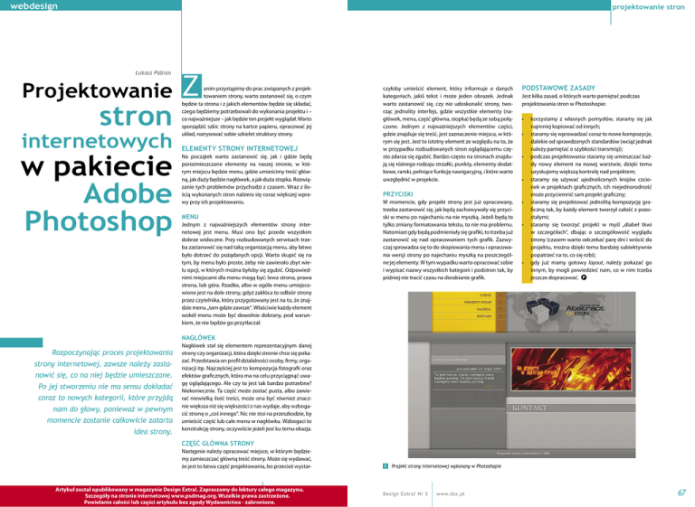 webdesign projektowanie stron Łukasz Pabian Projektowanie stron internetowych w pakiecie Adobe Photoshop Z anim przystąpimy do prac związanych z projektowaniem strony, warto zastanowić się, o czym będzie ta strona i z jakich elementów będzie się składać, czego będziemy potrzebowali do wykonania projektu i – co najważniejsze – jak będzie ten projekt wyglądał. Warto sporządzić szkic strony na kartce papieru, opracować jej układ, rozrysować sobie szkielet struktury strony. ELEMENTY STRONY INTERNETOWEJ Na początek warto zastanowić się, jak i gdzie będą porozmieszczane elementy na naszej stronie, w którym miejscu będzie menu, gdzie umieścimy treść główną, jak duży będzie nagłówek, a jak duża stopka. Rozwiązanie tych problemów przychodzi z czasem. Wraz z ilością wykonanych stron nabiera się coraz większej wprawy przy ich projektowaniu. MENU Jednym z najważniejszych elementów strony internetowej jest menu. Musi ono być przede wszystkim dobrze widoczne. Przy rozbudowanych serwisach trzeba zastanowić się nad taką organizacją menu, aby łatwo było dotrzeć do pożądanych opcji. Warto skupić się na tym, by menu było proste, żeby nie zawierało zbyt wielu opcji, w których można byłoby się zgubić. Odpowiednimi miejscami dla menu mogą być: lewa strona, prawa strona, lub góra. Rzadko, albo w ogóle menu umiejscowione jest na dole strony, gdyż zakłóca to odbiór strony przez czytelnika, który przygotowany jest na to, że znajdzie menu „tam gdzie zawsze”. Właściwie każdy element wokół menu może być dowolnie dobrany, pod warunkiem, że nie będzie go przytłaczał. czyłoby umieścić element, który informuje o danych kategoriach, jakiś tekst i może jeden obrazek. Jednak warto zastanowić się, czy nie udoskonalić strony, tworząc jednolity interfejs, gdzie wszystkie elementy (nagłówek, menu, część główna, stopka) będą ze sobą połączone. Jednym z najważniejszych elementów części, gdzie znajduje się treść, jest zaznaczenie miejsca, w którym się jest. Jest to istotny element ze względu na to, że w przypadku rozbudowanych stron oglądającemu często zdarza się zgubić. Bardzo często na stronach znajdują się różnego rodzaju strzałki, punkty, elementy dodatkowe, ramki, pełniące funkcję nawigacyjną, i które warto uwzględnić w projekcie. PODSTAWOWE ZASADY Jest kilka zasad, o których warto pamiętać podczas projektowania stron w Photoshopie: • • • • PRZYCISKI W momencie, gdy projekt strony jest już opracowany, trzeba zastanowić się, jak będą zachowywały się przyciski w menu po najechaniu na nie myszką. Jeżeli będą to tylko zmiany formatowania tekstu, to nie ma problemu. Natomiast gdy będą podmieniały się grafiki, to trzeba już zastanowić się nad opracowaniem tych grafik. Zazwyczaj sprowadza się to do skopiowania menu i opracowania wersji strony po najechaniu myszką na poszczególne jej elementy. W tym wypadku warto opracować sobie i wypisać nazwy wszystkich kategorii i podstron tak, by później nie tracić czasu na dorabianie grafik. • • • korzystamy z własnych pomysłów, staramy się jak najmniej kopiować od innych; staramy się wprowadzać coraz to nowe kompozycje, dalekie od sprawdzonych standardów (wciąż jednak należy pamiętać o szybkości transmisji); podczas projektowania staramy się umieszczać każdy nowy element na nowej warstwie, dzięki temu uzyskujemy większą kontrolę nad projektem; staramy się używać ujednoliconych krojów czcionek w projektach graficznych, ich niejednorodność może przyciemnić sam projekt graficzny; staramy się projektować jednolitą kompozycję graficzną tak, by każdy element tworzył całość z pozostałymi; staramy się tworzyć projekt w myśl „diabeł tkwi w szczegółach”, dbając o szczegółowość wyglądu strony (czasem warto odczekać parę dni i wrócić do projektu, można dzięki temu bardziej subiektywnie popatrzeć na to, co się robi); gdy już mamy gotowy layout, należy pokazać go innym, by mogli powiedzieć nam, co w nim trzeba jeszcze dopracować. NAGŁÓWEK Rozpoczynając proces projektowania strony internetowej, zawsze należy zastanowić się, co na niej będzie umieszczane. Po jej stworzeniu nie ma sensu dokładać coraz to nowych kategorii, które przyjdą nam do głowy, ponieważ w pewnym momencie zostanie całkowicie zatarta idea strony. Nagłówek stał się elementem reprezentacyjnym danej strony czy organizacji, która dzięki stronie chce się pokazać. Przedstawia on profil działalności osoby, firmy, organizacji itp. Najczęściej jest to kompozycja fotografii oraz efektów graficznych, która ma na celu przyciągnąć uwagę oglądającego. Ale czy to jest tak bardzo potrzebne? Niekoniecznie. Ta część może zostać pusta, albo zawierać niewielką ilość treści, może ona być również znacznie większa niż się większości z nas wydaje, aby wzbogacić stronę o „coś innego”. Nic nie stoi na przeszkodzie, by umieścić część lub całe menu w nagłówku. Wzbogaci to konstrukcję strony, oczywiście jeżeli jest ku temu okazja. CZĘŚĆ GŁÓWNA STRONY Następnie należy opracować miejsce, w którym będziemy zamieszczać główną treść strony. Może się wydawać, że jest to łatwa część projektowania, bo przecież wystar- 66 Artykuł został opublikowany w magazynie Design Extra!. Zapraszamy do lektury całego magazynu. www.dsx.pl Design Extra! Nr 5 Szczegóły na stronie internetowej www.psdmag.org. Wszelkie prawa zastrzeżone. Powielanie całości lub części artykułu bez zgody Wydawnictwa - zabronione. 1 Projekt strony internetowej wykonany w Photoshopie Design Extra! Nr 5 www.dsx.pl 67 webdesign Krok 1 projektowanie stron Przygotowujemy tło Tworzymy nowy obrazek Plik–>Nowy (ang. File–>New) lub [Ctrl]+[N]. Ustawiamy rozmiary obrazka: długość 780, szerokość 800. Wypełniamy obrazek gradientem [G] (jeżeli mamy ustawion