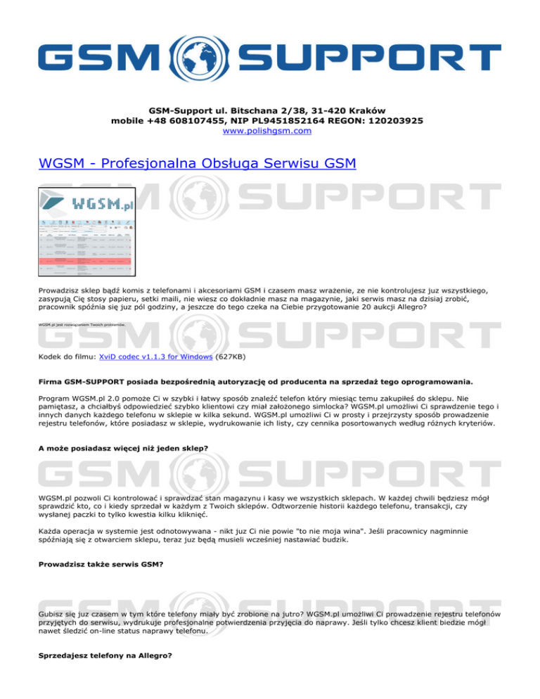 GSM-Support ul. Bitschana 2/38, 31-420 Kraków mobile +48 608107455, NIP PL9451852164 REGON: 120203925 www.polishgsm.com WGSM - Profesjonalna Obsługa Serwisu GSM Prowadzisz sklep bądź komis z telefonami i akcesoriami GSM i czasem masz wrażenie, ze nie kontrolujesz juz wszystkiego, zasypują Cię stosy papieru, setki maili, nie wiesz co dokładnie masz na magazynie, jaki serwis masz na dzisiaj zrobić, pracownik spóźnia się juz pól godziny, a jeszcze do tego czeka na Ciebie przygotowanie 20 aukcji Allegro? WGSM.pl jest rozwiązaniem Twoich problemów. Kodek do filmu: XviD codec v1.1.3 for Windows (627KB) Firma GSM-SUPPORT posiada bezpośrednią autoryzację od producenta na sprzedaż tego oprogramowania. Program WGSM.pl 2.0 pomoże Ci w szybki i łatwy sposób znaleźć telefon który miesiąc temu zakupiłeś do sklepu. Nie pamiętasz, a chciałbyś odpowiedzieć szybko klientowi czy miał założonego simlocka? WGSM.pl umożliwi Ci sprawdzenie tego i innych danych każdego telefonu w sklepie w kilka sekund. WGSM.pl umożliwi Ci w prosty i przejrzysty sposób prowadzenie rejestru telefonów, które posiadasz w sklepie, wydrukowanie ich listy, czy cennika posortowanych według różnych kryteriów. A może posiadasz więcej niż jeden sklep? WGSM.pl pozwoli Ci kontrolować i sprawdzać stan magazynu i kasy we wszystkich sklepach. W każdej chwili będziesz mógł sprawdzić kto, co i kiedy sprzedał w każdym z Twoich sklepów. Odtworzenie historii każdego telefonu, transakcji, czy wysłanej paczki to tylko kwestia kilku kliknięć. Każda operacja w systemie jest odnotowywana - nikt juz Ci nie powie "to nie moja wina". Jeśli pracownicy nagminnie spóźniają się z otwarciem sklepu, teraz juz będą musieli wcześniej nastawiać budzik. Prowadzisz także serwis GSM? Gubisz się juz czasem w tym które telefony miały być zrobione na jutro? WGSM.pl umożliwi Ci prowadzenie rejestru telefonów przyjętych do serwisu, wydrukuje profesjonalne potwierdzenia przyjęcia do naprawy. Jeśli tylko chcesz klient biedzie mógł nawet śledzić on-line status naprawy telefonu. Sprzedajesz telefony na Allegro? WGSM.pl udostępnia kompleksowa obsługę Allegro. Za pomocą WGSM.pl będziesz mógł prowadzić rejestr każdej transakcji oraz wysłanej paczki. Samo dopisanie nowej transakcji do systemu nie wymaga od Ciebie nawet jednego kliknięcia myszą, wszystko system zrobi za Ciebie automatycznie. Tworzenie dziesiątek czy setek aukcji spędziło juz niejednemu Allegrowiczowi sen z powiek. WGSM.pl używając jednego z naszych szablonów wygeneruje dla Ciebie automatycznie aukcje dla każdego telefonu razem ze zdjęciami. Zajmie Ci to czas potrzebny na jedno klikniecie myszą. Jeśli posiadasz juz swój szablon, który doskonale rozpoznają Twoi klienci to dostosowanie go do współpracy z WGSM.pl zajmie Ci kilka minut i nigdy więcej nie będziesz musiał go ręcznie zmieniać i przystosowywać do nowej aukcji. Zapewne masz juz również dosyć odpisywania na e-maile i odbierania co 5 minut telefonów z pytaniami typu: - "Czy paczka została juz wysłana?" "Kiedy wyśle pan paczkę?" "Czy mogę prosić numer nadania paczki?" "Proszę o zmianę adresu wysyłki" "Czy mogę prosić o wysyłkę za pobraniem?" WGSM.pl udostępnia doskonały panel komunikacyjny dla użytkowników za pomocą, którego każdy z nich po wygranej aukcji będzie mógł ustawić wygodny dla siebie rodzaj przesyłki, adres wysyłki czy status jego zamówienia. Przy każdej zmianie statusu paczki klient otrzyma nawet e-maila informującego co się aktualnie dzieje z jego zakupem. Klient na pewno będzie zadowolony, ze cały czas interesujesz się jego zamówieniem i informujesz go na bieżąco na jakim etapie jest jego realizacja. WGSM.pl ulży Ci również w samej podróży na poczęte z paczkami - sam wygeneruje uzupełniona książkę nadawcza czy tez kwity potrzebne do nadania paczek. Myślałeś może o tym by dotrzeć do jeszcze większej ilości klientów i otworzyć sklep internetowy? Juz nie musisz się nad tym zastanawiać, WGSM.pl jest systemem, który posiada juz wbudowany moduł sklepu internetowego. Każdy towar, który posiadasz w sklepie możesz jednocześnie wystawić do sprzedaży poprzez Internet. WGSM.pl pomoże Ci także i ułatwi obsługę zamówień oraz wysyłanie paczek. Nie będziesz musiał rejestrować swojej domeny, otrzymasz ja od nas w postaci: xxx.wgsm.pl / xxx.kgsm.pl / xxx.tgsm.pl Niewątpliwą zaleta systemu jest to, ze możesz mięć do niego dostęp 24h/dobę. Nawet jeśli nie masz komputera przy sobie możesz sprawdzić co dzieje się w Twoim sklepie za pomocą telefonu komórkowego z dostępem do Internetu. Wszędzie tam gdzie masz dostęp do Internetu masz tam swój program. A wszystko to bardzo dobrze zabezpieczone i nikt niepowołany nie będzie miał dostępu do danych Twojego sklepu. Wszystkie wspomniane powyżej funkcje, jak i wiele innych, dostępne są z poziomu jednego programu, są ze sobą ściśle powiązane co bardzo ułatwia prace i uwalnia Cię od korzystania wielu programów do prowadzenia sklepu. Gdzie są przechowywane dane ? Wszystkie dane są przechowywane na serwerze producenta (maszyna fizycznie znajduje się w Austrii w profesjonalnej serwerowi) co GWARANTUJE bezpieczeństwo danych. Baza SQL jest archiwizowana co 24h miesiąc wstecz. Co eliminuje problemy wynikające np. z uszkodzenia lub utraty dysku w własnym komputerze. Wgląd w wszystkie dane ma tylko i wyłącznie ich właściciel i producent nigdy i nikomu ich nie udostępni ! Producent zobowiązuje się do ochrony danych osobowych zgodnie z ustawa z dnia 29 sierpnia 1997 r. "O ochronie danych osobowych". Więcej informacji na temat bezpieczeństwa danych w pkt. 7 RAGULAMINU WGSM.pl 2.0 w skrócie: - prowadzenie rejestru sprzedaży w sklepie - praca wielostanowiskowa - obsługą wielu sklepów i pracowników - praca on-line - wszędzie gdzie jest Internet tam jest Twój program - pełna kontrola pracown