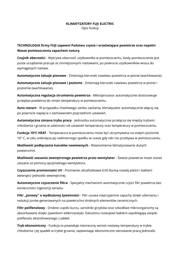 KLIMATYZATORY FUJI ELECTRIC Opis funkcji TECHNOLOGIA firmy FUJI zapewni Państwu czyste i orzeźwiające powietrze oraz napełni Wasze pomieszczenia zapachem natury. Czujnik obecności - Wykrywa obecność użytkownika w pomieszczeniu, kiedy pomieszczenie jest puste urządzenie pracuje ze zmniejszonymi nastawami, po powrocie użytkowników wraca do wymaganych nastaw. Automatyczne żaluzje pionowe - Zmieniają kierunek nawiewu powietrza w pionie (wachlowanie). Automatyczne żaluzje pionowe i poziome - Zmieniają kierunek nawiewu powietrza w pionie i poziomie (wachlowanie). Automatyczna regulacja strumienia powietrza - Mikroprocesor automatycznie dostosowuje przepływ powietrza do zmian temperatury w pomieszczeniu. Auto restart - W przypadku chwilowego zaniku zasilania, klimatyzator automatycznie włączy się po powrocie napięcia z zachowaniem poprzednich ustawień. Automatyczna zmiana trybu pracy - Jednostka automatycznie przełącza się między trybami chłodzenia i grzania w zależności od ustawień temperatury oraz temperatury w pomieszczeniu. Funkcja 10°C HEAT - Temperatura w pomieszczeniu może być utrzymywana na stałym poziomie 10° C, w celu uniknięcia jej nadmiernego spadku w czasie gdy nikt nie przebywa w pomieszczeniu. Możliwość podłączenia kanałów nawiewnych - Równomierne klimatyzowanie dużych powierzchni. Możliwość zassania zewnętrznego powietrza przez wentylator - Świeże powietrze może zostać zassane za pomocą opcjonalnego wentylatora. Czyszczenie promieniami UV - Promienie ultrafioletowe (UV) tłumią rozwój pleśni i bakterii wewnątrz jednostki wewnętrznej. Automatyczne czyszczenie filtra - Specjalny mechanizm automatycznie czyści filtr powietrza bez konieczności ingerencji serwisu Filtr „jonowy” o wydłużonej żywotności - Filtr usuwa nieprzyjemne zapachy dzięki utlenianiu i redukcji jonów generowanych na powierzchni drobnych elementów ceramicznych. Filtr polifenolowy - Drobne cząstki kurzu, zarodniki grzybów oraz szkodliwe mikroorganizmy są absorbowane dzięki zjawiskom elektrostatyki. Dalszemu rozwojowi bakterii zapobiegają związki polifenolu ekstrahowanego z jabłek. Tryb ekonomiczny - Funkcja ta powoduje nieznaczny wzrost nastawy temperatury w trybie chłodzenia i jej spadek w trybie grzania, zapewniając ekonomiczne sterowanie pracą jednostki. Pełna moc grzanie - Praca z pełną mocą wentylatora i z pełną mocą sprężarki pozawala na szybie osiągnięcie temperatur zadanych w pomieszczeniu. Program nocny - Mikroprocesor stopniowo zmienia temperaturę w pomieszczeniu zapewniając komfortowy sen. Cicha praca - Praca jednostki zewnętrznej w trybie wyciszonym (dostępna w sterownikach bezprzewodowych). Programator - Programator pozwala na ustawienie czterech cyklów pracy: włącz, wyłącz, włączwyłącz, wyłącz-włącz. Programator tygodniowy - Ustawianie różnych czasów pracy dla każdego dnia tygodnia. Programator tygodniowy + programowanie temperatury - Opcja umożliwia ustawianie temperatury dla dwóch przedziałów czasu dla każdego dnia tygodnia. Kontrolka filtra - Dioda sygnalizuje konieczność przeprowadzenia czyszczenia filtra. Osuszanie wymiennika - Osuszanie jednostki wewnętrznej zapobiega rozwojowi pleśni i bakterii. Zmywalny panel obudowy - Możliwość zdemontowania obudowy w celu umycia. Modele z układem sterowania V-PAM - Zwiększa zakres regulacji sprężarki. Modele z układem sterowania i-PAM - Podnosi wydajność sprężarki w momencie startu. Typ Multi – system symultaniczny - Możliwość podłączenia 2 lub 3 jednostek wewnętrznych do jednej jednostki zewnętrznej.