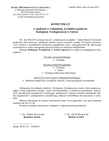 KURIA METROPOLITALNA GDAŃSKA Gdańsk Oliwa, dnia 26 maja 2014 ul. Biskupa Edmunda Nowickiego 1 80-330 Gdańsk Oliwa tel. (58) 552-00-51; fax. (58) 552-27-75 e-mail: [email protected] KOMUNIKAT o studiach w Gdańskim Archidiecezjalnym Kolegium Teologicznym w Gdyni Św. Jan Paweł II zachęcał nas do „wypłynięcia na głębię”. Także Papież Franciszek podkreśla, jak ważne jest „spotkanie między wiarą, rozumem i nauką” (Evangelii gaudium, 132). Jednym z niezbędnych elementów pogłębienia wiary i przygotowania do aktywnego uczestnictwa w misji ewangelizacyjnej Kościoła jest formacja intelektualna. Dlatego Kolegium Teologiczne w Gdyni zaprasza na studia na następujących kierunkach: STUDIA MAGISTERSKIE • Teologia STUDIA PODYPLOMOWE • Teologia • Etyka • Teologia praktyczna (dla księży) INSTYTUT KULTURY CHRZEŚCIJAŃSKIEJ • Studium teologii dla wszystkich, których „wiara poszukuje zrozumienia” Zachęcamy do podjęcia studiów w Kolegium Teologicznym osoby, które pragną pogłębić swoją znajomość teologii i etyki chrześcijańskiej, a zwłaszcza katechetów, nauczycieli, instruktorów poradnictwa rodzinnego, animatorów i liderów ruchów katolickich. Studia magisterskie i podyplomowe umożliwiają zdobycie kwalifikacji do nauczania w szkołach. Bliższe informacje na stronie internetowej http://www.gakt.info/ oraz pod numerem telefonu 58/ 661 22 30. Prosimy o podanie informacji o studiach w ogłoszeniach parafialnych. /-/ Ks. Stefan Pasternak Kanclerz Kurii ---------------------Znak: III D 2 a – 44/2014 /-/ Ks. Jacek Bramorski Rektor GAKT