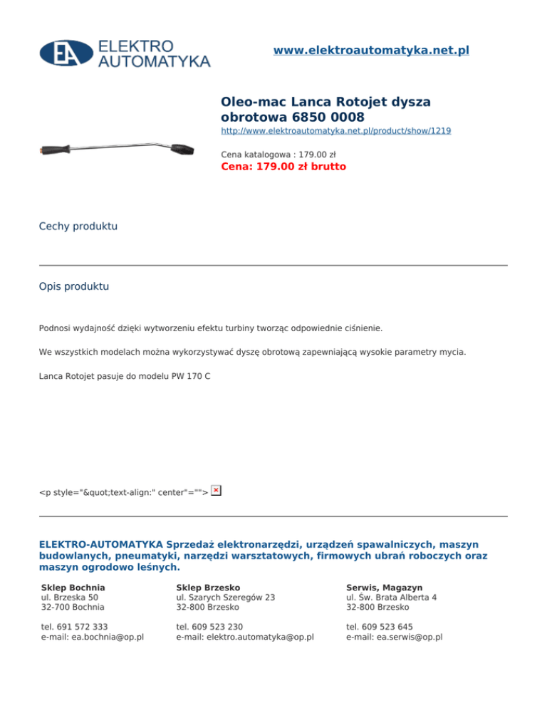 www.elektroautomatyka.net.pl Oleo-mac Lanca Rotojet dysza obrotowa 6850 0008 http://www.elektroautomatyka.net.pl/product/show/1219 Cena katalogowa : 179.00 zł Cena: 179.00 zł brutto Cechy produktu Opis produktu Podnosi wydajność dzięki wytworzeniu efektu turbiny tworząc odpowiednie ciśnienie. We wszystkich modelach można wykorzystywać dyszę obrotową zapewniającą wysokie parametry mycia. Lanca Rotojet pasuje do modelu PW 170 C <p style=""text-align:" center"=""> ELEKTRO-AUTOMATYKA Sprzedaż elektronarzędzi, urządzeń spawalniczych, maszyn budowlanych, pneumatyki, narzędzi warsztatowych, firmowych ubrań roboczych oraz maszyn ogrodowo leśnych. Sklep Bochnia ul. Brzeska 50 32-700 Bochnia Sklep Brzesko ul. Szarych Szeregów 23 32-800 Brzesko Serwis, Magazyn ul. Św. Brata Alberta 4 32-800 Brzesko tel. 691 572 333 e-mail: [email protected] tel. 609 523 230 e-mail: [email protected] tel. 609 523 645 e-mail: [email protected]