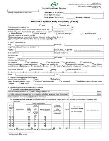 Załącznik nr 8 do Instrukcji funkcjonowania i obsługi kart płatniczych w zrzeszonych Bankach Spółdzielczych i SGB-Bank S.A. SGB-Bank S.A. Oddział Stempel nagłówkowy placówki banku / Bank Spółdzielczy w Data wpływu (dd-mm-rrrr): Numer w rejestrze: Wniosek o wydanie karty kredytowej głównej Visa MasterCard Wnioskowana kwota kredytu zł Rezygnuję z karty, jeśli przyznany limit będzie niższy niż zl Preferowany dzień zakończenia cyklu rozliczeniowego (dzień rozliczeniowy): 1 dzień miesiąca 7 dzień miesiąca 14 dzień miesiąca Proszę o ustalenie dziennych limitów: obowiązujących w banku: limit dzienny operacji: wypłat gotówki 2.000 zł, określonych indywidualnie: limit dzienny operacji wypłat gotówki: 1. Dane wnioskodawcy imię: 21 dzień miesiąca zł nazwisko: imię i nazwisko nadrukowane na karcie1 PESEL: rodzaj, seria i nr dowodu |_ _| |_ _|_ _|_ _|_ _|_ _|_ _|_ _|_ _|_ _| data urodzenia: miejsce urodzenia: D- dowód osobisty, P- Paszport obywatelstwo imię ojca: imię matki nazwisko panieńskie matki stan cywilny panna/kawaler zamężna/żonaty rozwiedziona/ny nie dotyczy stosunki majątkowe między małżonkami: wspólnota majątkowa rozdzielność majątkowa nie dotyczy wykształcenie: podstawowe gimnazjalne zawodowe średnie/ pomaturalne inżynier/ licencjat wyższe inne Posiadane rachunki: a’vista walutowe lokaty konto osobiste, nr: |_ _|_ _| |_ _|_ _|_ _|_ _| |_ _|_ _|_ _|_ _| |_ _|_ _|_ _|_ _| |_ _|_ _|_ _|_ _| |_ _|_ _|_ _|_ _| |_ _|_ _|_ _|_ _| Bank , od 2. Status mieszkaniowy wnioskodawcy typ zajmowanego lokalu: dom mieszkanie prawo do zajmowanego lokalu: własność/współwłasność z rodzicami najem inne (jakie?): spółdzielcze własnościowe prawo 3. Aktualne zadłużenie i miesięczne obciążenia: 1) wydatki gospodarstwa domowego wydatki miesięczne z tytułu czynszu, energii, telefonu, itp. PLN wydatki miesięczne związane z utrzymaniem członków gospodarstwa domowego PLN liczba osób we wspólnym gospodarstwie domowym 2) zobowiązania finansowe (prosimy umieścić zobowiązania i poręczenia niefinansujące działalności gospodarczej / rolniczej). Rodzaj zobowiązania Rodzaj zobowią -zania * Z Nazwa Banku P Kredyt konsu mpcyj ny Limit kredytow y (karta kredytow a, konto /ROR) debet Kredyt / pożyczka zabezp. hipoteką Wysokość aktualnego zobowiązania / kwota przyznanego limitu w walucie zobowiązania * wpisać „Z” w przypadku zobowiązania lub „P” w przypadku poręczenia 1 Maksymalnie 21 znaków Waluta Miesięczne zobowiązanie w PLN Data zawarcia umowy nie dotyczy limitów 3) inne stałe zobowiązania Rodzaj zobowiązania Wysokość aktualnego zobowiązania w walucie zobowiązania Waluta zobowiązania Miesięczne zobowiązanie w PLN z tytułu wyroków sądowych świadczenia alimentacyjne zobowiązania podatkowe ubezpieczenia inne (jakie?) ……………………… 4) ubiegam się o kredyt/ pożyczkę w innym banku: nie tak podać nazwę banku i adres oddziału 4. Dane teleadresowe wnioskodawcy adres zameldowania/zamieszkania: kod pocztowy/poczta adres do korespondencji: nr telefonu: kod pocztowy/poczta e-mail 5. Oświadczenia Deklaracja wnioskodawcy: Oświadczam, że moja kondycja finansowa jest / nie jest* uzależniona pośrednio lub bezpośrednio od powiązania z członkiem organu banku (Zarządu Banku, Rady Nadzorczej Banku) lub osobą zajmującą stanowisko kierownicze w banku (pracownik banku podlegający bezpośrednio członkom Zarządu Banku oraz dyrektorzy oddziałów banku, ich zastępcy i główni księgowi). Rodzaj powiązania ………. SGB-Bank S.A./ Bank Spółdzielczy w ………. adres ……2 (dalej bank) zgodnie z art. 24 ust. 1 Ustawy z dnia 29 sierpnia 1997 r. o ochronie danych osobowych (j. t. Dz. U. z 2002 r., nr 101, poz. 926 z późn. zm.) informuje, iż jest administratorem podanych przez Pana/Panią danych osobowych. Dane będą przetwarzane przez bank w celu oceny zdolności kredytowej oraz analizy ryzyka kredytowego, zawierania i wykonywania czynności bankowych, a także w celu promocji i marketingu działalności prowadzonej przez bank. Na podstawie art. 32 ustawy o ochronie danych osobowych ma Pan/Pani prawo do dostępu do treści oraz poprawiania swoich danych, w szczególności ich uaktualnienia, sprostowania, poprawienia. Podanie danych jest dobrowolne, jednakże ich podanie warunkuje wykonanie czynności bankowych. Bank informuje, iż: 1) na podstawie art. 105 ust. 4 Ustawy z dnia 29 sierpnia 1997 r. Prawo bankowe (Dz. U. z 2002 r. nr 72, poz. 665 z późn. zm.) podane przez Pana/Panią dane bank będzie przekazywał do Biura Informacji Kredytowej S.A. z siedzibą w Warszawie – Biuro Obsługi Klienta przy ul. Postępu 17A, 02-676 Warszawa (dalej BIK) 2) Pana/Pani dane osobowe mogą być udostępnianie przez bank bankom oraz instytucjom wymienionym w art. 105 ustawy Prawo bankowe, w zakresie tam określonym oraz biurom informacji gospodarczych, w tym Krajowemu Rejestrowi Długów Biura Informacji Gospodarczej S.A. z siedzibą we Wrocławiu oraz InfoMonitorowi Biura Informacji Gospodarczej S.A. z siedzibą w Warszawie, a także do Systemu Bankowy Rejestr administrowanego przez Związek Banków Polskich z siedzibą w Warszawie. 3) Pana/Pani dane mogą być udostępniane SGB-Bankowi S.A. oraz bankom spółdzielczym zrzeszonym w Spółdzielczej Grupie Bankowej w celu prowadzenia działalności marketingowej, 4) Pana/Pani dane mogą być udostępniane przez bank innym wydawcom kart płatniczych i ich organizacjom w celu zapobiegania fałszerstwom i nadużyciom związanym z używaniem kart płatniczych. Bank oświadcza, iż dane zawarte we wniosku oraz w umowie o kartę są przeznaczone dla banku, jako wydawcy karty oraz dla organizacji obsługującej system akceptacji i rozliczania transakcji dokonywanych z użyciem kart płatniczych. Bank Spółdzielczy informuje, że przy obsłudze karty współpracuje z SGB-Bankiem S.A., z siedzibą w Poznaniu, ul. Szarych Szeregów 23a, jako wydaw