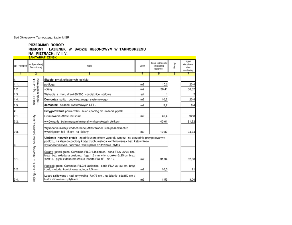 Sąd Okręgowy w Tarnobrzegu. Łazienki SR PRZEDMIAR ROBÓT: REMONT ŁAZIENEK W SĄDZIE REJONOWYM W TARNOBRZEGU NA PIĘTRACH: IV I V. Nr Specyfikacji Technicznej Opis Jedn Ilość jednostek ( na jedną łazienkę) Ilości docelowe: dwa sanitariaty 1 2 3 4 5 6 7 1. 1.1. 1.2. 1.3. 1.4. 1.5. SST-SR;Tbg – 451.1. – roboty rozbiórkowe, Lp / kod poz. Uwagi SANITARIAT ŻEŃSKI 2.2. 2.3. 3. 3.1. 3.2. 3.4. podłoga m2 10,2 20,4 ściany m2 30,41 60,82 Wykucie z muru drzwi 80/200 - ościeżnice stalowe szt 1 2 Demontaż sufitu podwieszanego systemowego. m2 10,2 20,4 demontaż ścianek systemowych LTT . m2 3,2 6,4 m2 46,4 92,8 40,61 81,22 12,37 24,74 Przygotowanie powierzchni ścian i podłóg do ułożenia płytek lusarka, 2.1. SST-SR;Tbg – 453.1. – okładziny ścian i posadzek, sufity 2. Skucie płytek układanych na kleju Gruntowanie Atlas Uni Grunt wyrównanie ścian masami mineralnymi po skutych płytkach Wykonanie izolacji wodochronnej Atlas Woder S na posadzkach z wywinięciem foli 15 cm na ściany m2 Ułożenie nowych płytek - zgodnie z projektem wystroju wnętrz - na uprzednio przygotowanym podłożu, na kleju do podłoży krytycznych, metoda kombinowana - bez kątowników wykończeniowych. Łaczenie winkli przez szlifowanie płytek Ściany : płytki gress Ceramika PILCH Jasienica, seria FILA 25*33 cm, brąz i beż układana poziomo, fuga 1,5 mm w tym: dekor 6x25 cm brąz ;szt118, płytki z dekorem 25x33 Inserto Fila 1R - szt.12, m2 31,34 62,68 Podłogi: gress Ceramika PILCH Jasienica, seria FILA 33*33 cm, brąz i beż, metoda kombinowana, fuga 1,5 mm . m2 10,5 21 Lustro szlifowane : nad umywalką 73x75 cm , na ścianie 66x150 cm ; lustra zlicowane z płytkami m2 1,53 3,06 SST-SR;Tbg – 453.1. – okładzin 5. 5.1. 5.2. 5.3. 5.4. 5.5. 6. 7. 8. 9. 10. 11. 12. SSTSST-SR:Tbg – 453.4 Malowanie, SST-SR:TbgSO:Tbg SST-SR;Tbg – 452.1. – stolarka i ślusarka, 452.2. – Ślusarka i stolarka, SST-SR:Tbg-452.1. 454,3 – podwieszane Instalacje – okładziny ścian i posadzek, sufity podwieszane. elektryczna 4. Demontaż urządzeń sanitarnych ( baterii ściennych szt.1zaworków misek ustępowych -szt 2, zaworów z wylewką do węża- szt1 ) , umywalek szt 1, misek ustępowaych - dolnopłuk szt.2) kpl 7 14 geberit firmy GROHE + miska ustępowa podwieszana FANTAZJA(KOŁO)+ deska sedesowa twarda - z wymianą zaworkow, przeróbką podejść i odpływów i obudową płytami G-K stelarzu kpl 2 4 umywalka NOVA/KOŁO symbol K 21160 z półpostumentem Nr 27100 KOŁO z syfonem gruszkowym PCV, kpl 1 2 bateria stojąca TALIS s/Hangsgrohe z kpl. zaworków i wężyków podłączeniowych kpl 1 2 zawór chromowany ze złaczką do węża kpl 1 2 kratka ściekowa chromowana szt 2 4 Szpachlowanie 1x ścian ( powyżej płytek) m2 10,14 20,28 Malowanie 2x ścian f. TIKKURILA kolory jasno beżowe m2 10,14 20,28 Malowanie 1 x f. emulsyjnymi powierzchni ścian i sufitu ponad sufitem podwieszanym m2 14,47 28,94 Malowanie 2x farbami akrylowymi do metalu grzejników żeliwnych (0,72 m2) i rur zasilających ( mb 6) kpl 1 2 dostawa i montaż ścianek systemowych LTT ( przegrody ubikacji). O wys: 210 cm i prześwicie pomiędzy ścianką a podłogą: 12 cm. Ścianki LTT Compact wykonane z wysokociśnieniowego laminatu (np. firmy Eltete Polska sp. z o.o.) , o konstrukcji z aluminium anodowanego. skrzydła drzwiowe 70/200 mb 3,5 7 Dostawa i mż sufitu podwieszanego ( d-ż istniejącego + mż AMSTRONG ze stelażem aluminium m2 10,2 20,4 Przeróbki instalacji elektrycznej ( oświetleniowa: oprawy Downlight/Plexiform DL 220014-szt 4, wyłączniki światła -szt 2, gniazd wtyczkowych szt. 2, kabl:e 3x1,5 mm; 14 mb, 3x2,5 mm2 mb;5), wentylator łazienkowy o120 mm.- szt.1. kpl 1 2 "Biały montaż" Wywóz gruzu na wysypisko – do 5 km 13. m3 0,98 1,96 Lp / kod poz. Nr Specyfikacji Technicznej Opis Jedn Ilość jednostek ( na jedną łazienkę) Uwagi SANITARIAT MĘSKI Ilości docelowe: dwa sanitariaty 1 2 3 4 5 6 7 Skucie płytek układanych na kleju 1.1. podłoga m2 10,44 20,88 1.2. ściany m2 32,1 64,2 1.3. Wykucie z muru drzwi 70/200 - ościeżnice stalowe szt 1 2 1.4. Demontaż sufitu podwieszanego systemowego. m2 10,44 20,88 1.5. demontaż ścianek systemowych LTT . m2 2,74 5,48 Gruntowanie Atlas Uni Grunt m2 40,47 80,94 wyrównanie masami mineralnymi po skutych płytkach m2 40,47 80,94 Wykonanie izolacji wodochronnej Atlas Woder S na posadzkach z wywinięciem foli 15 cm na ściany m2 13,89 27,78 2. 2.1. 2.2. 2.3. 3. 3.1. 3.2. SST-SO;Tbg – 451.1. – roboty rozbiórkowe, 1. Przygotowanie powierzchni ścian i podłóg do ułożenia płytek Ułożenie nowych płytek - zgodnie z projektem wystroju wnętrz - na uprzednio przygotowanym podłożu, na kleju do podłoży krytycznych, metoda kombinowana - bez kątowników wykończeniowych. Łaczenie winkli przez szlifowanie płytek Ściany : płytki gress Ceramika PILCH Jasienica, seria FILA 25*33 cm, brąz i beż układana poziomo, fuga 1,5 mm w tym: dekor 6x25 cm brąz ;szt.95, płytki z dekorem 25x33 Inserto Fila 1R - szt.12, mozaika 25*25 cm beż; szt. 16. m2 34,78 69,56 Podłogi: gress Ceramika PILCH Jasienica, seria FILA 33*33 cm, brąz i beż, metoda kombinowana, fuga 1,5 mm . m2 10,44 20,88 3.4. Lustro szlifowane : nad umywalką 66x75 cm , lustra zlicowane z płytkami m2 0,5 1 4. Demontaż urządzeń sanitarnych ( baterii ściennych szt.1zaworków misek ustępowych -szt 2, zaworów z wylewką do węża- szt1 ) , umywalek z syfonem szt 1, misek ustępowaych - dolnopłuk szt.2, pisuarów z syfonem szt.2) kpl 9 18 5.1. 5.2. 5.3. 5.5. SST-SO:Tbg 454,3 – Instalacje wod-kan. 5. 7. 8. 9. 10. 11. 12. 13. SST-SR:Tbg – 453.4 Malowanie, SST-SR:Tbg-452.2. – Ślusarka i stolarka, SST-SR:Tbg-452.1. – okładziny ścian i posadzek, sufity podwieszane. SST-SR:Tbg-454.3. – Instalacje wod-kan. 6. "Biały montaż" geberit firmy GROHE + miska ustępowa podwieszana FANTAZJA(KOŁO)+ deska sedesowa twarda - z wymianą zaworkow przeróbką podejść i odpływów i obudową płytami 