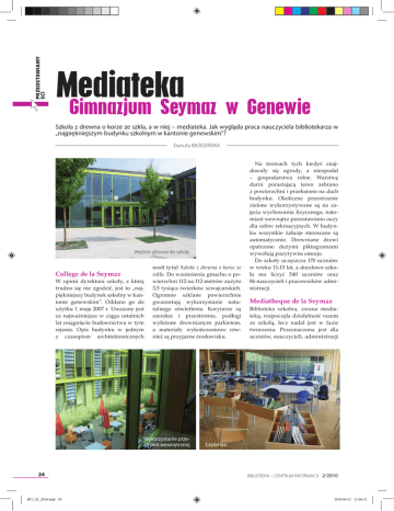 PRZEDSTAWIAMY SCI Mediateka Gimnazjum Seymaz w Genewie Szkoła z drewna o korze ze szkła, a w niej – mediateka. Jak wygląda praca nauczyciela bibliotekarza w „najpiękniejszym budynku szkolnym w kantonie genewskim”? Danuta BRZEZIŃSKA Wejście główne do szkoły. College de la Seymaz W opinii dyrektora szkoły, z którą trudno się nie zgodzić, jest to „najpiękniejszy budynek szkolny w kantonie genewskim”. Oddano go do użytku 1 maja 2007 r. Uważany jest za najważniejsze w ciągu ostatnich lat osiągnięcie budownictwa w tym rejonie. Opis budynku w jednym z czasopism architektonicznych nosił tytuł Szkoła z drewna o korze ze szkła. Do wzniesienia gmachu o powierzchni 112 na 112 metrów zużyto 3,5 tysiąca świerków szwajcarskich. Ogromne szklane powierzchnie gwarantują wykorzystanie naturalnego oświetlenia. Korytarze są szerokie i przestronne, podłogi wyłożone drewnianym parkietem, a materiały wykończeniowe również są przyjazne środowisku. Wykorzystanie przestrzeni wewnętrznej. 24 BCI_02_2010.indd 24 Na terenach tych kiedyś znajdowały się ogrody, a nieopodal – gospodarstwa rolne. Warstwę darni porastającą teren zebrano z powierzchni i przełożono na dach budynku. Okoliczne przestrzenie zielone wykorzystywane są na zajęcia wychowania fizycznego, natomiast wewnątrz pozostawiono oazy dla celów rekreacyjnych. W budynku wszystkie żaluzje sterowane są automatycznie. Drewniane drzwi opatrzone dużymi piktogramami wywołują pozytywne emocje. Do szkoły uczęszcza 170 uczniów w wieku 11-15 lat, a docelowo szkoła ma liczyć 540 uczniów oraz 86 nauczycieli i pracowników administracji. Mediatheque de la Seymaz Biblioteka szkolna, zwana mediateką, rozpoczęła działalność razem ze szkołą, lecz nadal jest w fazie tworzenia. Przeznaczona jest dla uczniów, nauczycieli, administracji Czytelnia. BIBLIOTEKA – CENTRUM INFORMACJI 2/2010 2010-04-21 11:06:12 PRZEDSTAWIAMY SCI Kolekcja czasopism. Wielofunkcyjne regały. i pracowników technicznych szkoły. Czynna jest od poniedziałku do piątku, choć w bardzo ograniczonym czasie. Zbiory dostosowane są do potrzeb wszystkich użytkowników – zawierają encyklopedie ogólne i specjalistyczne oraz oczywiście literaturę piękną, gromadzoną pod kątem rozwijania umiejętności i zainteresowania czytaniem, literaturę fachową dla nauczycieli oraz zbiory audiowizualne i multimedialne (płyty, kasety audio i wideo, płyty DVD i CD). Skatalogowanych jest blisko 6 tysięcy pozycji i prawie 4 tysiące dokumentów dźwiękowych. Docelowo planuje się zgromadzić około 13 tysięcy jednostek. Środki na uzupełnianie zbiorów pochodzą z budżetu szkoły. Czytelnicy mają też dostęp do internetu. Mediateka obejmuje dwie klasopracownie: czytelnię i salę do zajęć grupowych. Każda dysponuje 25 miejscami. Mogą się tam odbywać lekcje przedmiotowe. Sale są bardzo przestronne, jasne, wyposażone w funkcjonalne meble. Różnego rodzaju stoły, szafki, regały i lady ekspozycyjne umożliwiają przygotowanie ciekawych form propagowania czytelnictwa. Wypożyczenia dla uczniów i nauczycieli realizowane są na zasadzie zamówień na okres do 28 dni. Okres ten może zostać wydłużony. Informacje o niesumiennych czytelnikach są zgłaszane do wychowawcy klasy. Czwarte upomnienie wiąże się z wysłaniem listu do rodziców z prośbą o interwencję. Za przetrzymywanie książek bez przedłużania okresu wypożyczenia grożą czytelnikom kary pieniężne w wysokości 1 franka za tydzień. Dotyczy to również nauczycieli! W trakcie realizacji jest projekt informatyzacji genewskich bibliotek szkolnych – Bibal. Częściowo funkcjonuje już wspólna baza da- nych o zbiorach. Mediateka jeszcze nie wprowadziła swoich danych do tego katalogu. Zbiory są nadal w trakcie opracowywania, dlatego we wszelkich poszukiwaniach pomagają bibliotekarze. W Szwajcarii nie są to nauczyciele, nie prowadzą samodzielnie lekcji, choć służą pomocą w ich przygotowaniu. W bibliotekach, również szkolnych, zatrudniani są bibliotekarze dokumentaliści archiwiści. Pensja ich jest o 10-15% niższa od pensji nauczycieli, a wymiar czasu pracy wynosi 40 godzin tygodniowo. Zwykle jest on dzielony na więcej niż jednego pracownika. W mediatece szkoły Seymaz pracują od tego roku aż trzy bibliotekarki. Jeszcze jedna ciekawostka – w tej pięknej szkole bibliotekarze nie realizują zastępstw za nieobecnych nauczycieli! Wręcz przeciwnie – w czasie przerw nauczyciele pełnią dyżury w bibliotece, pilnując rozbieganych dzieci, by bibliotekarz mógł być pomocny czytelnikom! Czy to nie piękne? Zapraszam do odwiedzenia strony internetowej mediateki: http:// wwwedu.ge.ch/dip/biblioweb/seymaz/index.html. Danuta BRZEZIŃSKA Bydgoszcz, Zespół Szkół Ogólnokształcących nr 2 Wolne przestrzenie na półkach pozwalają na ciągłe uzupełnianie zbiorów. 2/2010 BIBLIOTEKA – CENTRUM INFORMACJI BCI_02_2010.indd 25 25 2010-04-21 11:06:18