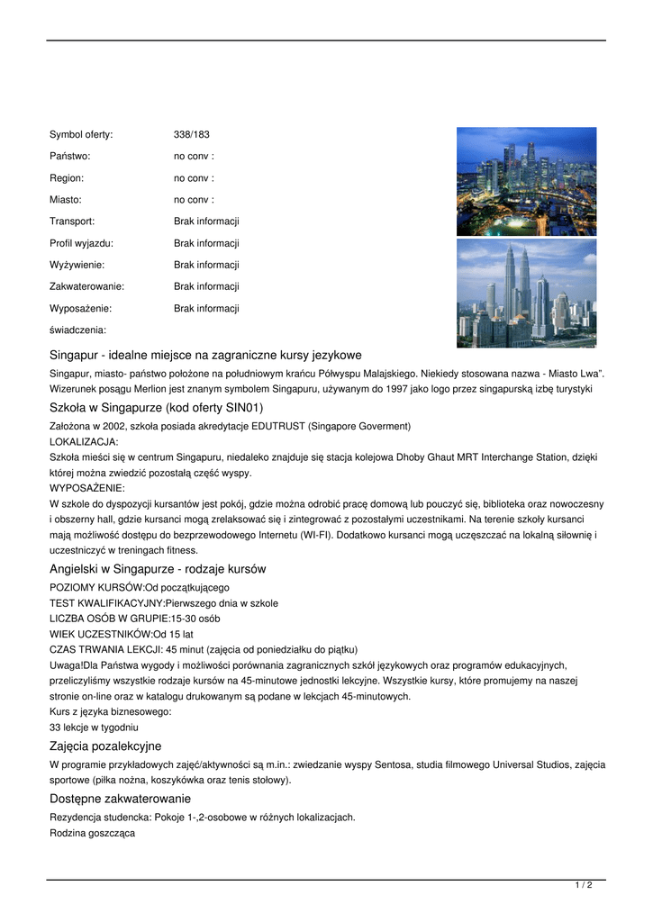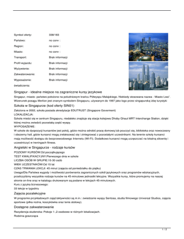 Symbol oferty: 338/183 Państwo: no conv : Region: no conv : Miasto: no conv : Transport: Brak informacji Profil wyjazdu: Brak informacji Wyżywienie: Brak informacji Zakwaterowanie: Brak informacji Wyposażenie: Brak informacji świadczenia: Singapur - idealne miejsce na zagraniczne kursy jezykowe Singapur, miasto- państwo położone na południowym krańcu Półwyspu Malajskiego. Niekiedy stosowana nazwa - Miasto Lwa”. Wizerunek posągu Merlion jest znanym symbolem Singapuru, używanym do 1997 jako logo przez singapurską izbę turystyki Szkoła w Singapurze (kod oferty SIN01) Założona w 2002, szkoła posiada akredytacje EDUTRUST (Singapore Goverment) LOKALIZACJA: Szkoła mieści się w centrum Singapuru, niedaleko znajduje się stacja kolejowa Dhoby Ghaut MRT Interchange Station, dzięki której można zwiedzić pozostałą część wyspy. WYPOSAŻENIE: W szkole do dyspozycji kursantów jest pokój, gdzie można odrobić pracę domową lub pouczyć się, biblioteka oraz nowoczesny i obszerny hall, gdzie kursanci mogą zrelaksować się i zintegrować z pozostałymi uczestnikami. Na terenie szkoły kursanci mają możliwość dostępu do bezprzewodowego Internetu (WI-FI). Dodatkowo kursanci mogą uczęszczać na lokalną siłownię i uczestniczyć w treningach fitness. Angielski w Singapurze - rodzaje kursów POZIOMY KURSÓW:Od początkującego TEST KWALIFIKACYJNY:Pierwszego dnia w szkole LICZBA OSÓB W GRUPIE:15-30 osób WIEK UCZESTNIKÓW:Od 15 lat CZAS TRWANIA LEKCJI: 45 minut (zajęcia od poniedziałku do piątku) Uwaga!Dla Państwa wygody i możliwości porównania zagranicznych szkół językowych oraz programów edukacyjnych, przeliczyliśmy wszystkie rodzaje kursów na 45-minutowe jednostki lekcyjne. Wszystkie kursy, które promujemy na naszej stronie on-line oraz w katalogu drukowanym są podane w lekcjach 45-minutowych. Kurs z języka biznesowego: 33 lekcje w tygodniu Zajęcia pozalekcyjne W programie przykładowych zajęć/aktywności są m.in.: zwiedzanie wyspy Sentosa, studia filmowego Universal Studios, zajęcia sportowe (piłka nożna, koszykówka oraz tenis stołowy). Dostępne zakwaterowanie Rezydencja studencka: Pokoje 1-,2-osobowe w różnych lokalizacjach. Rodzina goszcząca 1/2 Opcje wyżywienia dla wybranego zakwaterowania Rezydencja studencka: własne wyżywienie Rodzina goszcząca: 2 posiłki (Half-Board) tj. śniadania i obiadokolacje. Transport i transfer Transport samolotem oraz transfer z/na lotnisko Ubezpieczenie ATJ LINGWISTA gwarantuje Klientowi umowę ubezpieczeniową na okres wyjazdu: polisa SIGNAL IDUNA Polska Towarzystwo Ubezpieczeń S.A.. Z tytułu umowy Klientowi przysługują odszkodowania: od kosztów leczenia, od nieszczęśliwych wypadków, utrata bagażu. Kwoty ubezpieczenia: KL: (koszty leczenia) równowartość w PLN 30 000 EUR NNW: (nieszczęśliwe wypadki) 16000 PLN Bagaż: 1800 PLN Istnieje możliwość zawarcia dodatkowego ubezpieczenia na wyższe kwoty za pośrednictwem naszej strony internetowej http://lingwista.com.pl/ubezpieczenia.html, jak również ubezpieczenie od kosztów rezygnacji z udziału w imprezie oraz od chorób przewlekłych (informacje na ten temat dostępne w naszym biurze lub u agenta). Cena podstawowa za wyjazd językowy obejmuje kurs językowy 33 lekcje w tygodniu certyfikat ukończenia kursu ubezpieczenie KL/NNW/bagaż Cena podstawowa za wyjazd językowy nie obejmuje przelot odbiór z lotniska zakwaterowanie wyżywienie materiały do nauki TERMINY: CENNIK: Długość pobytu: dni Grupa cenowa: Waluta: PLN Aktualne ceny z systemu S.A.R.T. (-) - cena usługi, podatku kalkulowana przy osobie lub gratis (*) - kwota wliczona w cenę standardową 2/2
