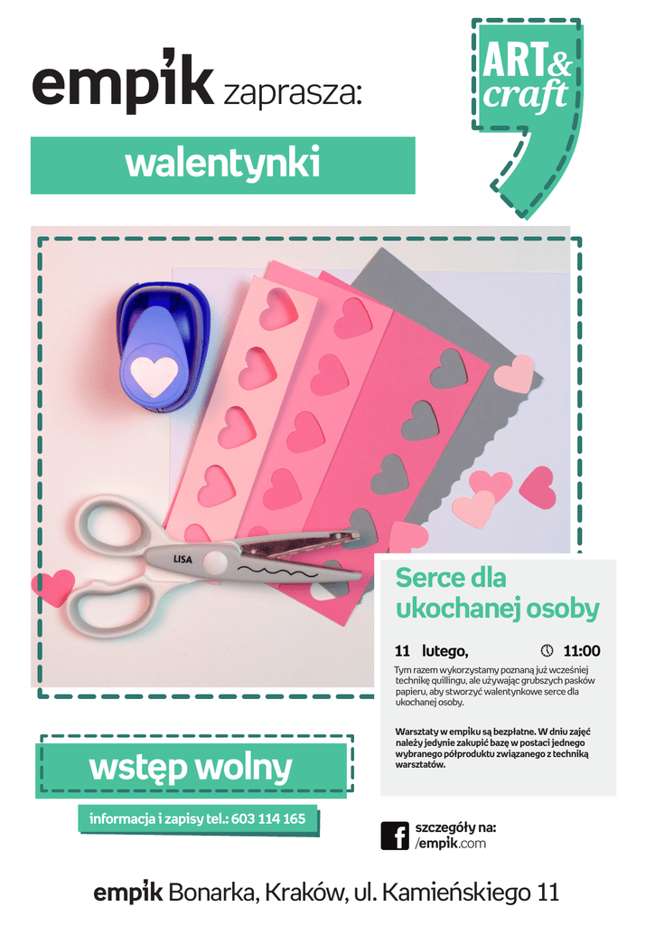 empik zaprasza: walentynki Serce dla ukochanej osoby 11 lutego, 11:00 Tym razem wykorzystamy poznaną już wcześniej technikę quillingu, ale używając grubszych pasków papieru, aby stworzyć walentynkowe serce dla ukochanej osoby. wstęp wolny informacja i zapisy tel.: 603 114 165 Warsztaty w empiku są bezpłatne. W dniu zajęć należy jedynie zakupić bazę w postaci jednego wybranego półproduktu związanego z techniką warsztatów. szczegóły na: /empik.com empik Bonarka, Kraków, ul. Kamieńskiego 11