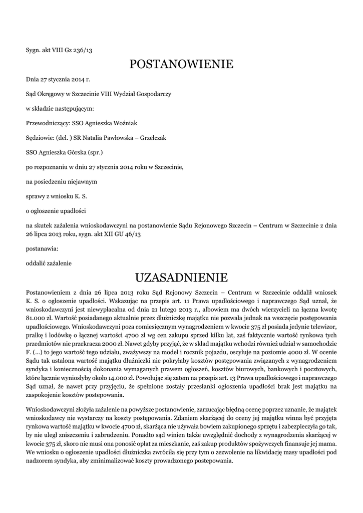 Sygn. akt VIII Gz 236/13 POSTANOWIENIE Dnia 27 stycznia 2014 r. Sąd Okręgowy w Szczecinie VIII Wydział Gospodarczy w składzie następującym: Przewodniczący: SSO Agnieszka Woźniak Sędziowie: (del. ) SR Natalia Pawłowska – Grzelczak SSO Agnieszka Górska (spr.) po rozpoznaniu w dniu 27 stycznia 2014 roku w Szczecinie, na posiedzeniu niejawnym sprawy z wniosku K. S. o ogłoszenie upadłości na skutek zażalenia wnioskodawczyni na postanowienie Sądu Rejonowego Szczecin – Centrum w Szczecinie z dnia 26 lipca 2013 roku, sygn. akt XII GU 46/13 postanawia: oddalić zażalenie UZASADNIENIE Postanowieniem z dnia 26 lipca 2013 roku Sąd Rejonowy Szczecin – Centrum w Szczecinie oddalił wniosek K. S. o ogłoszenie upadłości. Wskazując na przepis art. 11 Prawa upadłościowego i naprawczego Sąd uznał, że wnioskodawczyni jest niewypłacalna od dnia 21 lutego 2013 r., albowiem ma dwóch wierzycieli na łączna kwotę 81.000 zł. Wartość posiadanego aktualnie przez dłużniczkę majątku nie pozwala jednak na wszczęcie postępowania upadłościowego. Wnioskodawczyni poza comiesięcznym wynagrodzeniem w kwocie 375 zł posiada jedynie telewizor, pralkę i lodówkę o łącznej wartości 4700 zł wg cen zakupu sprzed kilku lat, zaś faktycznie wartość rynkowa tych przedmiotów nie przekracza 2000 zł. Nawet gdyby przyjąć, że w skład majątku wchodzi również udział w samochodzie F. (...) to jego wartość tego udziału, zważywszy na model i rocznik pojazdu, oscyluje na poziomie 4000 zł. W ocenie Sądu tak ustalona wartość majątku dłużniczki nie pokryłaby kosztów postępowania związanych z wynagrodzeniem syndyka i koniecznością dokonania wymaganych prawem ogłoszeń, kosztów biurowych, bankowych i pocztowych, które łącznie wyniosłyby około 14.000 zł. Powołując się zatem na przepis art. 13 Prawa upadłościowego i naprawczego Sąd uznał, że nawet przy przyjęciu, że spełnione zostały przesłanki ogłoszenia upadłości brak jest majątku na zaspokojenie kosztów postepowania. Wnioskodawczyni złożyła zażalenie na powyższe postanowienie, zarzucając błędną ocenę poprzez uznanie, że majątek wnioskodawcy nie wystarczy na koszty postępowania. Zdaniem skarżącej do oceny jej majątku winna być przyjęta rynkowa wartość majątku w kwocie 4700 zł, skarżąca nie używała bowiem zakupionego sprzętu i zabezpieczyła go tak, by nie uległ zniszczeniu i zabrudzeniu. Ponadto sąd winien także uwzględnić dochody z wynagrodzenia skarżącej w kwocie 375 zł, skoro nie musi ona ponosić opłat za mieszkanie, zaś zakup produktów spożywczych finansuje jej mama. We wniosku o ogłoszenie upadłości dłużniczka zwróciła się przy tym o zezwolenie na likwidację masy upadłości pod nadzorem syndyka, aby zminimalizować koszty prowadzonego postepowania. Mając powyższe zarzuty na względzie skarżąca wniosła o uchylenie zaskarżonego postanowienia i przekazanie sprawy Sądowi I instancji do ponownego rozpoznania. Sąd Okręgowy zważył, co następuje: Zażalenie okazało się niezasadne. Powołane w zażaleniu argumenty okoliczności nie zmieniają prawidłowości rozstrzygnięcia Sądu Rejonowego. Sąd ten przyjął, że wnioskodawczyni jest niewypłacalna w rozumieniu art. 10 ustawy z dnia 28 lutego 2003 roku Prawo upadłościowe i naprawcze (Dz. U. z 2009, nr 175, poz. 1361), dalej zwanej „puin”, a zatem zaistniała wobec niej podstawowa przesłanka ogłoszenia upadłości. Oddalenie wniosku o ogłoszenie upadłości było zaś wynikiem stwierdzenia przesłanki negatywnej, określonej w art. 13 ust. 1 puin. Przepis ten nie został wymieniony w art. 4912 ust. 1 puin, wśród tych, których nie stosuje się w postępowaniu o ogłoszenie upadłości wobec osób fizycznych nieprowadzących działalności gospodarczej, co jest zrozumiałe, jeśli uwzględni się fakt, iż celem każdego postępowania upadłościowego jest zaspokojenie wierzycieli, a nie wchodzi to w rachubę w sytuacji, w której majątek upadłego nie starcza nawet na koszty postępowania. Ta same racje legły u podstaw przepisu art. 361 pkt 1 puin, przewidującego umorzenie postępowania w przypadku gdy majątek pozostały po wyłączeniu z niego przedmiotów majątkowych dłużnika obciążonych hipoteką, zastawem, zastawem rejestrowym, zastawem skarbowym lub hipoteką morską nie wystarcza na zaspokojenie kosztów postępowania. Biorąc pod uwagę wartość majątku dłużniczki, rację trzeba przyznać Sądowi Rejonowemu co do negatywnej prognozy w tym zakresie. Wbrew zarzutom podniesionym w zażaleniu nie sposób przy ocenie wartości tego majątku przyjmować cen z daty zakupu sprzętu. Zasady doświadczenia życiowego nie pozwalają bowiem przyjąć, by za sprzęt zakupiony w 2007 r., nawet w razie jego nieużywania, możliwe byłoby uzyskanie ceny równej cenie zakupu. Przede wszystkim, biorąc pod uwagę sukcesywne zwiększanie przez producentów funkcjonalności tego rodzaju sprzętu, nie można spodziewać się zainteresowania nabyciem sprzętu zakupionego 7 lat wcześniej za cenę równą cenie zakupu – nawet w przypadku niekorzystania z niego przez wnioskodawczynię. Brak też jest podstaw by przy ocenie wartości majątku dłużniczki na potrzeby postepowania upadłościowego uwzględniać wartość udziału w samochodzie marki F. (...) skoro sama dłużniczka przyznaje, że nie wie, gdzie przebywa obecnie jej były małżonek, w którego posiadaniu samochód ten uprzednio znajdował się. Abstrahując zatem od trudności z uzyskaniem ekwiwalentu za sprzedaż udziału we współwłasności samochodu osobowego, w chwili obecnej nie można ustalić miejsca, w którym samochód ten się znajduje. Nierealne jest także, zdaniem Sądu, założenie, iż dłużniczka byłaby w stanie wygospodarować jakieś oszczędności z uzyskiwanego wynagrodzenia za pracę w kwocie 375 zł, które mogłaby przeznaczyć na cele postępowania upadłościowego. Sam fakt, ż