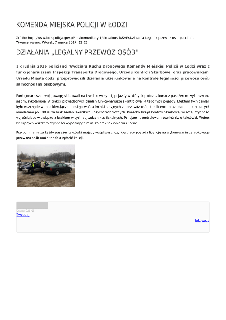 KOMENDA MIEJSKA POLICJI W ŁODZI Źródło: http://www.lodz.policja.gov.pl/eld/komunikaty-1/aktualnosci/8249,Dzialania-Legalny-przewoz-osobquot.html Wygenerowano: Wtorek, 7 marca 2017, 22:03 DZIAŁANIA „LEGALNY PRZEWÓZ OSÓB" 1 grudnia 2016 policjanci Wydziału Ruchu Drogowego Komendy Miejskiej Policji w Łodzi wraz z funkcjonariuszami Inspekcji Transportu Drogowego, Urzędu Kontroli Skarbowej oraz pracownikami Urzędu Miasta Łodzi przeprowadzili działania ukierunkowane na kontrolę legalności przewozu osób samochodami osobowymi. Funkcjonariusze swoją uwagę skierowali na tzw lokowozy – tj pojazdy w których podczas kursu z pasażerem wykonywana jest muzykoterapia. W trakcji prowadzonych działań funkcjonariusze skontrolowali 4 tego typu pojazdy. Efektem tych działań było wszczęcie wobec kierujących postępowań administracyjnych za przewóz osób bez licencji oraz ukaranie kierujących mandatami po 1000zł za brak badań lekarskich i psychotechnicznych. Ponadto Urząd Kontroli Skarbowej wszczął czynności wyjaśniające w związku z brakiem w tych pojazdach kas fiskalnych. Policjanci skontrolowali również dwie taksówki. Wobec kierujących wszczęto czynności wyjaśniające m.in. za brak taksometru i licencji. Przypominamy że każdy pasażer taksówki mający wątpliwości czy kierujący posiada licencję na wykonywanie zarobkowego przewozu osób może ten fakt zgłosić Policji. Ocena: 0/5 (0) Tweetnij lokowozy
