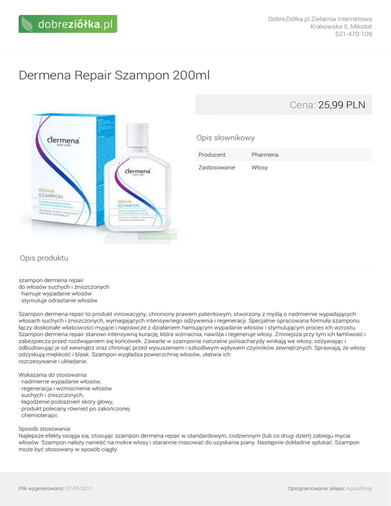 DobreZiółka.pl Zielarnia Internetowa Krakowska 5, Mikstat 531-470-109 Dermena Repair Szampon 200ml Cena: 25,99 PLN Opis słownikowy Producent Pharmena Zastosowanie Włosy Opis produktu szampon dermena repair do włosów suchych i zniszczonych · hamuje wypadanie włosów · stymuluje odrastanie włosów Szampon dermena repair to produkt innowacyjny, chroniony prawem patentowym, stworzony z myślą o nadmiernie wypadających włosach suchych i zniszczonych, wymagających intensywnego odżywienia i regeneracji. Specjalnie opracowana formuła szamponu łączy doskonałe właściwości myjące i naprawcze z działaniem hamującym wypadanie włosów i stymulującym proces ich wzrostu. Szampon dermena repair stanowi intensywną kurację, która wzmacnia, nawilża i regeneruje włosy. Zmniejsza przy tym ich łamliwość i zabezpiecza przed rozdwajaniem się końcówek. Zawarte w szamponie naturalne polisacharydy wnikają we włosy, odżywiając i odbudowując je od wewnątrz oraz chroniąc przed wysuszeniem i szkodliwym wpływem czynników zewnętrznych. Sprawiają, że włosy odzyskują miękkość i blask. Szampon wygładza powierzchnię włosów, ułatwia ich rozczesywanie i układanie. Wskazania do stosowania: · nadmierne wypadanie włosów, · regeneracja i wzmocnienie włosów suchych i zniszczonych, · łagodzenie podrażnień skóry głowy, · produkt polecany również po zakończonej chemioterapii. Sposób stosowania: Najlepsze efekty osiąga się, stosując szampon dermena repair w standardowym, codziennym (lub co drugi dzień) zabiegu mycia włosów. Szampon należy nanieść na mokre włosy i starannie masować do uzyskania piany. Następnie dokładnie spłukać. Szampon może być stosowany w sposób ciągły. Plik wygenerowano: 07-03-2017 Oprogramowanie sklepu: AptusShop DobreZiółka.pl Zielarnia Internetowa Krakowska 5, Mikstat 531-470-109 Przeciwwskazania: Nadwrażliwość na którykolwiek ze składników preparatu. Plik wygenerowano: 07-03-2017 Powered by TCPDF (www.tcpdf.org) Oprogramowanie sklepu: AptusShop