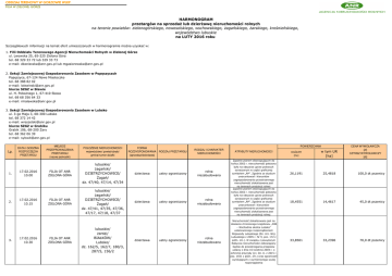 ODDZIAŁ TERENOWY W GORZOWIE WLKP. FILIA W ZIELONEJ GÓRZE HARMONOGRAM przetargów na sprzedaż lub dzierżawę nieruchomości rolnych na terenie powiatów: zielonogórskiego, nowosolskiego, wschowskiego, żagańskiego, żarskiego, krośnieńskiego, województwo lubuskie na LUTY 2016 roku Szczegółowych informacji na temat ofert umieszczonych w harmonogramie można uzyskać w: 1. Filii Oddziału Terenowego Agencji Nieruchomości Rolnych w Zielonej Górze ul. Lwowska 25, 65-225 Zielona Góra tel. 68 329 33 72 lub 329 33 73 e-mail: [email protected] lub [email protected] 2. Sekcji Zamiejscowej Gospodarowania Zasobem w Popęszycach Popęszyce, 67-124 Nowe Miasteczko tel. 68 388 82 02 e-mail: [email protected] biurze SZGZ w Sławie ul. H. Pobożnego 1, 67-410 Sława tel. 68 68 356 64 33 e-mail: [email protected] 3. Sekcji Zamiejscowej Gospodarowania Zasobem w Lubsko ul. 3-go Maja 3, 68-300 Lubsko tel. 68 372 14 42 e-mail: [email protected] biurze SZGZ w Grabiku Grabik 106, 68-200 Żary tel. 68 362 06 39 e-mail: [email protected] Lp. 1. 2. 3. DATA I GODZINA ROZPOCZĘCIA PRZETARGU 17.02.2016 10.00 17.02.2016 10.15 17.02.2016 10.30 POWIERZCHNIA MIEJSCE PRZEPROWADZENIA PRZETARGU (nazwa jednostki) POŁOŻENIE NIERUCHOMOŚCI województwo/ powiat/obręb/ gmina/numer działki FILIA OT ANR ZIELONA GÓRA lubuskie/ żagański/ DZIETRZYCHOWICE/ Żagań/ dz. 47/40, 47/14, 47/34 dzierżawa ustny ograniczony rolna niezabudowana FILIA OT ANR ZIELONA GÓRA lubuskie/ żagański/ DZIETRZYCHOWICE/ Żagań/ dz. 47/41, 47/35, 47/36, 47/17, 47/18, 47/37 dzierżawa ustny ograniczony rolna niezabudowana FILIA OT ANR ZIELONA GÓRA lubuskie/ żarski/ BIAŁKÓW/ Lubsko/ dz. 162/5, 162/7, 180/3, 287/5, 156/2 FORMA ROZDYSPONOWANIA (sprzedaż/dzierżawa) dzierżawa RODZAJ PRZETARGU ustny ograniczony RODZAJ I CHARAKTER NIERUCHOMOŚCI rolna niezabudowana ATRYBUTY NIERUCHOMOŚCI Zgodnie planem obowiązującym do końca 2002 r. nieruchomość położona była na obszarze upraw polowych oznaczonym w części graficznej symbolem „RP”. Zgodnie ze studium uwarunkowań i kierunków zagospodarowania przestrzennego nieruchomość zlokalizowana jest na terenach produkcji rolnej Zgodnie planem obowiązującym do końca 2002 r. nieruchomość położona była na obszarze upraw polowych oznaczonym w części graficznej symbolem „RP”. Zgodnie ze studium uwarunkowań i kierunków zagospodarowania przestrzennego nieruchomość zlokalizowana jest na terenach produkcji rolnej Nieruchomość zlokalizowana jest na obszarze chronionego krajobrazu „30B – Wschodnie okolice Lubska” ustanowionego rozporządzeniem Wojewody Lubuskiego (Dz. Urz. Woj. Lubuskiego z 2005 r. Nr 9, poz. 172 z późn. zm.). W związku z powyższym Nabywca nieruchomości zobowiązany będzie do przestrzegania przepisów ustawy z dnia 16 kwietnia 2004 r. o ochronie przyrody (j.t. Dz. U. z 2015 r. poz. 1651 z późn. zm.) oraz ograniczeń wynikających z wymienionego wyżej rozporządzenia CENA WYWOŁAWCZA [zł] CZYNSZ WYWOŁAWCZY [dt] OGÓŁEM [ha] w tym UR [ha] 26,1191 25,4818 100,0 dt pszenicy 18,4551 14,4617 45,0 dt pszenicy 33,8501 33,2396 70,0 dt pszenicy 4. 17.02.2016 10.45 FILIA OT ANR ZIELONA GÓRA 5. 17.02.2016 11.00 FILIA OT ANR ZIELONA GÓRA 6. 17.02.2016 11.30 FILIA OT ANR ZIELONA GÓRA 7. 17.02.2016 12.00 FILIA OT ANR ZIELONA GÓRA 8. 9. 17.02.2016 12.30 17.02.2016 13.00 lubuskie/ żarski/ LIPSK ŻARSKI/ Jasień/ dz. 113, 115, 136 lubuskie/ żarski/ LIPSK ŻARSKI/ Jasień/ dz. 187, 190 lubuskie/ krośnieński/ WĘŻYSKA/ Krosno Odrzańskie/ dz. 320/1 lubuskie/ zielonogórski/ SMOLNO WIELKIE/ Kargowa/ dz. 624 dzierżawa ustny ograniczony rolna niezabudowana dzierżawa ustny ograniczony rolna niezabudowana dzierżawa ustny ograniczony rolna niezabudowana FILIA OT ANR ZIELONA GÓRA dzierżawa ustny ograniczony niezabudowana FILIA OT ANR ZIELONA GÓRA lubuskie/ żagański/ KONIN ŻAGAŃSKI Iłowa/ dz. 1/88 dzierżawa ustny ograniczony niezabudowana dzierżawa ustny ograniczony niezabudowana dzierżawa ustny ograniczony niezabudowana 10. 17.02.2016 13.30 FILIA OT ANR ZIELONA GÓRA 11. 17.02.2016 14.00 FILIA OT ANR ZIELONA GÓRA lubuskie/ żagański/ LUBIESZÓW/ Wymiarki/ dz. 25/1, 144 12. rolna niezabudowana lubuskie/ zielonogórski/ 55 obręb m. ZIELONA GÓRA - NOWY KISIELIN/ Zielona Góra/ dz. 37/22 lubuskie/ żagański/ KONIN ŻAGAŃSKI Iłowa/ dz. 1/89 19.02.2016 10.00 ustny ograniczony dzierżawa FILIA OT ANR ZIELONA GÓRA lubuskie/ nowosolski/ KONRADOWO/ Otyń/ dz. 84/3, 80/8, 87 dzierżawa ustny ograniczony niezabudowana Nieruchomość położona jest na peryferiach miejscowości, poza strefą zabudowy, w kompleksie gruntów rolnych i leśnych. Dojazd do nieruchomości odbywa się drogą gruntową gminną w dobrym stanie technicznym. Nieruchomość położona jest na peryferiach miejscowości, poza strefą zabudowy, w kompleksie gruntów rolnych i leśnych. Dojazd do nieruchomości odbywa się drogą gruntową gminną w dobrym stanie technicznym. Działka położona w peryferyjnej części na wschód od zabudowy wsi w bezpośrednim sąsiedztwie rzeki Jeziornica. Dojazd do działki drogami polnymi Działka zlokalizowana w południowo – wschodniej części miejscowości. Zgodnie z nieobowiązującym miejscowym planem zagospodarowania przestrzennego nieruchomość położona była na terenie upraw polowych i sadowniczych. Zgodnie z studium uwarunkowań i kierunków zagospodarowania przestrzennego nieruchomość położona jest na terenie osadniczo Nieruchomość położona jest w bezpośrednim sąsiedztwie terenów inwestycyjnych Gminy Iłowa w obszarze strefy aktywności gospodarczej przy autostradzie A-18 łączącej Berlin z Wrocławiem i zlokalizowana jest przy węźle autostradowym „Iłowa” łączącym drogę wojewódzką 296 Kożuchów – Żagań – Zgorzelec z Nieruchomość położona jest w bezpośrednim sąsiedztwie terenów inwestycyjnych Gminy Iłowa w obszarze strefy aktywności gospodarczej przy autostradzie A-18 łączącej Be