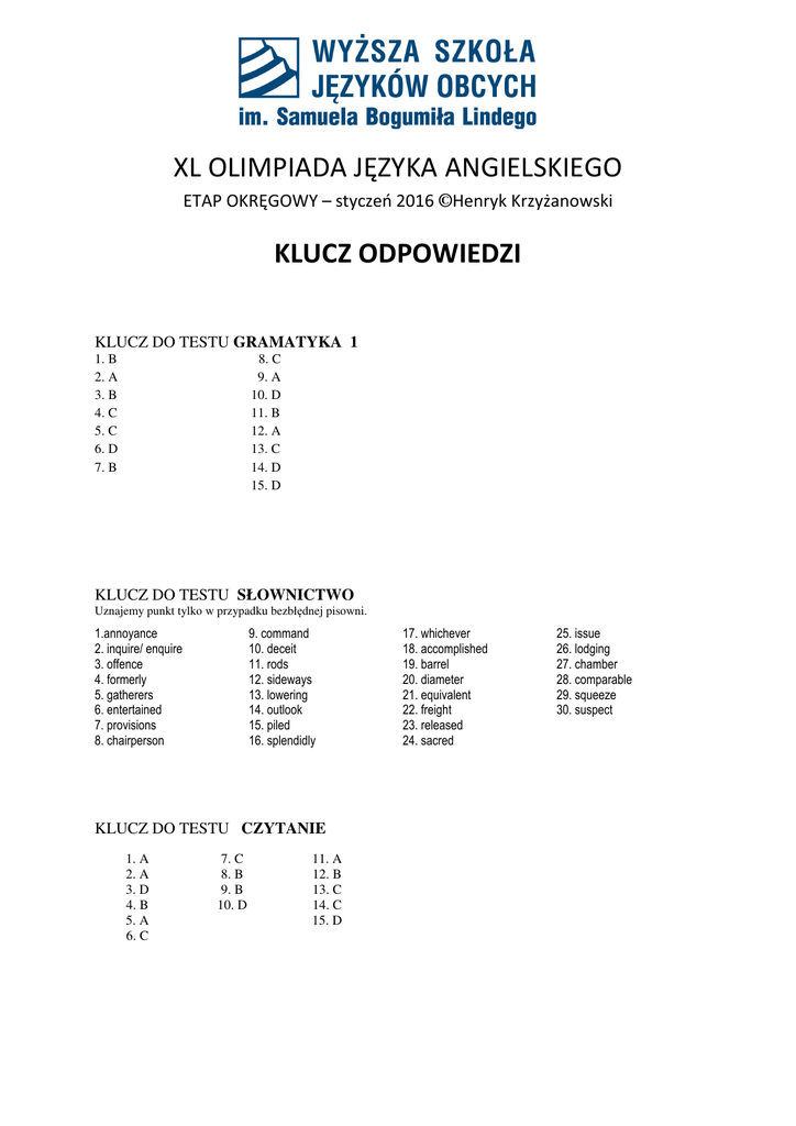 40. OJA etap okręgowy klucz - Olimpiada Języka Angielskiego