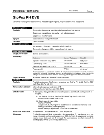 Instrukcja Techniczna Stan: 09.2003 Strona 1 StoPox PH DVE Lakier na bazie ywicy epoksydowej. Posadzka parkingowa, rozpuszczalnikowa, elastyczna. Charakterystyka Funkcja Spr ysta, elastyczna, nieodkształcalna powierzchnia jezdna Odporno na działanie olei, paliw i soli odladzaj cych Odporno mechaniczna Optyka Dostarczana w ró nych kolorach Obróbka Zakres stosowania Łatwa obróbka Na zewn trz i do wn trz na powierzchni posadzek. Spr Dane techniczne Grupa produktów Parametry ysty, elastyczny lakier na powierzchnie jezdne. ywica epoksydowa Kryterium Norma / Wytyczne Warto G sto – mieszanie przy +23°C DIN 53 217 1,35 g/cm Lepko przy +23°C DIN 53 018-1-4.2 2700 mPa⋅s DIN 53 505 40 TP OS 1,5 N/mm Twardo wg skali Shore’a (A/D) Przyczepno 3 2 Podane parametry s warto ciami rednimi. W zwi zku z zastosowaniem w naszych produktach naturalnych surowców rzeczywiste warto ci w poszczególnych dostawach mog nieznacznie odbiega od podanych warto ci. Ró nice te nie maj jednak wpływu na wła ciwo ci produktu. Dopuszczenia Obróbka - Wskazówki Podło e Aprobata Techniczna IBDiM AT/2001-04-0853 Temperatura obróbki Minimalna temperatura obróbki +8°C Maksymalna temperatura obróbki +30°C Układ warstw 1. Spr yste, elastyczne lakierowanie kryj ce na powłokach parkingowych z posypk . Powłoki parkingowe StoCretec z posypk , np. StoPur PH Multi, StoPox TEP Multi Top, StoPur VS 505 1.1 np. StoPur PH Multi, StoPox TEP Multi Top, StoPur VS 505 usun lu ny piasek (odkurzy ) 1.2 Elastyczny, kryj cy lakier StoPox PH DVE 2 Zu ycie: ok. 0,5-1,0 kg/m w zale no ci od szorstko ci warstwy cieralnej (uziarnienia piasku posypki). Nanoszenie pac gumow , dokładnie rozwałkowa Proporcje mieszania Komponent A : Komponent B = 5 : 1 cz. wagowych Mieszanie Przela komponent B do pojemnika z komponentem A i wymiesza przy pomocy mieszadła wolnoobrotowego (max 300 obr/min) do uzyskania homogenicznej masy (miesza ok. 3 minuty). Po wymieszaniu przela materiał do czystego pojemnika i ponownie przemiesza . Instrukcja Techniczna Stan: 09.2003 Strona 2 StoPox PH DVE Lakier na bazie ywicy epoksydowej. Posadzka parkingowa, rozpuszczalnikowa, elastyczna. Czas obróbki przy +10°C – ok. 60 minut przy +23°C – ok. 30 minut przy +30°C – ok. 15 minut Zu ycie Artykuł Zastosowanie Zu ycie ok. Komponent A lakierowanie 0,417-0,75 kg/m2 Komponent B lakierowanie 0,083-0,15 kg/m2 Zu ycie zale ne jest od podło a i techniki nanoszenia. Podana warto n . Dokładne warto ci zu ycia nale y ustali dla danego podło a. Obróbka Packa gumowa / wałek Czyszczenie narz dzi StoDivers EV 100 / StoDivers EV 200 Formy dostawy Opakowanie wiadro 12,5+2,5 kg jest wielko ci orientacyj- wiadro 29,2+5,8 kg Barwa PGS / PG0 / PG1 / PG2 / Kolory specjalne Składowanie Warunki składowania Chroni przed wilgoci . Chroni przed mrozem. Przy temperaturach powy ej +35°C nie wystawia na bezpo rednie nasłonecznienie. Czas składowania Najlepsza jako w oryginalnym opakowaniu do ... (patrz opakowanie) Sto-ispo Sp. z o.o. ul. Zabraniecka 15 03-872 Warszawa tel. (0 22) 511 61 00 fax (0 22) 511 61 01 e-mail: [email protected] http://www.sto.pl
