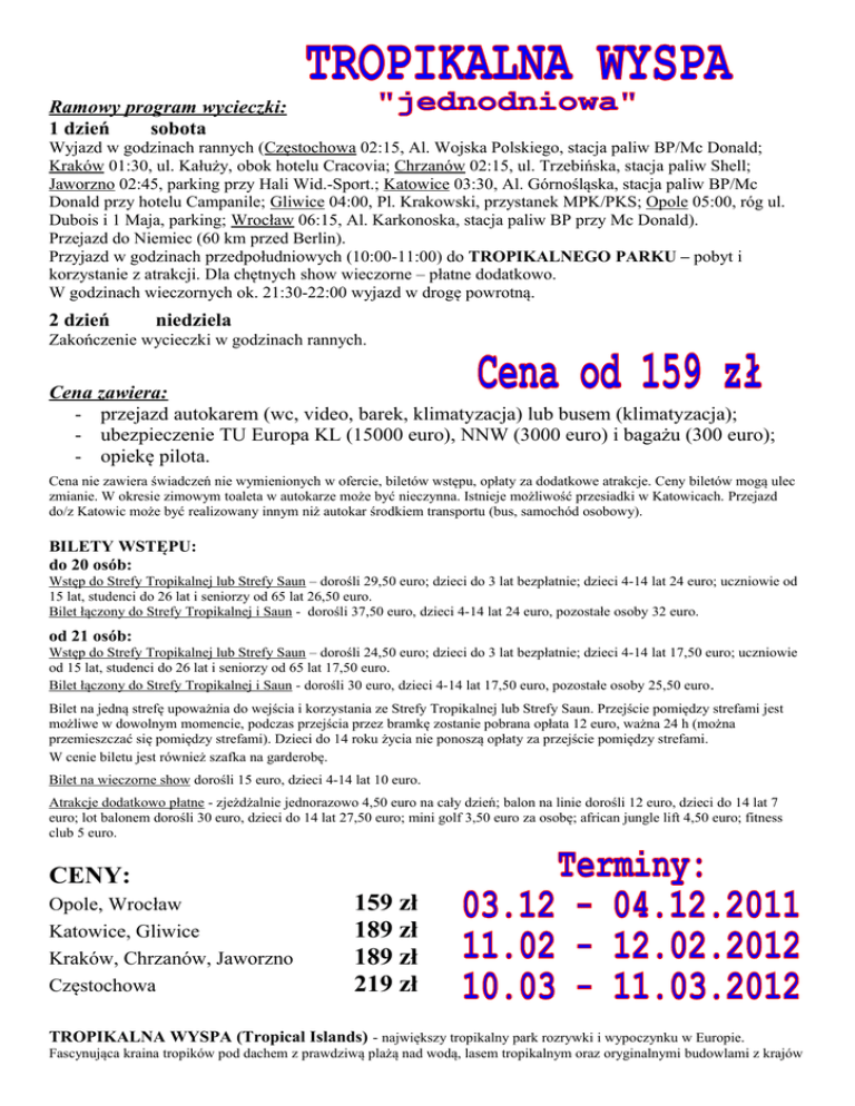 Ramowy program wycieczki: 1 dzień sobota Wyjazd w godzinach rannych (Częstochowa 02:15, Al. Wojska Polskiego, stacja paliw BP/Mc Donald; Kraków 01:30, ul. Kałuży, obok hotelu Cracovia; Chrzanów 02:15, ul. Trzebińska, stacja paliw Shell; Jaworzno 02:45, parking przy Hali Wid.-Sport.; Katowice 03:30, Al. Górnośląska, stacja paliw BP/Mc Donald przy hotelu Campanile; Gliwice 04:00, Pl. Krakowski, przystanek MPK/PKS; Opole 05:00, róg ul. Dubois i 1 Maja, parking; Wrocław 06:15, Al. Karkonoska, stacja paliw BP przy Mc Donald). Przejazd do Niemiec (60 km przed Berlin). Przyjazd w godzinach przedpołudniowych (10:00-11:00) do TROPIKALNEGO PARKU – pobyt i korzystanie z atrakcji. Dla chętnych show wieczorne – płatne dodatkowo. W godzinach wieczornych ok. 21:30-22:00 wyjazd w drogę powrotną. 2 dzień niedziela Zakończenie wycieczki w godzinach rannych. Cena zawiera: - przejazd autokarem (wc, video, barek, klimatyzacja) lub busem (klimatyzacja); - ubezpieczenie TU Europa KL (15000 euro), NNW (3000 euro) i bagażu (300 euro); - opiekę pilota. Cena nie zawiera świadczeń nie wymienionych w ofercie, biletów wstępu, opłaty za dodatkowe atrakcje. Ceny biletów mogą ulec zmianie. W okresie zimowym toaleta w autokarze może być nieczynna. Istnieje możliwość przesiadki w Katowicach. Przejazd do/z Katowic może być realizowany innym niż autokar środkiem transportu (bus, samochód osobowy). BILETY WSTĘPU: do 20 osób: Wstęp do Strefy Tropikalnej lub Strefy Saun – dorośli 29,50 euro; dzieci do 3 lat bezpłatnie; dzieci 4-14 lat 24 euro; uczniowie od 15 lat, studenci do 26 lat i seniorzy od 65 lat 26,50 euro. Bilet łączony do Strefy Tropikalnej i Saun - dorośli 37,50 euro, dzieci 4-14 lat 24 euro, pozostałe osoby 32 euro. od 21 osób: Wstęp do Strefy Tropikalnej lub Strefy Saun – dorośli 24,50 euro; dzieci do 3 lat bezpłatnie; dzieci 4-14 lat 17,50 euro; uczniowie od 15 lat, studenci do 26 lat i seniorzy od 65 lat 17,50 euro. Bilet łączony do Strefy Tropikalnej i Saun - dorośli 30 euro, dzieci 4-14 lat 17,50 euro, pozostałe osoby 25,50 euro. Bilet na jedną strefę upoważnia do wejścia i korzystania ze Strefy Tropikalnej lub Strefy Saun. Przejście pomiędzy strefami jest możliwe w dowolnym momencie, podczas przejścia przez bramkę zostanie pobrana opłata 12 euro, ważna 24 h (można przemieszczać się pomiędzy strefami). Dzieci do 14 roku życia nie ponoszą opłaty za przejście pomiędzy strefami. W cenie biletu jest również szafka na garderobę. Bilet na wieczorne show dorośli 15 euro, dzieci 4-14 lat 10 euro. Atrakcje dodatkowo płatne - zjeżdżalnie jednorazowo 4,50 euro na cały dzień; balon na linie dorośli 12 euro, dzieci do 14 lat 7 euro; lot balonem dorośli 30 euro, dzieci do 14 lat 27,50 euro; mini golf 3,50 euro za osobę; african jungle lift 4,50 euro; fitness club 5 euro. CENY: Opole, Wrocław Katowice, Gliwice Kraków, Chrzanów, Jaworzno Częstochowa 159 zł 189 zł 189 zł 219 zł TROPIKALNA WYSPA (Tropical Islands) - największy tropikalny park rozrywki i wypoczynku w Europie. Fascynująca kraina tropików pod dachem z prawdziwą plażą nad wodą, lasem tropikalnym oraz oryginalnymi budowlami z krajów ze strefy międzyzwrotnikowej. To cały dzień zabawy, radości i relaksu dla całej rodziny, dzień urlopu na tropikalnej wyspie. Mnóstwo atrakcji, dla młodszych i starszych, zapewnia rozrywkę prawie 24 godziny na dobę. Temperatura w ciągu dnia w Tropical Islands to 25°C w cieniu, woda w Morzu Południowym ma 28°C, w lagunie Bali 31°C. Tropikalna Wyspa dzieli się na dwie części: Strefę Tropików, w której znajdują się poniższe atrakcje oraz Strefę Saun. ATRAKCJE PARKU: Las tropikalny; Wioska Tropikalna - oryginalne budynki z Bali, Borneo, Tajlandii i Samoa zapraszają do zwiedzania. Tutaj usytuowana jest większość restauracji oraz pasaż handlowy. Dodatkowo wioska tropikalna jest miejscem odbywania się dziennych show na scenie Wayang; Klub Tropino - atrakcje dla najmłodszych, mnóstwo powierzchni do wspinania się, skakania i innych zabaw (tor kartingowy, obiekt do wspinaczki, rowery wodne, trampolina); zjeżdżalnie wodne - znajdujące się na 25 metrowej wieży są sensacją dla wszystkich klas wiekowych. Cztery różne zjeżdżalnie oferują różne możliwości, od łagodnego zjazdu rodzinnego po super-zjeżdżalnie z prędkością do 70 km/h; African Jungle Lift – fantastyczna zabawa dla amatorów mocnych wrażeń; balon - powietrznym balonem mogą jednocześnie wznieść się na wysokość 55 m 2 osoby, skąd można podziwiać widoki: Lasu Tropikalnego, Morza Południowego, Laguny Bali i Wioski Tropikalnej; druga opcja, to 20-minutowy lot nad tropikami; Morze Południowe – kąpiele dla całej rodziny. Morze południowe oferuje ogromną powierzchnię do pływania i na wszelkie inne wodne szaleństwa. Dla najmłodszych znajduje się tutaj specjalny brodzik. Na plaży pod palmami można zabawić się w "budowniczego zamków z piasku". Przy każdej pogodzie i prawie o każdej porze "prawdziwe" słońce gwarantuje naturalną opaleniznę; Laguna Bali - prawdziwą radość kąpieli zapewnia Laguna Bali. Tutaj czeka na 1200 m² pełnych romantycznej atmosfery. Sztuczna rzeka, podziemne zjeżdżalnie wodne i jacuzzi gwarantują świetną zabawę i relaks. Piasek, drzewa i palmy okalają brzeg, balijskie chaty, groty i typowa małpia skała przeniosą Państwa na Bali, na Wyspę Bogów. Tam gdzie Laguna graniczy z lasem tropikalnym, dzięki grotom i wodospadom można się tu poczuć jak w prawdziwej dżungli. Wieczorami i nocą basen Laguny zamienia się w romantycznie oświetloną krainę, przepełnioną magiczną grą kolorów; Fitness Club; mini golf - gra w mini golfa w skalnej krainie. Na sztucznej trawie o intensywnej zieleni, znajduje się 18 dołków z trasami o różnym stopniu trudności. Wspaniała zabawa dla całej rodziny; największy tropikalny kompleks wellnes i saun w Europie – entuzjaśc