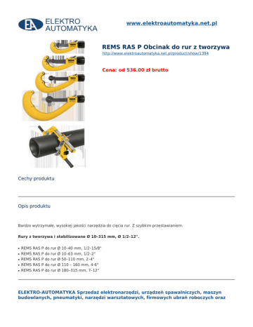 www.elektroautomatyka.net.pl REMS RAS P Obcinak do rur z tworzywa http://www.elektroautomatyka.net.pl/product/show/1394 Cena: od 536.00 zł brutto Cechy produktu Opis produktu Bardzo wytrzymałe, wysokiej jakości narzędzia do cięcia rur. Z szybkim przestawianiem. Rury z tworzywa i stabilizowane Ø 10–315 mm, Ø 1/2–12". ● ● ● ● ● REMS RAS P do rur Ø 10–40 mm, 1/2–15/8" REMS RAS P do rur Ø 10–63 mm, 1/2–2" REMS RAS P do rur Ø 50–110 mm, 2–4" REMS RAS P do rur Ø 110 – 160 mm, 4-6" REMS RAS P do rur Ø 180–315 mm, 7–12" ELEKTRO-AUTOMATYKA Sprzedaż elektronarzędzi, urządzeń spawalniczych, maszyn budowlanych, pneumatyki, narzędzi warsztatowych, firmowych ubrań roboczych oraz maszyn ogrodowo leśnych. Sklep Bochnia ul. Brzeska 50 32-700 Bochnia Sklep Brzesko ul. Szarych Szeregów 23 32-800 Brzesko Serwis, Magazyn ul. Św. Brata Alberta 4 32-800 Brzesko tel. 691 572 333 e-mail: [email protected] tel. 609 523 230 e-mail: [email protected] tel. 609 523 645 e-mail: [email protected]