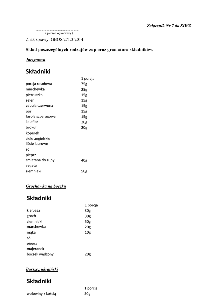 Załącznik Nr 7 do SIWZ ............................................................ ( pieczęć Wykonawcy ) Znak sprawy: GBOŚ.271.3.2014 Skład poszczególnych rodzajów zup oraz gramatura składników. Jarzynowa Składniki porcja rosołowa marchewka pietruszka seler cebula czerwona por fasola szparagowa kalafior brokuł koperek ziele angielskie liście laurowe sól pieprz śmietana do zupy vegeta ziemniaki 1 porcja 75g 25g 15g 15g 15g 15g 15g 20g 20g 40g 50g Grochówka na boczku Składniki kiełbasa groch ziemniaki marchewka mąka sól pieprz majeranek boczek wędzony 1 porcja 30g 30g 50g 20g 10g 20g Barszcz ukraiński Składniki wołowiny z kością 1 porcja 50g włoszczyzna buraki biała kapusta świeża fasola perłowa ziemniaki koncentrat pomidorowy śmietana mąka pszenna sól pieprz ziele angielskie liść laurowy 30g 50g 30g 20g 50g 20g 50g 10g Żurek Składniki żur 0,5 litra boczek woda żur 0,5 litra ziemniaki mąka sól pieprz czosnek kiełbasa jajko 1 porcja 50g 20g 20g 15g 5g 30g 1 szt. Ogórkowa Składniki kiszone ogórki skrzydełka warzywa mrożone ziemniaki koperek sól do smaku pieprz do smaku śmietana słodka 1 porcja 60g 75g 50g 50g 25g Krupnik Składniki ziemniaki 1 porcja 50g kiełbasa kasza marchew natka pietruszki por cebula masło sól do smaku pieprz do smaku seler 50g 25g 25g 10g 10g 15g 15g Pomidorowa Składniki porcja rosołowa skrzydełka marchew pietruszka liść lubczyku cebula koncentrat pomidorowy śmietana sól do smaku pieprz do smaku ryż 1 porcja 30g 50g 15g 15g 10g 20g 15g 80g Fasolka po bretońsku Składniki fasola biała fasola czerwona koncentrat pomidorowy gorczyca mielona boczek wędzony cebula sól pieprz woda kiełbasa 1 porcja 35g 35g 10g 20g 30g 30g