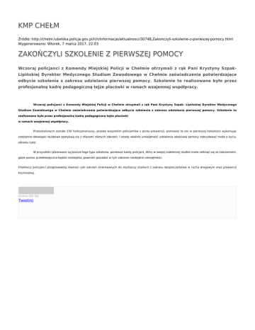 KMP CHEŁM Źródło: http://chelm.lubelska.policja.gov.pl/lch/informacje/aktualnosci/30748,Zakonczyli-szkolenie-z-pierwszej-pomocy.html Wygenerowano: Wtorek, 7 marca 2017, 22:03 ZAKOŃCZYLI SZKOLENIE Z PIERWSZEJ POMOCY Wczoraj policjanci z Komendy Miejskiej Policji w Chełmie otrzymali z rąk Pani Krystyny SzpakLipińskiej Dyrektor Medycznego Studium Zawodowego w Chełmie zaświadczenia potwierdzające odbycie szkolenia z zakresu udzielania pierwszej pomocy. Szkolenie to realizowane było przez profesjonalną kadrę pedagogiczną tejże placówki w ramach wzajemnej współpracy. Wczoraj policjanci z Komendy Miejskiej Policji w Chełmie otrzymali z rąk Pani Krystyny Szpak- Lipińskiej Dyrektor Medycznego Studium Zawodowego w Chełmie zaświadczenia potwierdzające odbycie szkolenia z zakresu udzielania pierwszej pomocy. Szkolenie to realizowane było przez profesjonalną kadrę pedagogiczną tejże placówki w ramach wzajemnej współpracy. Przeszkolonych zostało 150 funkcjonariuszy, przede wszystkim policjantów z pionu prewencji, ponieważ to oni w pierwszej kolejności wykonując codzienne obowiązki służbowe spotykają się z ofiarami różnych zdarzeń. I wtedy właśnie umiejętność udzielenia właściwej pomocy zdecydować może o życiu, zdrowiu ludzi. W przyszłości planowane są jeszcze tego typu szkolenia, ponieważ każdy policjant, który w swojej codziennej służbie może zetknąć się ze zdarzeniami, gdzie pomoc przedmedyczna będzie niezbędna, powinien posiadać w tym zakresie niezbędne umiejętności. Chełmscy policjanci przeprowadzą również cykl szkoleń skierowanych do słuchaczy studium z zakresu bezpieczeństwa w ruchu drogowym oraz prewencji kryminalnej. Ocena: 0/5 (0) Tweetnij