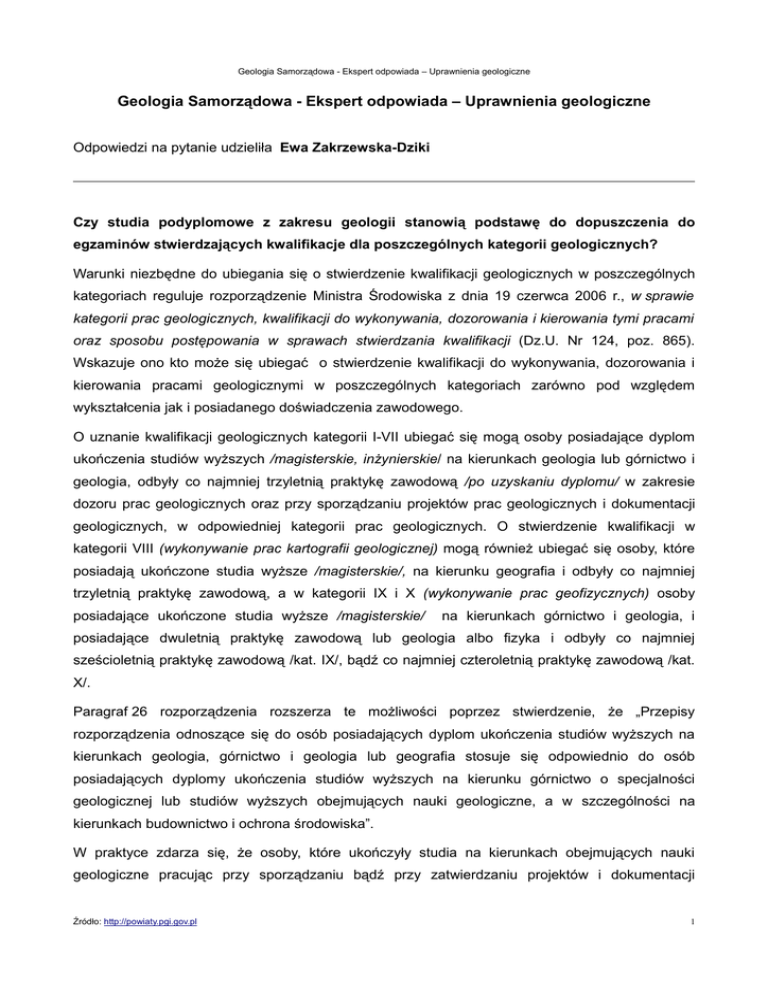 Geologia Samorządowa - Ekspert odpowiada – Uprawnienia geologiczne Geologia Samorządowa - Ekspert odpowiada – Uprawnienia geologiczne Odpowiedzi na pytanie udzieliła Ewa Zakrzewska-Dziki Czy studia podyplomowe z zakresu geologii stanowią podstawę do dopuszczenia do egzaminów stwierdzających kwalifikacje dla poszczególnych kategorii geologicznych? Warunki niezbędne do ubiegania się o stwierdzenie kwalifikacji geologicznych w poszczególnych kategoriach reguluje rozporządzenie Ministra Środowiska z dnia 19 czerwca 2006 r., w sprawie kategorii prac geologicznych, kwalifikacji do wykonywania, dozorowania i kierowania tymi pracami oraz sposobu postępowania w sprawach stwierdzania kwalifikacji (Dz.U. Nr 124, poz. 865). Wskazuje ono kto może się ubiegać o stwierdzenie kwalifikacji do wykonywania, dozorowania i kierowania pracami geologicznymi w poszczególnych kategoriach zarówno pod względem wykształcenia jak i posiadanego doświadczenia zawodowego. O uznanie kwalifikacji geologicznych kategorii I-VII ubiegać się mogą osoby posiadające dyplom ukończenia studiów wyższych /magisterskie, inżynierskie/ na kierunkach geologia lub górnictwo i geologia, odbyły co najmniej trzyletnią praktykę zawodową /po uzyskaniu dyplomu/ w zakresie dozoru prac geologicznych oraz przy sporządzaniu projektów prac geologicznych i dokumentacji geologicznych, w odpowiedniej kategorii prac geologicznych. O stwierdzenie kwalifikacji w kategorii VIII (wykonywanie prac kartografii geologicznej) mogą również ubiegać się osoby, które posiadają ukończone studia wyższe /magisterskie/, na kierunku geografia i odbyły co najmniej trzyletnią praktykę zawodową, a w kategorii IX i X (wykonywanie prac geofizycznych) osoby posiadające ukończone studia wyższe /magisterskie/ na kierunkach górnictwo i geologia, i posiadające dwuletnią praktykę zawodową lub geologia albo fizyka i odbyły co najmniej sześcioletnią praktykę zawodową /kat. IX/, bądź co najmniej czteroletnią praktykę zawodową /kat. X/. Paragraf 26 rozporządzenia rozszerza te możliwości poprzez stwierdzenie, że „Przepisy rozporządzenia odnoszące się do osób posiadających dyplom ukończenia studiów wyższych na kierunkach geologia, górnictwo i geologia lub geografia stosuje się odpowiednio do osób posiadających dyplomy ukończenia studiów wyższych na kierunku górnictwo o specjalności geologicznej lub studiów wyższych obejmujących nauki geologiczne, a w szczególności na kierunkach budownictwo i ochrona środowiska”. W praktyce zdarza się, że osoby, które ukończyły studia na kierunkach obejmujących nauki geologiczne pracując przy sporządzaniu bądź przy zatwierdzaniu projektów i dokumentacji Źródło: http://powiaty.pgi.gov.pl 1 Geologia Samorządowa - Ekspert odpowiada – Uprawnienia geologiczne geologicznych, chcąc poszerzyć swoją wiedzę geologiczną podejmują studia podyplomowe z zakresu geologii przed przystąpieniem do egzaminów stwierdzających kwalifikacje. Przepisy nie nakładają jednak takiego obowiązku. Nie ma natomiast możliwości by do egzaminu przystąpiła osoba, która ukończyła podyplomowe studia geologiczne nie ukończywszy uprzednio studiów obejmujących nauki geologiczne. W projektowanym rozporządzeniu w sprawie kwalifikacji w zakresie geologii do projektu ustawy Prawo geologiczne i górnicze przewiduje się wprowadzenie zapisu o treści „Dyplomy ukończenia studiów wyższych na kierunku górnictwo o specjalności lub specjalizacji geologicznej lub studiów wyższych obejmujących nauki geologiczne, w szczególności na kierunkach: budownictwo i ochrona środowiska, uzyskane przez osoby, które ukończyły co najmniej 2-semestrale studia podyplomowe z zakresu wnioskowanej kategorii, uważa się za równoważne z dyplomami ukończenia studiów wyższych na kierunkach geologia lub górnictwo i geologia”. Należy jednak zauważyć, że prace legislacyjne nad projektem jeszcze się nie rozpoczęły, tak więc obecnie nie można określić ostatecznego brzmienia tego zapisu. Ponadto każdy wniosek o stwierdzenie kwalifikacji jest rozpatrywany indywidualnie i wykształcenie jest tylko jednym z elementów pozwalających dopuścić danego kandydata do egzaminu bądź nie. Źródło: http://powiaty.pgi.gov.pl 2