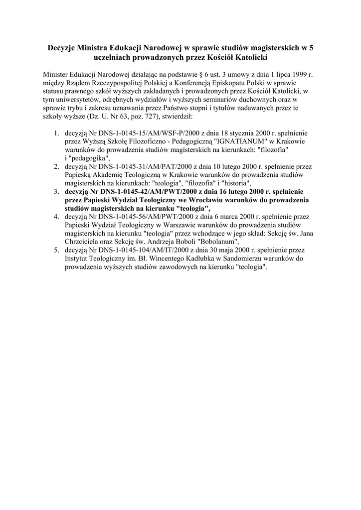 Decyzje Ministra Edukacji Narodowej w sprawie studiów magisterskich w 5 uczelniach prowadzonych przez Kościół Katolicki Minister Edukacji Narodowej działając na podstawie § 6 ust. 3 umowy z dnia 1 lipca 1999 r. między Rządem Rzeczypospolitej Polskiej a Konferencją Episkopatu Polski w sprawie statusu prawnego szkół wyższych zakładanych i prowadzonych przez Kościół Katolicki, w tym uniwersytetów, odrębnych wydziałów i wyższych seminariów duchownych oraz w sprawie trybu i zakresu uznawania przez Państwo stopni i tytułów nadawanych przez te szkoły wyższe (Dz. U. Nr 63, poz. 727), stwierdził: 1. decyzją Nr DNS-1-0145-15/AM/WSF-P/2000 z dnia 18 stycznia 2000 r. spełnienie przez Wyższą Szkołę Filozoficzno - Pedagogiczną "IGNATIANUM" w Krakowie warunków do prowadzenia studiów magisterskich na kierunkach: "filozofia" i "pedagogika", 2. decyzją Nr DNS-1-0145-31/AM/PAT/2000 z dnia 10 lutego 2000 r. spełnienie przez Papieską Akademię Teologiczną w Krakowie warunków do prowadzenia studiów magisterskich na kierunkach: "teologia", "filozofia" i "historia", 3. decyzją Nr DNS-1-0145-42/AM/PWT/2000 z dnia 16 lutego 2000 r. spełnienie przez Papieski Wydział Teologiczny we Wrocławiu warunków do prowadzenia studiów magisterskich na kierunku "teologia", 4. decyzją Nr DNS-1-0145-56/AM/PWT/2000 z dnia 6 marca 2000 r. spełnienie przez Papieski Wydział Teologiczny w Warszawie warunków do prowadzenia studiów magisterskich na kierunku "teologia" przez wchodzące w jego skład: Sekcję św. Jana Chrzciciela oraz Sekcję św. Andrzeja Boboli "Bobolanum", 5. decyzją Nr DNS-1-0145-104/AM/IT/2000 z dnia 30 maja 2000 r. spełnienie przez Instytut Teologiczny im. Bł. Wincentego Kadłubka w Sandomierzu warunków do prowadzenia wyższych studiów zawodowych na kierunku "teologia".