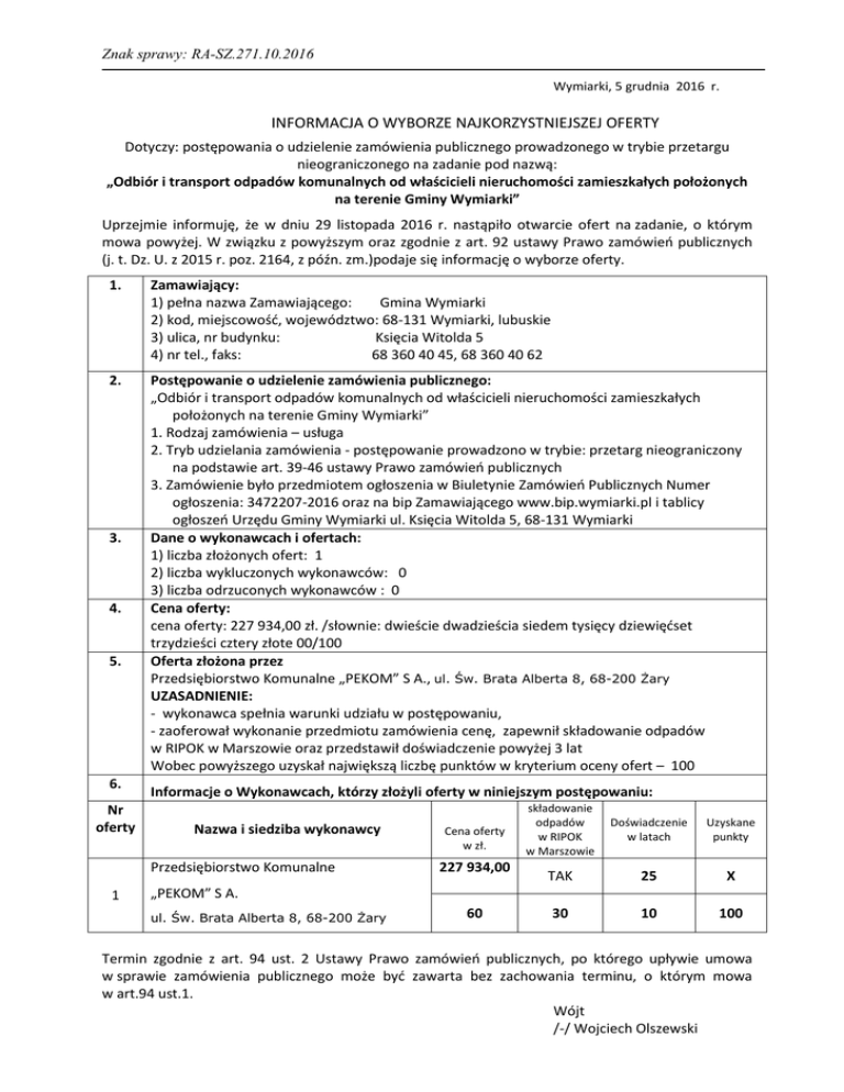 Znak sprawy: RA-SZ.271.10.2016 Wymiarki, 5 grudnia 2016 r. INFORMACJA O WYBORZE NAJKORZYSTNIEJSZEJ OFERTY Dotyczy: postępowania o udzielenie zamówienia publicznego prowadzonego w trybie przetargu nieograniczonego na zadanie pod nazwą: „Odbiór i transport odpadów komunalnych od właścicieli nieruchomości zamieszkałych położonych na terenie Gminy Wymiarki” Uprzejmie informuję, że w dniu 29 listopada 2016 r. nastąpiło otwarcie ofert na zadanie, o którym mowa powyżej. W związku z powyższym oraz zgodnie z art. 92 ustawy Prawo zamówień publicznych (j. t. Dz. U. z 2015 r. poz. 2164, z późn. zm.)podaje się informację o wyborze oferty. 1. Zamawiający: 1) pełna nazwa Zamawiającego: Gmina Wymiarki 2) kod, miejscowość, województwo: 68-131 Wymiarki, lubuskie 3) ulica, nr budynku: Księcia Witolda 5 4) nr tel., faks: 68 360 40 45, 68 360 40 62 2. Postępowanie o udzielenie zamówienia publicznego: „Odbiór i transport odpadów komunalnych od właścicieli nieruchomości zamieszkałych położonych na terenie Gminy Wymiarki” 1. Rodzaj zamówienia – usługa 2. Tryb udzielania zamówienia - postępowanie prowadzono w trybie: przetarg nieograniczony na podstawie art. 39-46 ustawy Prawo zamówień publicznych 3. Zamówienie było przedmiotem ogłoszenia w Biuletynie Zamówień Publicznych Numer ogłoszenia: 3472207-2016 oraz na bip Zamawiającego www.bip.wymiarki.pl i tablicy ogłoszeń Urzędu Gminy Wymiarki ul. Księcia Witolda 5, 68-131 Wymiarki Dane o wykonawcach i ofertach: 1) liczba złożonych ofert: 1 2) liczba wykluczonych wykonawców: 0 3) liczba odrzuconych wykonawców : 0 Cena oferty: cena oferty: 227 934,00 zł. /słownie: dwieście dwadzieścia siedem tysięcy dziewięćset trzydzieści cztery złote 00/100 Oferta złożona przez Przedsiębiorstwo Komunalne „PEKOM” S A., ul. Św. Brata Alberta 8, 68-200 Żary UZASADNIENIE: - wykonawca spełnia warunki udziału w postępowaniu, - zaoferował wykonanie przedmiotu zamówienia cenę, zapewnił składowanie odpadów w RIPOK w Marszowie oraz przedstawił doświadczenie powyżej 3 lat Wobec powyższego uzyskał największą liczbę punktów w kryterium oceny ofert – 100 3. 4. 5. 6. Nr oferty Informacje o Wykonawcach, którzy złożyli oferty w niniejszym postępowaniu: Nazwa i siedziba wykonawcy Przedsiębiorstwo Komunalne 1 Cena oferty w zł. 227 934,00 składowanie odpadów w RIPOK w Marszowie Doświadczenie w latach Uzyskane punkty TAK 25 X 30 10 100 „PEKOM” S A. ul. Św. Brata Alberta 8, 68-200 Żary 60 Termin zgodnie z art. 94 ust. 2 Ustawy Prawo zamówień publicznych, po którego upływie umowa w sprawie zamówienia publicznego może być zawarta bez zachowania terminu, o którym mowa w art.94 ust.1. Wójt /-/ Wojciech Olszewski