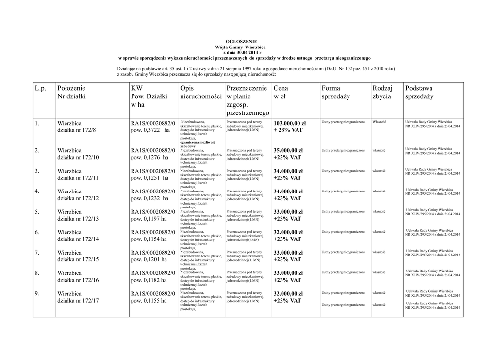 OGŁOSZENIE Wójta Gminy Wierzbica z dnia 30.04.2014 r w sprawie sporządzenia wykazu nieruchomości przeznaczonych do sprzedaży w drodze ustnego przetargu nieograniczonego Działając na podstawie art. 35 ust. 1 i 2 ustawy z dnia 21 sierpnia 1997 roku o gospodarce nieruchomościami (Dz.U. Nr 102 poz. 651 z 2010 roku) z zasobu Gminy Wierzbica przeznacza się do sprzedaży następującą nieruchomość: L.p. Położenie Nr działki KW Pow. Działki w ha Opis Przeznaczenie Cena nieruchomości w planie w zł zagosp. przestrzennego Forma sprzedaży Rodzaj zbycia Podstawa sprzedaży 1. Wierzbica działka nr 172/8 RA1S/00020892/0 pow. 0,3722 ha 2. Wierzbica działka nr 172/10 RA1S/00020892/0 pow. 0,1276 ha 3. Wierzbica działka nr 172/11 RA1S/00020892/0 pow. 0,1251 ha 4. Wierzbica działka nr 172/12 RA1S/00020892/0 pow. 0,1232 ha 5. Wierzbica działka nr 172/13 RA1S/00020892/0 pow. 0,1197 ha 6. Wierzbica działka nr 172/14 RA1S/00020892/0 pow. 0,1154 ha 7. Wierzbica działka nr 172/15 RA1S/00020892/0 pow. 0,1201 ha 8. Wierzbica działka nr 172/16 RA1S/00020892/0 pow. 0,1182 ha 9. Wierzbica działka nr 172/17 RA1S/00020892/0 pow. 0,1155 ha Niezabudowana, ukszałtowanie terenu płaskie, dostęp do infrastruktury technicznej, kształt prostokąta, ograniczona możliwość zabudowy Niezabudowana, ukszałtowanie terenu płaskie, dostęp do infrastruktury technicznej, kształt prostokąta, Niezabudowana, ukszałtowanie terenu płaskie, dostęp do infrastruktury technicznej, kształt prostokąta, Niezabudowana, ukszałtowanie terenu płaskie, dostęp do infrastruktury technicznej, kształt prostokąta, Niezabudowana, ukszałtowanie terenu płaskie, dostęp do infrastruktury technicznej, kształt prostokąta, Niezabudowana, ukszałtowanie terenu płaskie, dostęp do infrastruktury technicznej, kształt prostokąta, Niezabudowana, ukszałtowanie terenu płaskie, dostęp do infrastruktury technicznej, kształt prostokąta, Niezabudowana, ukszałtowanie terenu płaskie, dostęp do infrastruktury technicznej, kształt prostokąta, Niezabudowana, ukszałtowanie terenu płaskie, dostęp do infrastruktury technicznej, kształt prostokąta, Przeznaczona pod tereny zabudowy mieszkaniowej, jednorodzinnej (1.MN) 103.000,00 zł + 23% VAT Ustny przetarg nieograniczony Własność Uchwała Rady Gminy Wierzbica NR XLIV/295/2014 z dnia 25.04.2014 Przeznaczona pod tereny zabudowy mieszkaniowej, jednorodzinnej (1.MN) 35.000,00 zł +23% VAT Ustny przetarg nieograniczony własność Uchwała Rady Gminy Wierzbica NR XLIV/295/2014 z dnia 25.04.2014 Przeznaczona pod tereny zabudowy mieszkaniowej, jednorodzinnej (1.MN) 34.000,00 zł +23% VAT Ustny przetarg nieograniczony własność Uchwała Rady Gminy Wierzbica NR XLIV/295/2014 z dnia 25.04.2014 Przeznaczona pod tereny zabudowy mieszkaniowej, jednorodzinnej (1.MN) 34.000,00 zł +23% VAT Ustny przetarg nieograniczony własność Uchwała Rady Gminy Wierzbica NR XLIV/295/2014 z dnia 25.04.2014 Przeznaczona pod tereny zabudowy mieszkaniowej, jednorodzinnej (1.MN) 33.000,00 zł +23% VAT Ustny przetarg nieograniczony własność Uchwała Rady Gminy Wierzbica NR XLIV/295/2014 z dnia 25.04.2014 Przeznaczona pod tereny zabudowy mieszkaniowej, jednorodzinnej (!.MN) 32.000,00 zł +23% VAT Ustny przetarg nieograniczony własność Uchwała Rady Gminy Wierzbica NR XLIV/295/2014 z dnia 25.04.2014 Przeznaczona pod tereny zabudowy mieszkaniowej, jednorodzinnej (1. MN) 33.000,00 zł +23% VAT Ustny przetarg nieograniczony własność Uchwała Rady Gminy Wierzbica NR XLIV/295/2014 z dnia 25.04.2014 Przeznaczona pod tereny zabudowy mieszkaniowej, jednorodzinnej (1.MN) 33.000,00 zł +23% VAT Ustny przetarg nieograniczony własność Uchwała Rady Gminy Wierzbica NR XLIV/295/2014 z dnia 25.04.2014 Przeznaczona pod tereny zabudowy mieszkaniowej, jednorodzinnej (1.MN) 32.000,00 zł +23% VAT Ustny przetarg nieograniczony własność Uchwała Rady Gminy Wierzbica NR XLIV/295/2014 z dnia 25.04.2014 Ustny przetarg nieograniczony własność Uchwała Rady Gminy Wierzbica NR XLIV/295/2014 z dnia 25.04.2014 Niezabudowana, ukszałtowanie terenu płaskie, dostęp do infrastruktury technicznej, kształt prostokąta, Niezabudowana, ukszałtowanie terenu płaskie, dostęp do infrastruktury technicznej, kształt prostokąta, Przeznaczona pod tereny zabudowy mieszkaniowej, jednorodzinnej (1.MN) 30.000,00 zł +23% VAT Ustny przetarg nieograniczony własność Uchwała Rady Gminy Wierzbica NR XLIV/295/2014 z dnia 25.04.2014 Przeznaczona pod tereny zabudowy mieszkaniowej, jednorodzinnej (1.MN) 35.000,00 zł +23% VAT Ustny przetarg nieograniczony własność Uchwała Rady Gminy Wierzbica NR XLIV/295/2014 z dnia 25.04.2014 24.000,00 zł Ustny przetarg nieograniczony własność Uchwała Rady Gminy Wierzbica NR XLIV/295/2014 z dnia 25.04.2014 Tereny rolno – leśne (12.3.2R,RL) 57.000,00 zł Ustny przetarg nieograniczony własność Uchwała Rady Gminy Wierzbica Nr XLI/285/2014 z dnia 29.01.2014 kształt prostokąta, zadrzewiona, dostęp do drogi gruntowej Tereny rolno – leśne (12.3.2R,RL) 55.000,00 zł Ustny przetarg nieograniczony własność Uchwala Rady Gminy Wierzbica Nr XLI/283/2014 z dnia 29.01.2014 kształt prostokąta, zadrzewiona, dostęp do drogi gruntowej Tereny rolno – leśne (12.3.2R,RL) 20.000,00 zł Ustny przetarg nieograniczony własność Uchwała Rady Gminy Wierzbica Nr XLI/284/2014 z dnia 29.01.2014 33.000,00 zł Ustny przetarg nieograniczony własność Uchwała Rady Gminy Wierzbica Nr XLI/282/2014 z dnia 29.01.2014 10. Wierzbica działka nr 172/18 RA1S/00020892/0 pow. 0,1092 ha 11. Wierzbica działka nr 172/19 RA1S/00020892/0 pow. 0,1271 ha 12. Wierzbica działka nr 172/20 RA1S/00020892/0 pow. 1,3867 ha Przeznaczona pod tereny ukształtowanie terenu płaskie, upraw rolnych, ogrodniczych i kształt trapezu sadowniczych (1. R) 13. Wierzbica działka nr 1601/4 RA1S/00028866/5 pow. 1,6700 ha kształt prostokąta, 14. Wierzbica działka nr 1994 Wierzbica działka nr 2058/1 Ruda Wielka działk