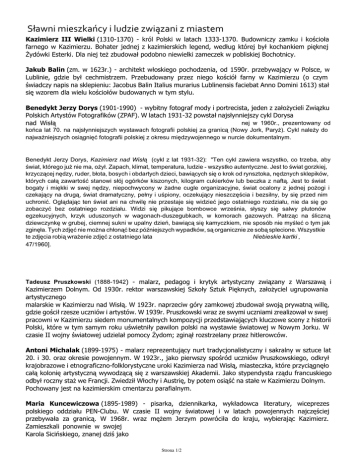 Sławni mieszkańcy i ludzie związani z miastem Kazimierz III Wielki (1310-1370) - król Polski w latach 1333-1370. Budowniczy zamku i kościoła farnego w Kazimierzu. Bohater jednej z kazimierskich legend, według której był kochankiem pięknej Żydówki Esterki. Dla niej też zbudował podobno niewielki zameczek w pobliskiej Bochotnicy. Jakub Balin (zm. w 1623r.) - architekt włoskiego pochodzenia, od 1590r. przebywający w Polsce, w Lublinie, gdzie był cechmistrzem. Przebudowany przez niego kościół farny w Kazimierzu (o czym świadczy napis na sklepieniu: Jacobus Balin Italius murarius Lublinensis faciebat Anno Domini 1613) stał się wzorem dla wielu kościołów budowanych w tym stylu. Benedykt Jerzy Dorys (1901-1990) - wybitny fotograf mody i portrecista, jeden z założycieli Związku Polskich Artystów Fotografików (ZPAF). W latach 1931-32 powstał najsłynniejszy cykl Dorysa nej w 1960r., prezentowany od nad Wisłą końca lat 70. na najsłynniejszych wystawach fotografii polskiej za granicą (Nowy Jork, Paryż). Cykl należy do najważniejszych osiągnięć fotografii polskiej z okresu międzywojennego w nurcie dokumentalnym. Benedykt Jerzy Dorys, Kazimierz nad Wisłą (cykl z lat 1931-32): "Ten cykl zawiera wszystko, co trzeba, aby świat, którego już nie ma, ożył. Zapach, klimat, temperatura, ludzie - wszystko autentyczne. Jest to świat gorzkiej, krzyczącej nędzy, ruder, błota, bosych i obdartych dzieci, bawiących się o krok od rynsztoka, nędznych sklepików, których całą zawartość stanowi słój ogórków kiszonych, kilogram cukierków lub beczka z naftą. Jest to świat bogaty i miękki w swej nędzy, niepochwycony w żadne cugle organizacyjne, świat ocalony z jednej pożogi i czekający na drugą, świat dramatyczny, pełny i uśpiony, oczekujący nieszczęścia i bezsilny, by się przed nim uchronić. Oglądając ten świat ani na chwilę nie przestaje się widzieć jego ostatniego rozdziału, nie da się go zobaczyć bez ostatniego rozdziału. Widzi się pikujące bombowce września, słyszy się salwy plutonów egzekucyjnych, krzyk uduszonych w wagonach-duszegubkach, w komorach gazowych. Patrząc na śliczną dziewczynkę w grubej, ciemnej sukni w upalny dzień, bawiącą się kamyczkiem, nie sposób nie myśleć o tym jak zginęła. Tych zdjęć nie można chłonąć bez późniejszych wypadków, są organicznie ze sobą splecione. Wszystkie te zdjęcia robią wrażenie zdjęć z ostatniego lata Niebieskie kartki , 47/1960]. Tadeusz Pruszkowski (1888-1942) - malarz, pedagog i krytyk artystyczny związany z Warszawą i Kazimierzem Dolnym. Od 1930r. rektor warszawskiej Szkoły Sztuk Pięknych, założyciel ugrupowania artystycznego malarskie w Kazimierzu nad Wisłą. W 1923r. naprzeciw góry zamkowej zbudował swoją prywatną willę, gdzie gościł rzesze uczniów i artystów. W 1939r. Pruszkowski wraz ze swymi uczniami zrealizował w swej pracowni w Kazimierzu siedem monumentalnych kompozycji przedstawiających kluczowe sceny z historii Polski, które w tym samym roku uświetniły pawilon polski na wystawie światowej w Nowym Jorku. W czasie II wojny światowej udzielał pomocy Żydom; zginął rozstrzelany przez hitlerowców. Antoni Michalak (1899-1975) - malarz reprezentujący nurt tradycjonalistyczny i sakralny w sztuce lat 20. i 30. oraz okresie powojennym. W 1923r., jako pierwszy spośród uczniów Pruszkowskiego, odkrył krajobrazowe i etnograficzno-folklorystyczne uroki Kazimierza nad Wisłą, miasteczka, które przyciągnęło całą kolonię artystyczną wywodzącą się z warszawskiej Akademii. Jako stypendysta rządu francuskiego odbył roczny staż we Francji. Zwiedził Włochy i Austrię, by potem osiąść na stałe w Kazimierzu Dolnym. Pochowany jest na kazimierskim cmentarzu parafialnym. Maria Kuncewiczowa (1895-1989) - pisarka, dziennikarka, wykładowca literatury, wiceprezes polskiego oddziału PEN-Clubu. W czasie II wojny światowej i w latach powojennych najczęściej przebywała za granicą. W 1968r. wraz mężem Jerzym powróciła do kraju, wybierając Kazimierz. Zamieszkali ponownie w swojej Karola Sicińskiego, znanej dziś jako Strona 1/2 sportretowała w wielu swoich dziełach literackich, m.in. w przezreż.AndrzejaBarańskiegow1993r.,w własnym domu w Kazimeirzu Dolnym. Została pochowana we wspólnym grobie z mężem na kazimierskim cmentarzu parafialnym. Edward Hartwig (1909-2003) - wybitny fotograf, który wywarł bardzo duży wpływ na rozwój polskiej fotografii w latach 60. i 70., członek Związku Polskich Artystów Fotografików. Interesował się malarstwem, co nie pozostało bez wpływu na jego twórczość fotograficzną. Uprawiał m.in. techniki szlachetne (złotobrom), którego używał do zdjęć z Kazimierza nad Wisłą - miasta, które szczególnie lubił. Daniel Olbrychski (ur.1945r.) - znakomity aktor teatralny i filmowy, mający na swym koncie ponad setkę wspaniałych kreacji. Związany z kilkoma największymi teatrami polskimi (m.in. Narodowym, Powszechnym). W jednym z wywiadów aktor zwierzył się: nagrody, życie w Nowym Jorku, Hollywood czy w Paryżu. Ale dobrze mi z tym, że mieszkam nad Wisłą. Z Kazimierzem Dolnym, a szczególnie pobliskim Mięćmierzem związany jest od lat, gdzie ma swój letni dom, jak sam mówi Jan Wołek (ur.1954r.) - poeta, malarz, muzyk, zawodowy artysta estradowy, jeden z luminarzy śpiewanej przez czołowych artystów polskiej estrady. Stypendysta i laureat nagród i odznaczeń (Stypendium Japan Foundation, Ministerstwa Kultury i Sztuki). Pejzażysta, który ukochał kazimierskie krajobrazy i architekturę, prezentujący swoją twórczość m.in. w galerii autorskiej GospodarzdwóchcykliprogramówdokumentalnychwTVP ostatni o Kazimierzu Dolnym i okolicach). Strona 2/2 Powered by TCPDF (www.tcpdf.org)