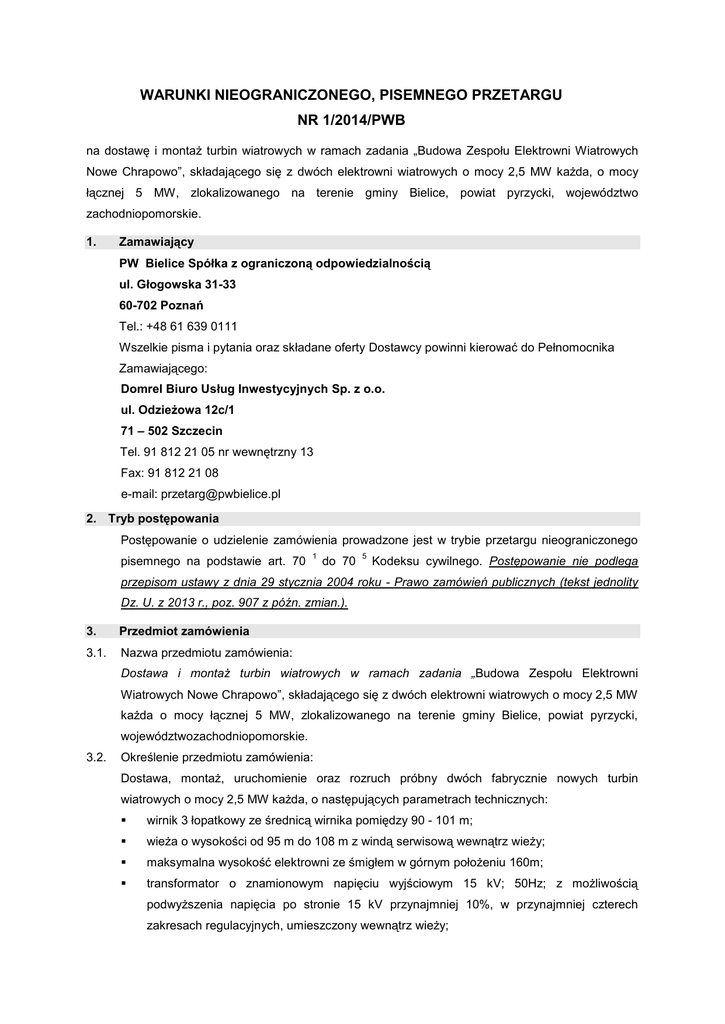 WARUNKI NIEOGRANICZONEGO, PISEMNEGO PRZETARGU NR 1/2014/PWB na dostawę i montaż turbin wiatrowych w ramach zadania „Budowa Zespołu Elektrowni Wiatrowych Nowe Chrapowo”, składającego się z dwóch elektrowni wiatrowych o mocy 2,5 MW każda, o mocy łącznej 5 MW, zlokalizowanego na terenie gminy Bielice, powiat pyrzycki, województwo zachodniopomorskie. 1. Zamawiający PW Bielice Spółka z ograniczoną odpowiedzialnością ul. Głogowska 31-33 60-702 Poznań Tel.: +48 61 639 0111 Wszelkie pisma i pytania oraz składane oferty Dostawcy powinni kierować do Pełnomocnika Zamawiającego: Domrel Biuro Usług Inwestycyjnych Sp. z o.o. ul. Odzieżowa 12c/1 71 – 502 Szczecin Tel. 91 812 21 05 nr wewnętrzny 13 Fax: 91 812 21 08 e-mail: [email protected] 2. Tryb postępowania Postępowanie o udzielenie zamówienia prowadzone jest w trybie przetargu nieograniczonego pisemnego na podstawie art. 70 1 do 70 5 Kodeksu cywilnego. Postępowanie nie podlega przepisom ustawy z dnia 29 stycznia 2004 roku - Prawo zamówień publicznych (tekst jednolity Dz. U. z 2013 r., poz. 907 z późn. zmian.). 3. Przedmiot zamówienia 3.1. Nazwa przedmiotu zamówienia: Dostawa i montaż turbin wiatrowych w ramach zadania „Budowa Zespołu Elektrowni Wiatrowych Nowe Chrapowo”, składającego się z dwóch elektrowni wiatrowych o mocy 2,5 MW każda o mocy łącznej 5 MW, zlokalizowanego na terenie gminy Bielice, powiat pyrzycki, województwozachodniopomorskie. 3.2. Określenie przedmiotu zamówienia: Dostawa, montaż, uruchomienie oraz rozruch próbny dwóch fabrycznie nowych turbin wiatrowych o mocy 2,5 MW każda, o następujących parametrach technicznych: wirnik 3 łopatkowy ze średnicą wirnika pomiędzy 90 - 101 m; wieża o wysokości od 95 m do 108 m z windą serwisową wewnątrz wieży; maksymalna wysokość elektrowni ze śmigłem w górnym położeniu 160m; transformator o znamionowym napięciu wyjściowym 15 kV; 50Hz; z możliwością podwyższenia napięcia po stronie 15 kV przynajmniej 10%, w przynajmniej czterech zakresach regulacyjnych, umieszczony wewnątrz wieży; rozdzielnica 15 kV w izolacji na poziomie min. 17,5 kV umieszczona wewnątrz wieży; wyposażenie w układ sterowania elektrowni; wyposażenie w system zdalnego nadzoru i kontroli; maksymalny dopuszczalny poziom hałasu u źródła do 107 dB(A) utrzymanie mocy biernej w zakresie 0,22 poj.≤ tg ≤ 0,22 ind. mierzonej po stronie 15 kV w punkcie przyłączenia do sieci dystrybucyjnej; dzienne i nocne oznakowania przeszkodowe zgodne z polskimi przepisami ; wyposażenie każdej z turbin w układ pomiaru energii zielonej montowany po stronie niskiego napięcia, przed transformatorem, zgodnie z wymaganiami polskich przepisów; zgodność z wymaganiami i parametrami pracy elektrowni określonymi w Instrukcji Ruchu i Eksploatacji Sieci Dystrybucyjnej Enea Operator S.A.; 3.3. instalacja odgromowa; turbiny powinny posiadać atesty i certyfikaty niezbędne do ich montażu. Przedmiotem zamówienia jest: dostawa i montaż dwóch fabrycznie nowych turbin wiatrowych zgodnych z wymaganiami niniejszych warunków przetargu określonymi w pkt 3.2; dostawa pierścieni fundamentowych wraz ze stopami montażowymi (elementów kotwiących) przeznaczonych do wbudowania w fundament i umożliwiających montaż wieży elektrowni wiatrowej na fundamencie; uruchomienie farmy wiatrowej; dostawa, montaż i podłączenie systemu wczesnego wykrywania możliwych awarii komponentów turbiny; 3.4. wykonanie i podłączenie kompletnej instalacji odgromowej; dostawa i podłączenie systemu zdalnej kontroli farmy wiatrowej. Pozostałe obowiązki i czynności Dostawcy wchodzące w zakres zamówienia, to m.in.: a) wykonywanie robót zgodnie z wymogami Prawa budowlanego, obowiązującymi przepisami i normami oraz zasadami sztuki budowlanej, wymogami ochrony środowiska, BHP; b) właściwe zagospodarowanie, zabezpieczenie i oznakowanie placu budowy – zgodnie z wymaganiami Prawa budowlanego; c) sporządzenie przewidzianych Prawem budowlanym właściwych planów, informacji i ogłoszeń dotyczących bezpieczeństwa pracy i ochrony zdrowia; d) wywózka elementów zdemontowanych lub niewykorzystanych materiałów, niemożliwych do wykorzystania na miejscu budowy oraz ich unieszkodliwienie zgodnie z właściwymi obowiązującymi przepisami; e) uporządkowanie terenu po zakończeniu robót w zakresie robót wynikającym z realizacji przedmiotu zamówienia, f) zapewnienie kierownika montażu spełniającego wymagania określone w punkcie 4.2 lit. a; g) przygotowanie i dostarczenie Zamawiającemu dokumentacji powykonawczej; 3.5. 4. Gwarancja: a) wymagany okres gwarancji i konserwacji na przedmiot zamówienia 2 lata, b) gwarancja krzywej mocy, c) gwarancja emisji hałasu. Warunki udziału w postępowaniu i warunki zamówienia Warunkiem ubiegania się o zamówienie jest przyjęcie przez Dostawcę pełnego zakresu i wymogów zadania opisanego w punkcie 3 (Przedmiot zamówienia) oraz przyjęcie poniższych warunków udziału w postępowaniu i warunków zamówienia. Warunki udziału w postępowaniu oraz opis sposobu dokonywania oraz oceny spełnienia tych warunków na zasadzie spełnia /nie spełnia wymaganego warunku określa się następująco: 4.1. Wiedza i doświadczenie: O zamówienie mogą ubiegać się Dostawcy, którzy wykażą zrealizowanie (ukończenie) w okresie ostatnich pięciu lat, a jeżeli okres działalności Dostawcy jest krótszy – w tym okresie, robót polegających na dostawie i montażu turbin wiatrowych w łącznej liczbie min. 20 szt., o mocy nominalnej pojedynczej turbiny nie mniejszej niż 2,5 MW. Zamawiający uzna ten warunek za spełniony, jeśli Oferent przedłoży Zamawiającemu wraz z ofertą zestawienie zawierające liczbę, miejsca zamontowanych urządzeń oraz terminy wykonania. 4.2. Potencjał techniczny – pracownicy: O zamówienie mogą ubiegać się Dostawcy, którzy dysponują kadrą kierowniczą z uprawnieniami do kierowania robotami budowla