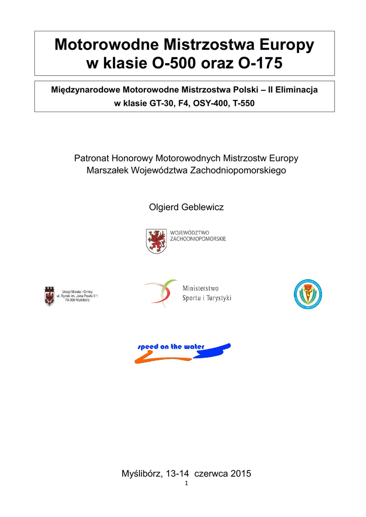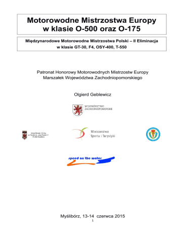 Motorowodne Mistrzostwa Europy w klasie O-500 oraz O-175 Międzynarodowe Motorowodne Mistrzostwa Polski – II Eliminacja w klasie GT-30, F4, OSY-400, T-550 Patronat Honorowy Motorowodnych Mistrzostw Europy Marszałek Województwa Zachodniopomorskiego Olgierd Geblewicz Myślibórz, 13-14 czerwca 2015 1 Szanowni Państwo! Już po raz dziesiąty Myślibórz zaprasza zawodników i sympatyków sportów motorowodnych na niezwykle widowiskową imprezę sportową. W dniach 13-14 czerwca 2015 r. Jezioro Myśliborskie będzie gościć uczestników Motorowodnych Mistrzostw Europy w klasie O-500 oraz O-175, a także II Eliminacji Międzynarodowych Motorowodnych Mistrzostw Polski. Z radością witamy w grodzie nad Myślą wszystkich, którzy oprócz wrażeń sportowych będą mieli okazję poznać nasze piękne miasto, dostojne zabytki i życzliwych mieszkańców. Jestem przekonany, że dzięki pasji wielu ludzi i pomocy finansowej sponsorów zawody będą doskonale zorganizowane i przeprowadzone. Dziękuję za to wszystkim, którzy w ten sposób przyczyniają się do tworzenia pozytywnego wizerunku naszej gminy i jej promocji w kraju i za granicą. Burmistrz Miasta i Gminy Myślibórz Piotr Sobolewski Dziesiąta edycja organizowanych Mistrzostw Europy i II Eliminacji Mistrzostw Polski w Myśliborzu w 2015 roku to tradycyjne już miejsce spotkania i sportowej rywalizacji zawodników o medale w mistrzowskich klasach sportów motorowodnych. Gospodarze Miasta i Powiatu tradycyjnie dołożyli starań by poziom sportowych zmagań jak i oprawa Mistrzostw w ramach obchodów „Dni Myśliborza” był wysoki, niezawodny, atrakcyjny i bezpieczny. Zawodnicy i ekipy poza trofeami Mistrzostw jak sądzę wywiozą moc wrażeń, satysfakcji, wspomnień z podtrzymanych i nawiązanych przyjaźni. Życzę zawodnikom i ekipom sukcesów w sportowej rywalizacji, satysfakcji z osiągniętych wyników, bezpiecznych startów i bezawaryjnych dopłynięć do mety. SPORTOWEJ WALKI FAIR PLAY!!! Sponsorom i działaczom składam podziękowanie za wniesione wsparcie i trud w organizację Mistrzostw. Kibicom, widzom i pasjonatom sportów motorowodnych życzę dobrej pogody, emocji sportowych, zadowolenia z udziału naszej imprezie. Komandor Mistrzostw Andrzej Olszewski 2 Motorowodne Mistrzostwa Europy w klasie O-500 oraz O-175 Międzynarodowe Motorowodne Mistrzostwa Polski I Eliminacja Myślibórz, 13-14 czerwca 2015 Patronat Honorowy Motorowodnych Mistrzostw Europy Marszałek Województwa Zachodniopomorskiego objął Olgierd Geblewicz Komitet Honorowy Marek Tałasiewicz Wojewoda Zachodniopomorski Jarosław Rzepa Członek Zarządu Województwa Zachodniopomorskiego Arkadiusz Janowicz Starosta Myśliborski Roman Wąsik Przewodniczący Rady Miejskiej w Myśliborzu Andrzej Marcinkowski Prezes PZMWiNW Paweł Szabelewski Sekretarz Generalny PZMWiNW Anna Sulima Indywidualna i Drużynowa Mistrzyni Świata w Pięcioboju Nowoczesnym 3 Komitet organizacyjny Piotr Sobolewski Przewodniczący Komitetu Organizacyjnego Burmistrz Miasta i Gminy Myślibórz Andrzej Olszewski Komandor Zawodów Andrzej Zieliński Szczeciński Klub Motorowodny LOK Izabella Downarowicz Urząd Miasta i Gminy Myślibórz Organizatorzy: Polski Związek Motorowodny i Narciarstwa Wodnego Urząd Miasta i Gminy w Myśliborzu Szczeciński Klub Motorowodny LOK „HARPUN” Klub Motorowodny Myślibórz Współorganizatorzy: Międzyszkolny Klub Sportowy „Szkuner” Ośrodek Sportu i Rekreacji w Myśliborzu Myśliborski Ośrodek Kultury w Myśliborzu Ochotnicza Straż Pożarna w Myśliborzu Państwowa Powiatowa Straż Pożarna w Myśliborzu Przedsiębiorstwo Gospodarki Komunalnej i Mieszkaniowej w Myśliborzu Wodne Ochotnicze Pogotowie Ratunkowe O/Myślibórz „Szkuner” Sp. z o.o. Myślibórz Komenda Powiatowa Policji w Myśliborzu Wojewódzka Stacja Pogotowia Ratunkowego O/Myślibórz 4 REGULAMIN ZAWODÓW 13 – 14 VI 2015 MYŚLIBÓRZ 1. ORGANIZATORZY 1.1. Organizatorzy: - Polski Związek Motorowodny i Narciarstwa Wodnego - Szczeciński Klub Motorowodny LOK - Urząd Miasta i Gminy Myślibórz - Harpun Klub Motorowodny Myślibórz Współorganizatorzy: - MKS „Szkuner” Myślibórz - Urząd Marszałkowski Województwa Zachodniopomorskiego - Ośrodek Sportu i Rekreacji w Myśliborzu - Myśliborski Ośrodek Kultury w Myśliborzu - Ochotnicza Straż Pożarna w Myśliborzu - Państwowa Powiatowa Straż Pożarna w Myśliborzu - Przedsiębiorstwo Gospodarki Komunalnej i Mieszkaniowej w Myśliborzu - Wodne Ochotnicze Pogotowie Ratunkowe O/Myślibórz - „Szkuner” Sp. z o.o. Myślibórz - Komenda Powiatowa Policji w Myśliborzu - Wojewódzka Stacja Pogotowia Ratunkowego O/Myślibórz 2. TERMIN I MIEJSCE ZAWODÓW Zawody zostaną rozegrane zgodnie z kalendarzem UIM i MMP 2014 w dniach 13-14 czerwca 2015 r. na jeziorze Myśliborskim. 5 3. SERIE I KLASY 3.1. Motorowodne Mistrzostwa Europy w klasie O-500 oraz O-175 3.2. Międzynarodowe Mistrzostwa Polski w klasie: OSY-400, F4, T-550, GT-30. 4. WYŚCIGI 4.1. Wyścigi rozegrane zostaną zgodnie z przepisami Regulaminu UIM, Regulaminu MMP 2015 oraz niniejszego Regulaminu. 4.2. Trasa zawodów będzie obwodem zamkniętym i przebiegać będzie zgodnie z załączonym planem. Obwód trasy wynosi 1500 metrów. 4.3. W klasie Mistrzostw Europy O-500 oraz O-175 odbędą się 4 biegi, z których trzy najlepsze liczą się do klasyfikacji końcowej. 4.4. W pozostałych klasach zostaną rozebrane 3 biegi – wszystkie zaliczane do punktacji końcowej. 4.5. Klasy, ilość okrążeń, długość biegów. DYSTANS ILOŚĆ DYSTANS długość 1 okrążenia (1500 m) KLASA BIEGÓW OKRĄŻEŃ OKRĄŻEŃ x ilość okrążeń BEZPIECZEŃŚTWA O-500 O-175 GT-30 F4 OSY-400 T-550 4 4 3 3 3 3 8 8 8 8 5 8 1 1 1 1 1 1 12 000 m 12 000 m 12 000 m 12 000 m 7 500 m 12 000 m UWAGA: pierwsze przejście linii mety po starcie zalicza pierwsze okrążenie. 4.6. We wszystkich klasach obowiązuje po wymachaniu flagą mety jedno okrążenie bezpieczeństwa. 6 4.7. Łódź, kt