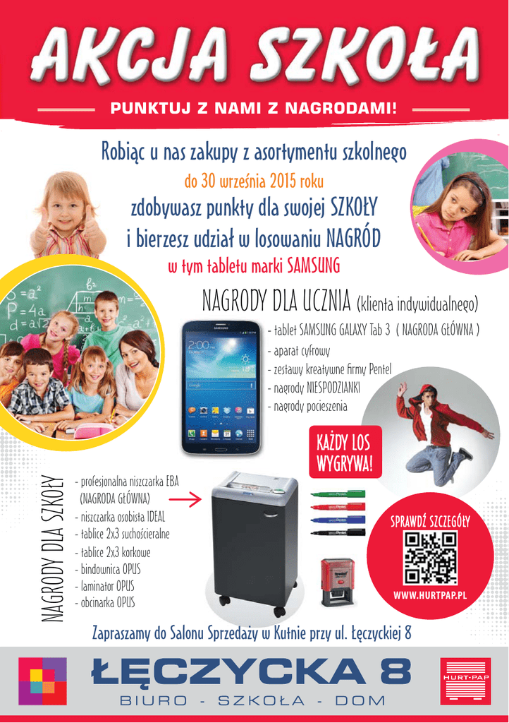 PUNKTUJ Z NAMI Z NAGRODAMI! Robiąc u nas zakupy z asortymentu szkolnego do 30 września 2015 roku zdobywasz punkty dla swojej SZKOŁY i bierzesz udział w losowaniu NAGRÓD w tym tabletu marki SAMSUNG NAGRODY DLA UCZNIA (klienta indywidualnego) NAGRODY DLA SZKOŁY - tablet SAMSUNG GALAXY Tab 3 ( NAGRODA GŁÓWNA ) - aparat cyfrowy - zestawy kreatywne firmy Pentel - nagrody NIESPODZIANKI - nagrody pocieszenia - profesjonalna niszczarka EBA (NAGRODA GŁÓWNA) - niszczarka osobista IDEAL - tablice 2x3 suchościeralne - tablice 2x3 korkowe - bindownica OPUS - laminator OPUS - obcinarka OPUS KAŻDY LOS WYGRYWA! SPRAWDŹ SZCZEGÓŁY WWW.HURTPAP.PL Zapraszamy do Salonu Sprzedaży w Kutnie przy ul. Łęczyckiej 8 PUNKTUJ Z NAMI Z NAGRODAMI! Długopis SXN-101 UNI Kredki Pastele olejne 12 kolorów 44,93 933 zł 3,69 zł 10,96 10 96 zł 5,98 zł Nożyczki Donau 13,5 cm 33,14 14 zł 2,31 zł Klej AMOS 15g 33,27 27 zł Kredki Bambino 6 kolorów w drewnie 2,95 zł 99,67 67 zł 8,38 zł Teczka z gumką Donau Okładki Biurfol 22,18 18 zł 00,62 62 zł 1,62 zł 0,40 zł Tusz Black Point nr 650 31,55 31 55 zł Plecak Bambino 24,48 zł 107,63 107 63 zł 80,72 zł Blok rysunkowy Bambino 20 kartek 11,83 83 zł 1,45 zł Korektor Q-CONNECT myszka Klej Astra 50 ml Tuba Zeszyt 60 kartek - kratka 22,04 04 zł 11,48 48 złł 1,61 zł 0,69 zł 55,56 56 zł 4,31 zł Tablica korkowa firmy 2x3 - 40x60 cm 16,38 16 38 zł 12,29 zł Partnerzy AKCJI: OPUS, Trodat, Black Point, PBS, 2x3, KW Trade, Pentel Promocja trwa do 30 września 2015 r. lub wyczerpania zapasów. Salon HURT-PAP czynny codziennie e w godz. 8 - 17 w soboty 9 - 14 tel. 24 254 79 11 [email protected] Podane ceny są cenami BRUTTO