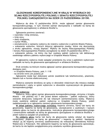 GŁOSOWANIE KORESPONDENCYJNE W KRAJU W WYBORACH DO SEJMU RZECZYPOSPOLITEJ POLSKIEJ I SENATU RZECZYPOSPOLITEJ POLSKIEJ ZARZĄDZONYCH NA DZIEŃ 25 PAŹDZIERNIKA 2015R. Wyborca do dnia 12 października 2015r. może zgłaszać zamiar głosowania korespondencyjnego, w tym również zamiar skorzystania z nakładki na kartę do głosowania sporządzonej w alfabecie Braille’a. Zgłoszenie powinno zawierać: • nazwisko i imię (imiona), • imię ojca, • datę urodzenia, • numer PESEL, • oświadczenie o wpisaniu wyborcy do rejestru wyborców w gminie Miasto Puławy, • wskazanie wyborów, których dotyczy zgłoszenie (osoby, które nie skorzystają z druku zgłoszenia, muszą dopisać: Wybory do Sejmu Rzeczypospolitej Polskiej i Senatu Rzeczypospolitej Polskiej zarządzone na dzień 25 października 2015r.) • wskazanie adresu, na który ma być wysłany pakiet wyborczy lub deklarację osobistego odbioru pakietu wyborczego w Urzędzie Miasta Puławy. W zgłoszeniu wyborca może zażądać przesłania mu wraz z pakietem wyborczym nakładek na karty do głosowania sporządzonych w alfabecie Braille'a. Druk wniosku na którym można zgłaszać zamiar głosowania korespondencyjnego dostępny jest: - w Urzędzie Miasta Puławy, pok.1 i 118 - na stronie www.um.pulawy.pl Zgłoszenie może być dokonane ustnie (osobiście lub telefonicznie), pisemnie, faksem lub w formie elektronicznej. Wyborca zostanie skreślony ze spisu w obwodzie właściwym dla miejsca stałego zamieszkania i ujęty w spisie wyborców w obwodzie wyznaczonym do głosowania korespondencyjnego. Pakiet wyborczy Wyborca, który zgłosi zamiar głosowania korespondencyjnego, otrzyma z Urzędu Miasta – nie później niż 7 dni przed dniem wyborów – pakiet wyborczy, który zostanie doręczony wyłącznie do rąk własnych zainteresowanej osoby. Wyborca może osobiście odebrać pakiet wyborczy w Urzędzie Miasta Puławy, jeżeli zadeklarowała to w zgłoszeniu zamiaru głosowania korespondencyjnego. W skład pakietu wyborczego wchodzą: koperta zwrotna, karta lub karty do głosowania, koperta na kartę do głosowania, oświadczenie o osobistym i tajnym oddaniu głosu na karcie do głosowania, instrukcja głosowania korespondencyjnego i ewentualnie nakładki na kartę do głosowania sporządzone w alfabecie Braille'a — jeżeli wyborca zażądał ich przesłania. Po oddaniu głosu kartę lub karty do głosowania należy włożyć do koperty oznaczonej „Koperta na kartę do głosowania” i kopertę tę zakleić. Następnie włożyć ją do koperty zwrotnej zaadresowanej do wskazanej Obwodowej Komisji Wyborczej w Puławach. Nie zaklejenie koperty na kartę do głosowania spowoduje, że karta ta nie będzie uwzględniona przy ustalaniu wyników głosowania. Do koperty zwrotnej należy także włożyć oświadczenie o osobistym i tajnym oddaniu głosu. Niewłożenie do koperty zwrotnej podpisanego oświadczenia spowoduje, że karta do głosowania nie będzie uwzględniona przy ustalaniu wyników głosowania. Po oddaniu głosu wyborca może doręczyć kopertę zwrotną w następujący sposób: 1) przed dniem głosowania może osobiście dostarczyć kopertę zwrotną do Urzędu Miasta Puławy pok.118 w godzinach pracy Urzędu. Upoważniony pracownik Urzędu dokona odbioru koperty i odpowiednio ją zabezpieczy. 2) w dniu głosowania osobiście dostarczyć kopertę zwrotną do obwodowej komisji wyborczej, której adres znajduje się na w/w kopercie. 3) przekazać przedstawicielowi wyznaczonego operatora poczty za pokwitowaniem: • w placówce pocztowej usytuowanej na obszarze Miasta Puławy najpóźniej w przedostatnim dniu roboczym poprzedzającym dzień wyborów, tj. do 22 października 2015r. • w dowolnej placówce pocztowej najpóźniej w trzecim dniu roboczym poprzedzającym dzień wyborów, do dnia 21 października 2015r. • wyborca niepełnosprawny może zgłosić potrzebę odbioru koperty zwrotnej pod wskazanym przez siebie adresem. Odbiór następuje najpóźniej w przedostatnim dniu roboczym poprzedzającym dzień wyborów, tj. do 22 października 2015r. Jeżeli wyborca złoży oświadczenie o rezygnacji z głosowania korespondencyjnego możliwe jest wydanie mu zaświadczenia o prawie do głosowania lub dopuszczenie do głosowania osobistego w lokalu wyborczym pod warunkiem zwrotu pakietu wyborczego w stanie nienaruszonym. W takiej sytuacji wyborca będzie głosował w obwodzie w którym został dopisany do spisu wyborców w związku ze zgłoszeniem zamiaru głosowania korespondencyjnego. Głosować korespondencyjnie nie mogą wyborcy: • umieszczeni w spisach wyborców w obwodach głosowania utworzonych w zakładach opieki zdrowotnej, domach pomocy społecznej, zakładach karnych i aresztach śledczych oraz domach studenckich, a także w obwodach głosowania utworzonych za granicą i na polskich statkach morskich, • wyborcy, którzy udzielili pełnomocnictwa do głosowania. Dane do kontaktów w sprawie głosowania korespondencyjnego: mail:[email protected] fax:81 458 61 99 tel.81 458 61 06 lub 81 458 61 07 adres: Urząd Miasta Puławy, ul. Lubelska 5,24-100 Puławy ……...………….., dnia ………….…….. (miejscowość) (data) ZGŁOSZENIE ZAMIARU GŁOSOWANIA KORESPONDENCYJNEGO NAZWISKO IMIĘ (IMIONA) IMIĘ OJCA DATA URODZENIA NR PESEL ADRES STAŁEGO ZAMIESZKANIA, NA KTÓRY BĘDZIE WYSŁANY PAKIET WYBORCZY Oświadczenie Oświadczam, iż jestem wpisany do rejestru wyborców w gminie/mieście/dzielnicy: …………………………………….……………………………………………………………………………………………………………. (nazwa gminy/miasta/dzielnicy m. st. Warszawy) ……………………………………………. (podpis wyborcy) Zgłoszenie dotyczy wyborów (odpowiednie zaznaczyć): □ Sejm RP i Senat RP □ □ Prezydent RP □ Parlament Europejski □ Samorząd terytorialny Proszę o dołączenie do pakietu wyborczego nakładki na kartę(y) do g