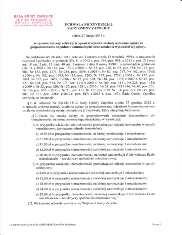 RADA GMlNY zAPOLlcE ul. Plac Strażacki 5 9a- 161 zAPo LICE pow. zdi] ńs kowol§ki, Woj. łódzkie UCHWAŁA NR XxY II l 202 l 13 RADY GMINY ZAPOLICE z dnia 27 lutego 20l 3 r. w sprawie zmiany uchwaĘ w sprawie wyboru metody ustalenia opłaĘ za gospodarowanie odpadami komunalnymi oraz ustalenia łysokościtej opłaĘ. Na podstawie ań. 6k ust.l pkt l oraz ust. 3 ustawy z dnia 13 września 1996 r. o utrzymaniu czystości i porządku w gminach (Dz. U. z2012 r. poz.391, poz.951; zż013 r, poz.2l) oraz ań. 18 ust. 2 pkt. 15 i art. 40 ust, l ustawy z dnia 8 marca 1990 r. o samorządzie gminnym (Dz.U. z2001 r. Nr 142, poz. 1591;zżOOżr. Nr23, poz.220,Nr 62, poz. 558, Nr ll3, poz. 984, Nr 153, poz. l27l, Nr 214, poz. 1806; z 2003 r. Nr 80, poz.717, Nr 162, poz. l568; z 2004 r. Nr l02, poz. 1055, Nr 116, poz. 1203, Nr |67, poz. 1759; zż005 r. Nr l72, poz. 1441, Nr 175, poz. 1457; z 2006 r. Nr 17, poz. 128, Nr l8l, poz, 1337; z ż007 r. Nr 48, poz. 327, Nr 138, poz.974, Nr 173, poz. l21; z ż008 r, Nr l80, poz. 1l l1, Nr 223, poz. 1458; z 2009 r. Nr 52, poz. 420, Nr l57, poz. 1ż41;' z20|0 r. Nr 28, poz. l42 i 146, Nr 40, poz.230, Nr 106, poz. 675; z2011 r. Nr 21, poz. l l3, Nr 1l7, poz. 679, Nr l34, poz.777, Nr l49, poz. 887, Nr 2l7, poz. I28I; z2012t. poz. 567; z20l3 r. poz. 153), Rada Gminy Zapolice uchwala, co następuje: § t. W uchwale Nr XXVl/l75ll2 Rady Gminy Zapolice z dnia ż7 grudnia 2012 r, w sprawie wyboru metody ustalenia opłaly za gospodarowanie odpadami komunalnymi oraz ustalenia wysokości tej opłaty, zmienia się § 2 uchwĄ, który otrzymuje brzmienie: ,,§ 2. Ustala się stawkę opłaly za gospodarowanie odpadami komunalnymi dla nieruchomości, na której zamieszkują mieszkańcy w wysokości: l) w przypadku właścicielinieruchomości gromadzących odpady komunalne w sposób nieselektywny (zmieszane odpady komunalne): a) 10,50 złw pnypadku nieruchomości, na której zamieszkuje 1 mieszkaniec; b) 21,00 zł w przypadku nieruchomości, na której zamieszkuje 2 mieszkańców; c) 31,50 ńw ptzypadku nieruchomości, na której zamieszkuje 3 mieszkańców; d) 42,00 złw przypadku nieruchomości, na której zamieszkuje 4 mieszkańców; e) 50,00 zł w przypadku nieruchomości, na której zamieszkuje 5 lub większa liczba . mieszkańców - nie dotyczy spółdzielni mieszkaniowej. 2)w przrypadku właścicielinieruchomości gromadzących odpady komunalne w sposób selekĘwny: a) 6,00 zł w przypadku nieruchomości, na której zamieszkuje 1 mieszkaniec; b) 12,00 zł w przypadku nieruchomości, na której zamieszkuje 2 mieszkańców; c) 18,00 zł w przypadku nieruchomości, na której zamieszkuje 3 mieszkańców; d) 24,00 złw ptzypadku nieruchomości, na któĘ zamieszkuje 4 mieszkańców; zł w przypadku nieruchomości, na której zamieszkuje 5 lub większa liczba mieszkańców - nie dotyczy spółdzielni mieszkaniowej.". e) 27,00 § 2. Wykonanie Id: uchwĄ powierza BE96C79A-5Dl0-4780-AEFE-8E81 1BA48l 39. Podpisany się Wójtowi Gminy Zapolice. stlona 1 Gminy ogłoszenia w Dzienniku § 3. Uchwała podlega ogłoszeniu na tablicy ogłoszeń i stronie intemetowej Urzędu Zapo|ice i wchodzi wżycie po upływie 14 dni od dnia Urzędowym Województwa Łódzkiego. jej Przewodniczący Rady Gminy Zapolice 4 ,| //(. r(z.ie ł Wadysław Majewski Id: BE96C79A-5D10-4780-AEFE-8E8l lBA48139. Podpisany strona 2