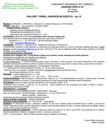 Środowiskowy Klub Badmintonowy (Badminton Open Club) „HARCOWNIK” 02-793 Warszawa; ul. Lasek Brzozowy 16/19 KOMUNIKAT ORGANIZACYJNY TURNIEJU „WARSAW OPEN U-16’’ (XXI edycja) 29 maja 2011r. KRAJOWY TURNIEJ JUNIORÓW MŁODSZYCH – kat. IX MIEJSCE: WARSZAWA – URSYNÓW, ul. Mandarynki 1; Szkoła Podstawowa nr.330 (5 kortów) TERMIN: 29.05 .2011 - Gry zawodników z licencjami PZBad: HARMONOGRAM TURNIEJU: – Odprawa g. 9.30 w niedzielę 29.05.2011r. – Początek gier nie wcześniej niŜ o g. 10.00 – Zakończenie gier najpóźniej 30.05.2010 o g. 12.00 ZGŁOSZENIA: zgłoszenia do zawodów zawierające numer licencji w kaŜdej z gier oraz zapotrzebowanie na noclegi przyjmowane są do dnia godz 24:00 23.05.2011r. telefaksem: nr. 0 /.../ 22- 621-91-62 + „dla Mazowieckiego OZBad.” e-mail: [email protected] LOSOWANIE : 27.05.2011 r. o godzinie 20.00. Bogatki koło Piaseczna ul. Królewska 63 O ewentualnych zmianach w liście zgłoszeń np. potwierdzonych absencjach graczy itp. prosimy informować sędziego głównego w formie pisemnej na adres [email protected] do godz. 18.00 dnia 27.05, aby jak najbardziej zbliŜyć skład turnieju określony w losowaniu do składu, który realnie wystąpi. SYSTEM ROZGRYWANIA ZAWODÓW : Podobnie jak w ubiegłym roku, Turniej Masters będzie miał charakter turnieju otwartego bez limitów zgłoszeń. Rodzaje gier: gry pojedyncze, gry podwójne i gra mieszana gry pojedyncze- system grupowo - pucharowy : w grach pojedynczych- w rundzie pucharowej grają wszyscy zawodnicy z rundy grupowej. Przy liczbie zawodników do 26 systemem pośrednim; powyŜej 26 zawodników systemem zwykłym pucharowym (pierwsi z grupy razem ze sobą, drudzy z grupy razem ze sobą itd.) gry podwójne - system do dwóch przegranych: z obowiązującymi załoŜeniami: - m. I zajmuje para bez Ŝadnej przegranej w turnieju, a m. II para z jedną przegraną; - wśród par, które raz przegrały, a spotkały się ponownie, nie zalicza się wyniku poprzedniego meczu. Mecze będą rozgrywane: do 21p. w secie. WPISOWE: w grach pojedynczych 23,- zł / 1 zaw. w grach podwójnych 23 ,- zł / 1 zaw. /1 gra (46 zł /1 para ) ZAKWATEROWANIE: PTSM Warszawa ul. Karolkowa 53a ; około 22,- zł / 1 os. Zapotrzebowanie na noclegi – prosimy podać w terminie zgłoszenia zawodników do turnieju. W innej sytuacji organizator nie moŜe zagwarantować rezerwacji miejsc noclegowych. WYśYWIENIE: obiady na miejscu zawodów zamawiane w dniu zawodów do godz. 13.00 (moŜliwość wyboru potraw) w cenie ok. 15,- zł; poza tym – dania bufetowe przy hali turniejowej oraz posiłki w PTSM na osobne – bezpośrednie zamówienie w PTSM. ORGANIZATOR I ŁĄCZNOŚĆ: ŚRODOWISKOWY KLUB BADMINTONOWY „HARCOWNIK” Warszawa . adres do korespondencji : 02-649 Warszawa ul.Marzanny 6 m. 41; tel. 0-793 079 514. /Marek Czapliński – prezes klubu/; Organizację zawodów wspierają: Dzielnica Warszawa Ursynów SĘDZIA GŁÓWNY ZAWODÓW – TOMASZ ROGOWSKI KONTAKT W DNIU ZAWODÓW : tel. 0-502 276 781 – sędzia główny NAGRODY: Po zakończeniu turnieju i podliczeniu punktacji za cały sezon najlepsza trójka zawodników (par) w kaŜdej z gier otrzyma medale. Natomiast szerokie czołówki zawodników w kaŜdej z gier otrzymają nagrody rzeczowe o wartości adekwatnej do zajętego miejsca (sprzęt i odzieŜ przede wszystkim firmy Wilson). DOJAZD NA MIEJSCE ZAWODÓW: z centrum Warszawy metrem (st.”Centrum” ok. 400 m. od Dw.PKP. W-wa Centralna) do st. „Natolin” (kierunek południowy- „Kabaty”), a następnie ok.350 m. w kierunku wschodnim do SP. nr. 330 (os.Natolin – Wolica). Dojazd pojazdem własnym najlepszy od ul.Rosoła . Prezes ŚKBad „Harcownik” Marek Czapliński
