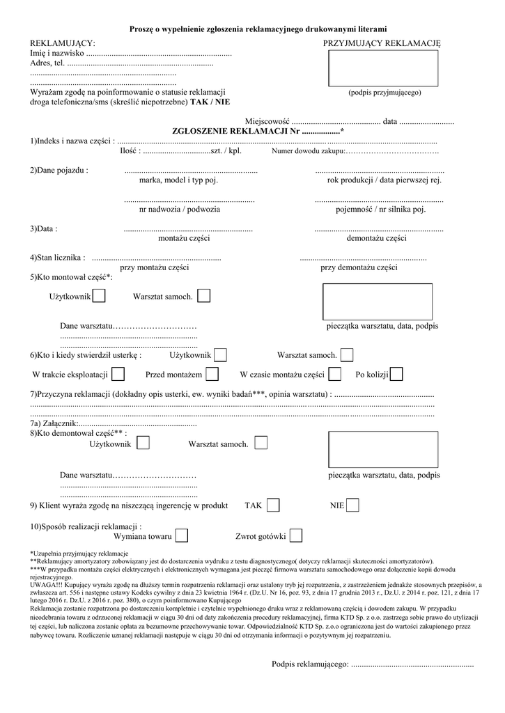 Proszę o wypełnienie zgłoszenia reklamacyjnego drukowanymi literami REKLAMUJĄCY: Imię i nazwisko ..................................................................... Adres, tel. ..................................................................... ..................................................................... ..................................................................... Wyrażam zgodę na poinformowanie o statusie reklamacji droga telefoniczna/sms (skreślić niepotrzebne) TAK / NIE PRZYJMUJĄCY REKLAMACJĘ (podpis przyjmującego) Miejscowość .......................................... data .......................... ZGŁOSZENIE REKLAMACJI Nr ..................* 1)Indeks i nazwa części : ................................................................................................... .................................................... Ilość : ................................szt. / kpl. Numer dowodu zakupu:………………………………. 2)Dane pojazdu : 3)Data : ............................................................... marka, model i typ poj. ............................................................. rok produkcji / data pierwszej rej. .............................................................. nr nadwozia / podwozia ............................................................. pojemność / nr silnika poj. ............................................................. montażu części ............................................................. demontażu części 4)Stan licznika : ............................................................. przy montażu części 5)Kto montował część*: Użytkownik ............................................................ przy demontażu części Warsztat samoch. Dane warsztatu………………………… ................................................................. ................................................................. 6)Kto i kiedy stwierdził usterkę : Użytkownik W trakcie eksploatacji Przed montażem pieczątka warsztatu, data, podpis Warsztat samoch. W czasie montażu części Po kolizji 7)Przyczyna reklamacji (dokładny opis usterki, ew. wyniki badań***, opinia warsztatu) : ............................................... ................................................................................................................................... ............................................................ ............................................................................................................................................................................................... 7a) Załącznik:........................................................ 8)Kto demontował część** : Użytkownik Warsztat samoch. Dane warsztatu………………………… ................................................................. ................................................................. 9) Klient wyraża zgodę na niszczącą ingerencję w produkt 10)Sposób realizacji reklamacji : Wymiana towaru pieczątka warsztatu, data, podpis TAK NIE Zwrot gotówki *Uzupełnia przyjmujący reklamacje **Reklamujący amortyzatory zobowiązany jest do dostarczenia wydruku z testu diagnostycznego( dotyczy reklamacji skuteczności amortyzatorów). ***W przypadku montażu części elektrycznych i elektronicznych wymagana jest pieczęć firmowa warsztatu samochodowego oraz dołączenie kopii dowodu rejestracyjnego. UWAGA!!! Kupujący wyraża zgodę na dłuższy termin rozpatrzenia reklamacji oraz ustalony tryb jej rozpatrzenia, z zastrzeżeniem jednakże stosownych przepisów, a zwłaszcza art. 556 i następne ustawy Kodeks cywilny z dnia 23 kwietnia 1964 r. (Dz.U. Nr 16, poz. 93, z dnia 17 grudnia 2013 r., Dz.U. z 2014 r. poz. 121, z dnia 17 lutego 2016 r. Dz.U. z 2016 r. poz. 380), o czym poinformowano Kupującego Reklamacja zostanie rozpatrzona po dostarczeniu kompletnie i czytelnie wypełnionego druku wraz z reklamowaną częścią i dowodem zakupu. W przypadku nieodebrania towaru z odrzuconej reklamacji w ciągu 30 dni od daty zakończenia procedury reklamacyjnej, firma KTD Sp. z o.o. zastrzega sobie prawo do utylizacji tej części, lub naliczona zostanie opłata za bezumowne przechowywanie towar. Odpowiedzialność KTD Sp. z.o.o ograniczona jest do wartości zakupionego przez nabywcę towaru. Rozliczenie uznanej reklamacji następuje w ciągu 30 dni od otrzymania informacji o pozytywnym jej rozpatrzeniu. Podpis reklamującego: ..........................................................