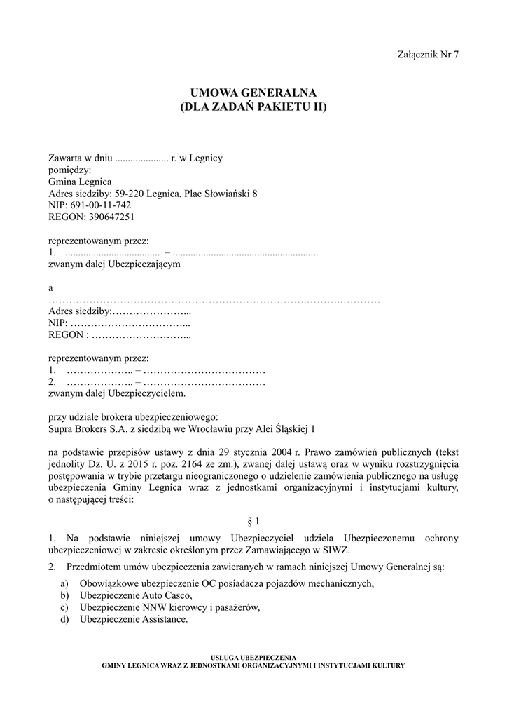Załącznik Nr 7 UMOWA GENERALNA (DLA ZADAŃ PAKIETU II) Zawarta w dniu ..................... r. w Legnicy pomiędzy: Gmina Legnica Adres siedziby: 59-220 Legnica, Plac Słowiański 8 NIP: 691-00-11-742 REGON: 390647251 reprezentowanym przez: 1. ..................................... – ......................................................... zwanym dalej Ubezpieczającym a ………………………………………………………………….……….………… Adres siedziby:…………………... NIP: ……………………………... REGON : ………………………... reprezentowanym przez: 1. ……………….. – ……………………………… 2. ……………….. – ……………………………… zwanym dalej Ubezpieczycielem. przy udziale brokera ubezpieczeniowego: Supra Brokers S.A. z siedzibą we Wrocławiu przy Alei Śląskiej 1 na podstawie przepisów ustawy z dnia 29 stycznia 2004 r. Prawo zamówień publicznych (tekst jednolity Dz. U. z 2015 r. poz. 2164 ze zm.), zwanej dalej ustawą oraz w wyniku rozstrzygnięcia postępowania w trybie przetargu nieograniczonego o udzielenie zamówienia publicznego na usługę ubezpieczenia Gminy Legnica wraz z jednostkami organizacyjnymi i instytucjami kultury, o następującej treści: §1 1. Na podstawie niniejszej umowy Ubezpieczyciel udziela Ubezpieczonemu ubezpieczeniowej w zakresie określonym przez Zamawiającego w SIWZ. 2. ochrony Przedmiotem umów ubezpieczenia zawieranych w ramach niniejszej Umowy Generalnej są: a) b) c) d) Obowiązkowe ubezpieczenie OC posiadacza pojazdów mechanicznych, Ubezpieczenie Auto Casco, Ubezpieczenie NNW kierowcy i pasażerów, Ubezpieczenie Assistance. USŁUGA UBEZPIECZENIA GMINY LEGNICA WRAZ Z JEDNOSTKAMI ORGANIZACYJNYMI I INSTYTUCJAMI KULTURY 3. W przypadku konieczności zawarcia umów polegających na powtórzeniu usług podobnych do zamówienia podstawowego (stanowiących 10% zamówienia podstawowego) dla konkretnych rodzajów ubezpieczeń sporządzone zostaną odpowiednie aneksy określające szczegółowo przedmiot, zakres i termin udzielanej ochrony ubezpieczeniowej. Wszelkie ubezpieczenia podobne do zamówienia podstawowego kalkulowane będą na bazie stawek określonych w Formularzu Ofertowym. §2 1. Umowa Generalna dotycząca ubezpieczeń, o których mowa w § 1 ust. 2 zawarta zostaje na okres 36 miesięcy, od dnia 01.01.2017 r. do dnia 31.12.2019 r. z podziałem na 3 okresy rozliczeniowe: a) pierwszy okres b) drugi okres c) trzeci okres od dnia 01.01.2017 r. do dnia 31.12.2017 r. od dnia 01.01.2018 r. do dnia 31.12.2018 r. od dnia 01.01.2019 r. do dnia 31.12.2019 r. 2. W ramach Umowy Generalnej Ubezpieczyciel wystawi polisy potwierdzające zawarcie konkretnych umów ubezpieczenia dla poszczególnych pojazdów, w zakresie i na okres określony w SIWZ oraz Załączniku Nr 12 do SIWZ. 3. Polisy wystawiane na kolejne okresy rozliczeniowe będą uwzględniały zmiany w przedmiocie ubezpieczenia przekazane przez Zamawiającego oraz składkę ubezpieczeniową dostosowaną do aktualnych sum ubezpieczenia. 4. Wszystkie ubezpieczenia na kolejne okresy rozliczeniowe oraz doubezpieczenia zawierane w trakcie trwania umowy a także zwroty składek kalkulowane będą na bazie stawek zastosowanych w ofercie tzn.: a) Obowiązkowe ubezpieczenie OC posiadacza pojazdów mechanicznych W ubezpieczeniu zastosowano stawkę (w zł): dla pojazdów ………………… - ……….. b) Ubezpieczenie Auto Casco W ubezpieczeniu zastosowano stawkę (w %): dla pojazdów …………………- ……………… c) Ubezpieczenie NNW kierowcy i pasażerów W ubezpieczeniu zastosowano stawkę (w zł): dla pojazdów ………………… - ……….. d) Ubezpieczenie Assistance W ubezpieczeniu zastosowano stawkę (w zł): dla pojazdów ………………… - ……….. 5. Do zawartych ubezpieczeń zastosowanie będą miały następujące udziały własne oraz franszyzy: a) Obowiązkowe ubezpieczenie OC posiadacza pojazdów mechanicznych Udział własny: ......................... Franszyza integralna: ......................... Franszyza redukcyjna: ....................... b) Ubezpieczenie Auto Casco USŁUGA UBEZPIECZENIA GMINY LEGNICA WRAZ Z JEDNOSTKAMI ORGANIZACYJNYMI I INSTYTUCJAMI KULTURY Udział własny: ......................... Franszyza integralna: ......................... Franszyza redukcyjna: ....................... c) Ubezpieczenie NNW kierowcy i pasażerów Udział własny: ......................... Franszyza integralna: ......................... Franszyza redukcyjna: ....................... d) Ubezpieczenie Assistance Udział własny: ......................... Franszyza integralna: ......................... Franszyza redukcyjna: ....................... 6. Pojazdy nowo nabywane w okresie obowiązywania umowy, które Ubezpieczony zdecyduje się objąć ubezpieczeniem w ramach niniejszej umowy zostaną objęte ochroną ubezpieczeniową na podstawie stawek uwzględniających zniżki zastosowane w ofercie. §3 1. Zakres ubezpieczeń zawartych na podstawie Umowy Generalnej określony jest szczegółowo w SIWZ wraz z załącznikami. Do poszczególnych rodzajów ubezpieczeń mają zastosowanie postanowienia SIWZ, niniejszej Umowy Generalnej oraz właściwych ogólnych warunków ubezpieczeń. 2. Wszelkie warunki określone w SIWZ i niniejszej Umowie Generalnej mają pierwszeństwo przed postanowieniami zawartymi w ogólnych warunkach ubezpieczeń. Ustala się, że w razie rozbieżności pomiędzy warunkami ubezpieczenia wynikającymi z ww. postanowień – strony przyjmą do stosowania takie rozwiązanie, które jest i będzie korzystniejsze dla Ubezpieczonego. §4 Składki należne w związku z ubezpieczeniem poszczególnych pojazdów podzielone zostają na dwie raty, płatne w odstępie sześciu miesięcy w każdym okresie rozliczeniowym. §5 1. Każdorazowo przy rozliczaniu składek i aktualizacji umów, obowiązywać będą ogólne warunki ubezpieczenia obowiązujące w dniu