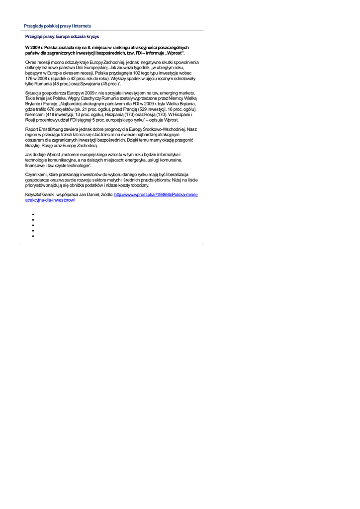 Przeglądy polskiej prasy i Internetu Przegląd prasy: Europa odczuła kryzys W 2009 r. Polska znalazła się na 8. miejscu w rankingu atrakcyjności poszczególnych państw dla zagranicznych inwestycji bezpośrednich, tzw. FDI – informuje „Wprost”. Okres recesji mocno odczuły kraje Europy Zachodniej, jednak negatywne skutki spowolnienia dotknęły też nowe państwa Unii Europejskiej. Jak zauważa tygodnik, „w ubiegłym roku, będącym w Europie okresem recesji, Polska przyciągnęła 102 tego typu inwestycje wobec 176 w 2008 r. (spadek o 42 proc. rok do roku). Większy spadek w ujęciu rocznym odnotowały tylko Rumunia (48 proc.) oraz Szwajcaria (45 proc.)”. Sytuacja gospodarcza Europy w 2009 r. nie sprzyjała inwestycjom na tzw. emerging markets. Takie kraje jak Polska, Węgry, Czechy czy Rumunia zostały wyprzedzone przez Niemcy, Wielką Brytanię i Francję. „Najbardziej atrakcyjnym państwem dla FDI w 2009 r. była Wielka Brytania, gdzie trafiło 678 projektów (ok. 21 proc. ogółu), przed Francją (529 inwestycji, 16 proc. ogółu), Niemcami (418 inwestycji, 13 proc. ogółu), Hiszpanią (173) oraz Rosją (170). W Hiszpanii i Rosji procentowy udział FDI sięgnął 5 proc. europejskiego rynku” – opisuje Wprost. Raport Ernst&Young zawiera jednak dobre prognozy dla Europy Środkowo-Wschodniej. Nasz region w przeciągu trzech lat ma się stać trzecim na świecie najbardziej atrakcyjnym obszarem dla zagranicznych inwestycji bezpośrednich. Dzięki temu mamy okazję przegonić Brazylię, Rosję oraz Europę Zachodnią. Jak dodaje Wprost „motorem europejskiego wzrostu w tym roku będzie informatyka i technologie komunikacyjne, a na dalszych miejscach: energetyka, usługi komunalne, finansowe i tzw. czyste technologie”. Czynnikami, które przekonają inwestorów do wyboru danego rynku mają być liberalizacja gospodarcza oraz wsparcie rozwoju sektora małych i średnich przedsiębiorstw. Niżej na liście priorytetów znajdują się obniżka podatków i niższe koszty robocizny. Krzysztof Garski, współpraca Jan Daniel, źródło: http://www.wprost.pl/ar/198986/Polska-mniejatrakcyjna-dla-inwestorow/