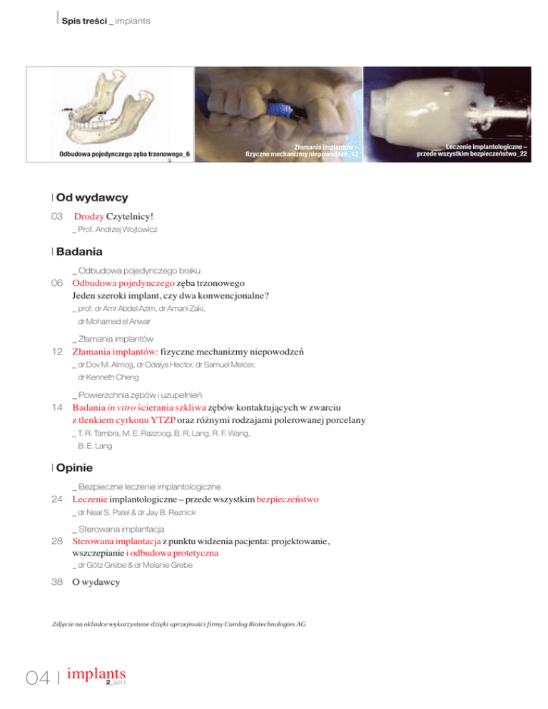 Spis treÊci _ implants Odbudowa pojedynczego z´ba trzonowego_6 Złamania implantów – fizyczne mechanizmy niepowodzeƒ_12 I Od wydawcy 03 Drodzy Czytelnicy! _ Prof. Andrzej Wojtowicz I Badania _ Odbudowa pojedynczego braku 06 Odbudowa pojedynczego zęba trzonowego Jeden szeroki implant, czy dwa konwencjonalne? _ prof. dr Amr Abdel Azim, dr Amani Zaki, dr Mohamed el Anwar _ Z∏amania implantów 12 Złamania implantów: fizyczne mechanizmy niepowodzeń _ dr Dov M. Almog, dr Odalys Hector, dr Samuel Melcer, dr Kenneth Cheng _ Powierzchnia z™bów i uzupe∏nieƒ 14 Badania in vitro ścierania szkliwa zębów kontaktujących w zwarciu z tlenkiem cyrkonu YTZP oraz różnymi rodzajami polerowanej porcelany _ T. R. Tambra, M. E. Razzoog, B. R. Lang, R. F. Wang, B. E. Lang I Opinie _ Bezpieczne leczenie implantologiczne 24 Leczenie implantologiczne – przede wszystkim bezpieczeństwo _ dr Neal S. Patel & dr Jay B. Reznick _ Sterowana implantacja 28 Sterowana implantacja z punktu widzenia pacjenta: projektowanie, wszczepianie i odbudowa protetyczna _ dr Götz Grebe & dr Melanie Grebe 38 O wydawcy Zdjęcie na okładce wykorzystane dzięki uprzejmości firmy Camlog Biotechnologies AG. 04 implants 2_ 2011 Leczenie implantologiczne – przede wszystkim bezpieczeƒstwo_22