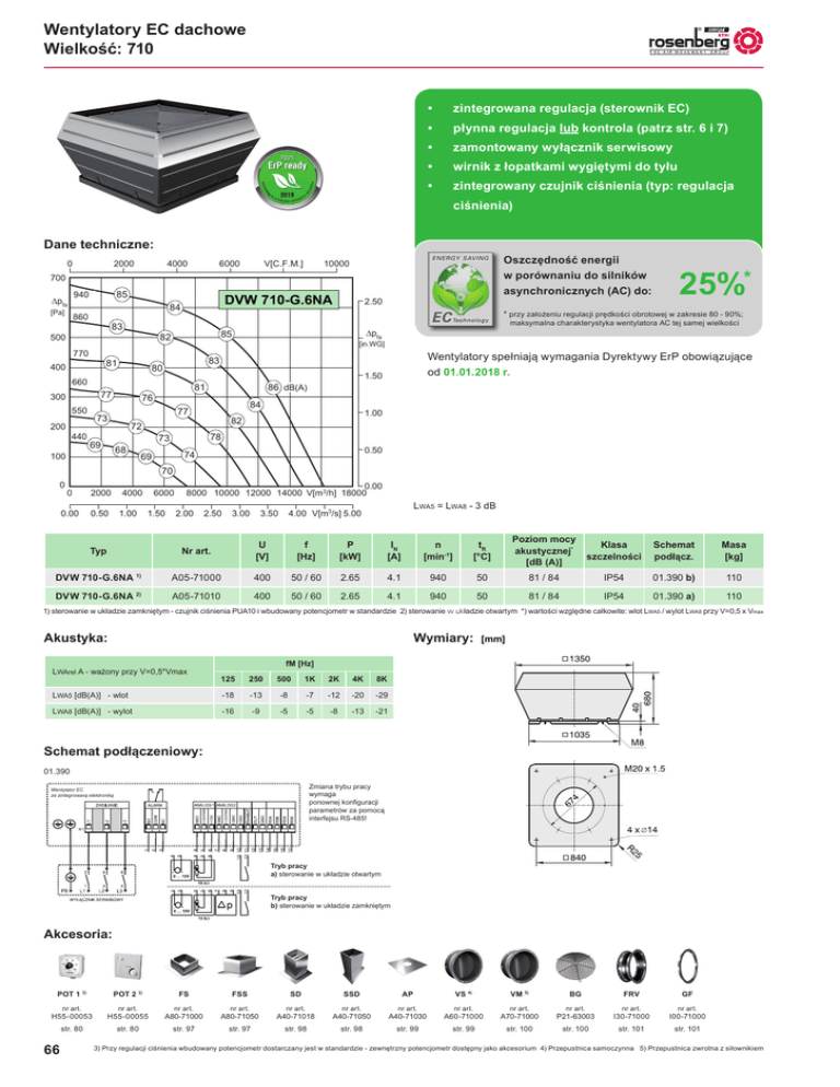 Wentylatory EC dachowe Wielkość: 710 • zintegrowana regulacja (sterownik EC) • płynna regulacja lub kontrola (patrz str. 6 i 7) • zamontowany wyłącznik serwisowy • wirnik z łopatkami wygiętymi do tyłu • zintegrowany czujnik ciśnienia (typ: regulacja ciśnienia) Dane techniczne: 0 2000 4000 V[C.F.M.] 6000 Oszczędność energii w porównaniu do silników asynchronicznych (AC) do: 10000 700 85 940 ∆pfa [Pa] DVW 710-G.6NA 84 860 83 500 770 400 80 77 550 200 440 69 68 100 Wentylatory spełniają wymagania Dyrektywy ErP obowiązujące od 01.01.2018 r. 1.50 86 dB(A) 84 77 72 [in.WG] 81 76 73 maksymalna charakterystyka wentylatora AC tej samej wielkości ∆pfa 83 660 300 * przy założeniu regulacji prędkości obrotowej w zakresie 80 - 90%; 85 82 81 2.50 25%* 1.00 82 78 73 0.50 74 69 70 0 0 2000 0.00 0.50 4000 1.00 6000 1.50 0.00 8000 10000 12000 14000 V[m3/h] 18000 2.00 2.50 3.00 LWA5 = LWA8 - 3 dB 4.00 V[m3/s] 5.00 3.50 Nr art. U [V] f [Hz] P [kW] IN [A] n [min-1] tR [°C] Poziom mocy akustycznej* [dB (A)] Klasa szczelności Schemat podłącz. Masa [kg] DVW 710-G.6NA 1) A05-71000 400 50 / 60 2.65 4.1 940 50 81 / 84 IP54 01.390 b) 110 DVW 710-G.6NA A05-71010 400 50 / 60 2.65 4.1 940 50 81 / 84 IP54 01.390 a) 110 Typ 2) 1) sterowanie w układzie zamkniętym - czujnik ciśnienia PUA10 i wbudowany potencjometr w standardzie 2) sterowanie w układzie otwartym *) wartości względne całkowite: wlot LWA5 / wylot LWA8 przy V=0,5 x Vmax Akustyka: Wymiary: LWArel A - ważony przy V=0,5*Vmax [mm] fM [Hz] 125 250 500 1K 2K 4K 8K LWA5 [dB(A)] - wlot -18 -13 -8 -7 -12 -20 -29 LWA8 [dB(A)] - wylot -16 -9 -5 -5 -8 -13 -21 Schemat podłączeniowy: 01.390 Zmiana trybu pracy wymaga ponownej konfiguracji parametrów za pomocą interfejsu RS-485! Wentylator EC ze zintegrowaną elektroniką Tryb pracy a) sterowanie w układzie otwartym Tryb pracy b) sterowanie w układzie zamkniętym Akcesoria: POT 1 3) POT 2 3) FS FSS SD SSD AP VS 4) VM 5) BG FRV GF nr art. nr art. nr art. nr art. nr art. nr art. nr art. nr art. nr art. nr art. nr art. nr art. H55-00053 H55-00055 A80-71000 A80-71050 A40-71018 A40-71050 A40-71030 A60-71000 A70-71000 P21-63003 I30-71000 I00-71000 str. 80 str. 80 str. 97 str. 97 str. 98 str. 98 str. 99 str. 99 str. 100 str. 100 str. 101 str. 101 66 3) Przy regulacji ciśnienia wbudowany potencjometr dostarczany jest w standardzie - zewnętrzny potencjometr dostępny jako akcesorium 4) Przepustnica samoczynna 5) Przepustnica zwrotna z siłownikiem