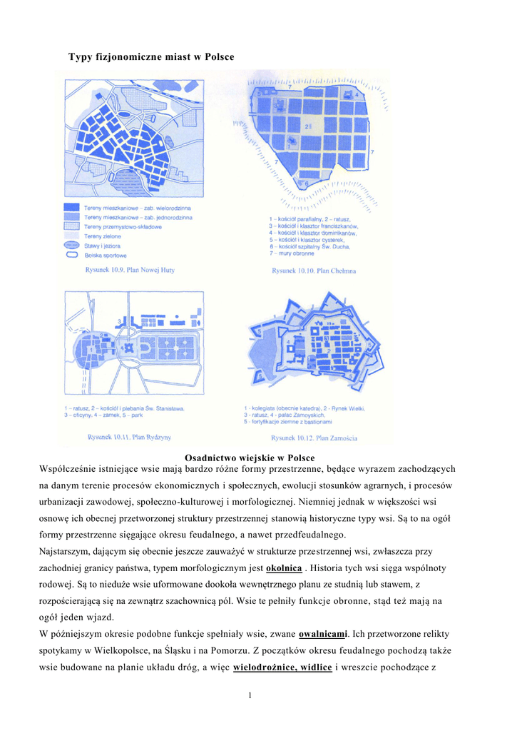Typy fizjonomiczne miast w Polsce Osadnictwo wiejskie w Polsce Współcześnie istniejące wsie mają bardzo różne formy przestrzenne, będące wyrazem zachodzących na danym terenie procesów ekonomicznych i społecznych, ewolucji stosunków agrarnych, i procesów urbanizacji zawodowej, społeczno-kulturowej i morfologicznej. Niemniej jednak w większości wsi osnowę ich obecnej przetworzonej struktury przestrzennej stanowią historyczne typy wsi. Są to na ogół formy przestrzenne sięgające okresu feudalnego, a nawet przedfeudalnego. Najstarszym, dającym się obecnie jeszcze zauważyć w strukturze przestrzennej wsi, zwłaszcza przy zachodniej granicy państwa, typem morfologicznym jest okolnica . Historia tych wsi sięga wspólnoty rodowej. Są to nieduże wsie uformowane dookoła wewnętrznego planu ze studnią lub stawem, z rozpościerającą się na zewnątrz szachownicą pól. Wsie te pełniły funkcje obronne, stąd też mają na ogół jeden wjazd. W późniejszym okresie podobne funkcje spełniały wsie, zwane owalnicami. Ich przetworzone relikty spotykamy w Wielkopolsce, na Śląsku i na Pomorzu. Z początków okresu feudalnego pochodzą także wsie budowane na planie układu dróg, a więc wielodrożnice, widlice i wreszcie pochodzące z 1 okresu komasacji dóbr królewskich (XIV w.), wprowadzania gospodarki trójpolowej i kolonizacji na prawie niemieckim ulicówki. O ile ulicówki są typem zabudowy zwartej, o tyle pochodzące na ogół z XIII —XV w. łańcuchówki są typem zabudowy luźnej, ciągnącej się wzdłuż drogi prowadzącej przez całą szerokość należących do danej wsi gruntów. Wiele tego typu wsi występuje na Wyżynie Lubelskiej, na Śląsku, w okolicach Rawicza, w Małopolsce i Karpatach. Jest to typ wsi powstający w krajobrazie pofałdowanym o wyraźnie zarysowanych dolinach. Pewną odmianą tego typu wsi są, pochodzące z kolonizacji na prawie niemieckim w XV w. rzędówki. Są to również wsie o luźnej zabudowie wzdłuż drogi, ale siedliska znajdują się tylko po jednej stronie tej drogi, a po drugiej rozciągają się przynależące do nich pola. Wiele tego typu wsi powstało w Polsce zachodniej i środkowej. Pewną odmianą tej formy wsi jest spotykana na Podlasiu szeregówka, w której stojące naprzeciw siebie domy tworzą uliczki wybiegające z drogi głównej. Ten typ wsi jest wyrazem procesów rozdrobnienia, zachodzących na wsi począwszy od XVI w. Proces ten pogłębiał się wraz z uwłaszczeniem chłopów, regulacjami i komasacjami oraz działami spadkowymi. Zaowocowało to powstaniem przeróżnych przysiółków, kolonii i wsi samotniczych. Kształty wsi w Polsce Okolnica Owalnica Wielodrożnica Widlica Ulicówka łańcuchówka 2 Rzędówka Szeregówka 3 PRAWIDŁOWOŚCI OSADNICZE I. Sieć osadnicza • Wraz ze wzrostem gospodarczego i kulturowego poziomu społeczeństwa lokalizacja poszczególnych jednostek osadniczych stopniowo uniezależnia się od warunków środowiska przyrodniczego • Gęstość sieci osadniczej wzrasta wraz ze wzrostem gęstości zaludnienia • Gęstość sieci osadniczej zmniejsza się wraz ze wzrostem wysokości nad poziom morza i urozmaiceniem rzeźby terenu • Gęstość sieci osadniczej zwiększa się wraz z zasobnością terenu w bogactwa mineralne i żyznością gleb • Im dłużej trwał proces zagospodarowywania terenu przez człowieka, w obrębie jednej kultury, tym gęstość sieci osadniczej jest większa • Gęstość sieci osadniczej wzrasta wraz z rozwojem handlu, uprzemysłowienia terenu i wzrostem gęstości sieci komunikacyjnej • Rozwój gospodarczy i kulturowy ludności prowadzi do ciągłych przekształceń poszczególnych jednostek osadniczych • Zróżnicowanie jednostek osadniczych na wsie i miasta rozpoczęło się w momencie wystąpienia geograficznego podziału pracy • Proces urbanizacji powoduje ciągłe zmiany w strukturze sieci osadniczej • Powstanie, rozwój i rozmieszczenie jednostek osadniczych jest wypadkową warunków naturalnych i kierunków rozwoju społeczno-gospodarczego danego obszaru II. Wsie • Kształt wsi i jej wygląd zależą od okresu powstania,. topografii terenu i typu gospodarki rolnej • Zmiany fizjonomii i układu przestrzennego wsi zachodzą na skutek zmian typu gospodarki rolnej • Proces urbanizacji prowadzi do zaniku granic między miastem i wsią III. Miasto • Miasta powstawały we wszystkich okresach historycznych, lecz w każdym z nich z innych powodów • Układ przestrzenny miasta zależy od topografii terenu i okresu jego powstania • Zmieniające się w różnych okresach główne czynniki miastotwórcze powodują zmiany w układach przestrzennych miast już istniejących • Pierwotna funkcja miasta decyduje o jego powstaniu i miejscu położenia • Im miasto jest starsze tym większe prawdopodobieństwo ewolucji jego funkcji • Wraz z rozwojem ludnościowym miasta wzrasta liczba pełnionych przez nie funkcji • Wskaźnik urbanizacji wzrasta wraz z poziomem rozwoju gospodarczego • We wszystkich typach zespołów miejskich miasta są ze sobą ściśle powiązane funkcjonalnie i komunikacyjnie • Rozwój przemysłu, komunikacji i usług decydując przechodzeniu miast w kolejne fazy urbanizacji • Dynamika procesów urbanizacyjnych jest odwrotnie proporcjonalna do poziomu rozwoju gospodarczego • W krajach wysoko rozwiniętych wszystkie wielkie miasta znajdują się w trzeciej lub czwartej fazie urbanizacji 4 Zadania: 1. Przyporządkuj odpowiednie definicje pojęciom. a) urbanizacja demograficzna b) urbanizacja formalna c) urbanizacja ekonomiczna d) urbanizacja przestrzenna e) urbanizacja społeczna A) Upowszechnianie miejskiego stylu życia. B) Rozrost miast przez m.in. inkorporację terenów podmiejskich, wsi, miasteczek. …………… C) Wzrost liczby ludności miejskiej wskutek zwiększonej migracji. ………… D) Prawne uznanie danej jednostki za miasto. ……….. 2. ……………. Podaj definicję i dw