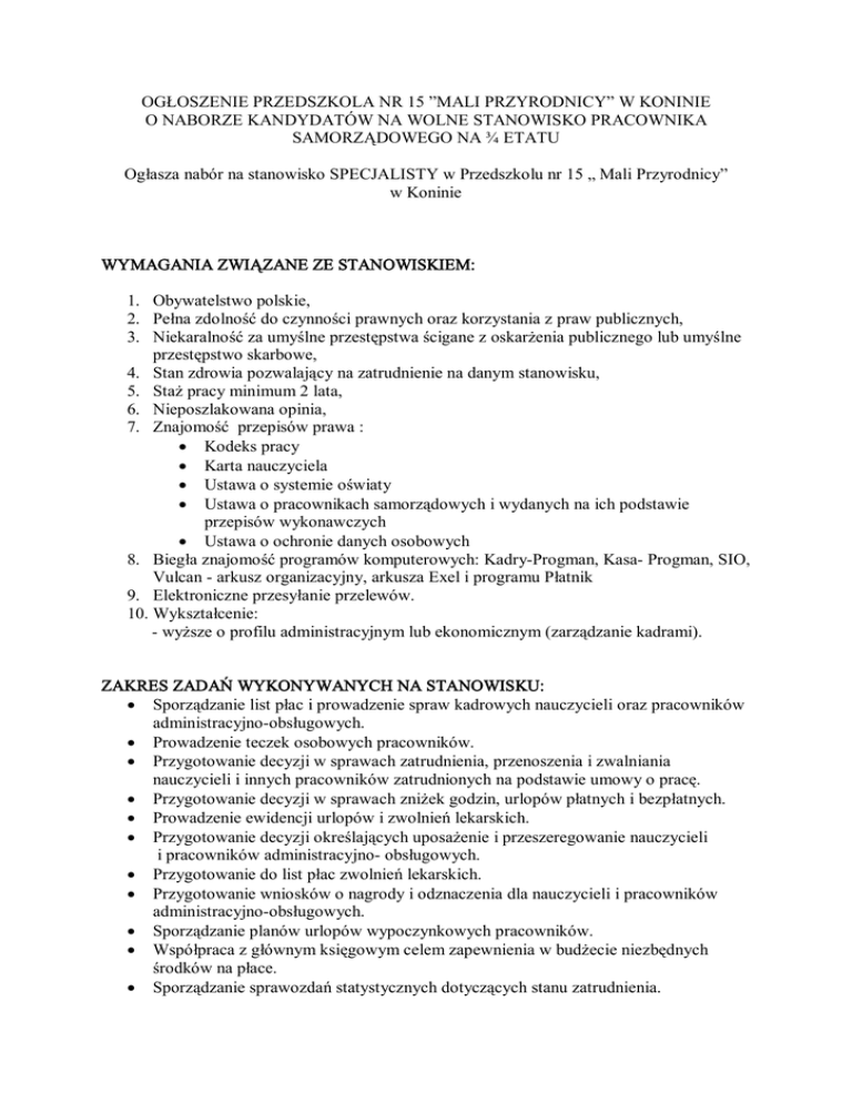 OGŁOSZENIE PRZEDSZKOLA NR 15 ”MALI PRZYRODNICY” W KONINIE O NABORZE KANDYDATÓW NA WOLNE STANOWISKO PRACOWNIKA SAMORZĄDOWEGO NA ¾ ETATU Ogłasza nabór na stanowisko SPECJALISTY w Przedszkolu nr 15 „ Mali Przyrodnicy” w Koninie WYMAGANIA ZWIĄZANE ZE STANOWISKIEM: 1. Obywatelstwo polskie, 2. Pełna zdolność do czynności prawnych oraz korzystania z praw publicznych, 3. Niekaralność za umyślne przestępstwa ścigane z oskarżenia publicznego lub umyślne przestępstwo skarbowe, 4. Stan zdrowia pozwalający na zatrudnienie na danym stanowisku, 5. Staż pracy minimum 2 lata, 6. Nieposzlakowana opinia, 7. Znajomość przepisów prawa : Kodeks pracy Karta nauczyciela Ustawa o systemie oświaty Ustawa o pracownikach samorządowych i wydanych na ich podstawie przepisów wykonawczych Ustawa o ochronie danych osobowych 8. Biegła znajomość programów komputerowych: Kadry-Progman, Kasa- Progman, SIO, Vulcan - arkusz organizacyjny, arkusza Exel i programu Płatnik 9. Elektroniczne przesyłanie przelewów. 10. Wykształcenie: - wyższe o profilu administracyjnym lub ekonomicznym (zarządzanie kadrami). ZAKRES ZADAŃ WYKONYWANYCH NA STANOWISKU: Sporządzanie list płac i prowadzenie spraw kadrowych nauczycieli oraz pracowników administracyjno-obsługowych. Prowadzenie teczek osobowych pracowników. Przygotowanie decyzji w sprawach zatrudnienia, przenoszenia i zwalniania nauczycieli i innych pracowników zatrudnionych na podstawie umowy o pracę. Przygotowanie decyzji w sprawach zniżek godzin, urlopów płatnych i bezpłatnych. Prowadzenie ewidencji urlopów i zwolnień lekarskich. Przygotowanie decyzji określających uposażenie i przeszeregowanie nauczycieli i pracowników administracyjno- obsługowych. Przygotowanie do list płac zwolnień lekarskich. Przygotowanie wniosków o nagrody i odznaczenia dla nauczycieli i pracowników administracyjno-obsługowych. Sporządzanie planów urlopów wypoczynkowych pracowników. Współpraca z głównym księgowym celem zapewnienia w budżecie niezbędnych środków na płace. Sporządzanie sprawozdań statystycznych dotyczących stanu zatrudnienia. Sporządzanie miesięcznych przypisów i odpisów pobytu dzieci w przedszkolu. Prowadzenie ewidencji dzieci uczęszczających do przedszkola. Uzgadnianie z głównym księgowym stanu zatrudnienia i funduszu płac, sprawdzanie pod względem merytorycznym listy płac. Prowadzenie archiwizacji dokumentacji przedszkolnej. Naliczanie świadczeń pracowniczych Przygotowanie dokumentów do ZUS Sporządzanie umów cywilno-prawnych Sporządzanie i przekazywanie danych do Systemu Informacji Oświatowych Sporządzanie raportów kasowych Prowadzenie na bieżąco rejestrów: -pracowników, którzy odeszli na emeryturę lub rentę -nauczycieli przebywających na urlopie dla poratowania zdrowia -pracowników będących na urlopie macierzyńskim lub wychowawczym -nauczycieli ze stażem powyżej 30 lat Przyjmowanie i wypłacanie należności na podstawie dokumentów źródłowych po uprzednim ich opisaniu i zaakceptowaniu przez: -pod względem merytorycznym – osoby stwierdzającej celowość i zasadność wydatku, -pod względem formalnym i rachunkowym przez głównego księgowego i dyrektora przedszkola Przyjmowanie wpłat gotówkowych za pomocą kwitariuszy, Bieżące wystawianie czeków gotówkowych, sporządzanie poleceń przelewu i przekazów na podstawie dokumentów źródłowych Prowadzenie druków ścisłego zarachowania Podejmowanie gotówki z banku Bieżące przekazywanie raportów kasowych do głównego księgowego Informowanie rodziców o terminie zbierania odpłatności za dzieci w przedszkolu Zbieranie odpłatności za przedszkole Wykonywanie innych czynności kadrowych wynikających z obowiązujących przepisów oraz zleconych przez bezpośredniego przełożonego. WYMAGANE DOKUMENTY APLIKACYJNE 1. Kserokopie dokumentów potwierdzających wykształcenie i dodatkowe kwalifikacje 2. Życiorys- curriculum - vitae 3. List motywacyjny 4. Kserokopie zaświadczeń o ukończonych kursach, szkoleniach 5. Kwestionariusz osobowy dla osób ubiegających się o zatrudnienie 6. Kserokopie świadectw pracy 7. Podpisane pisemne oświadczenie o pełnej zdolności do czynności prawnych, w korzystaniu z pełni praw publicznych. 8. Zapytanie o niekaralności za przestępstwa popełnione umyślnie. 9. Zaświadczenie o braku przeciwwskazań zdrowotnych do wykonywania pracy na stanowisku specjalista 10. Klauzula o treści: „ Wyrażam zgodę na przetwarzanie moich danych osobowych zawartych w zgłoszeniu dla potrzeb rekrutacji, zgodnie z ustawą z dnia 29 sierpnia 1997 roku o ochronie danych osobowych ( Dz. U. Nr 133, poz. 83, ze zm.)” WYMOGI FORMALNE 1. Złożenie wymaganych dokumentów 2. Spełnianie wymagań związanych ze stanowiskiem DOKUMENTY W KOPERCIE Z ADNOTACJĄ „KONKURS NA STANOWISKO SPECJALISTY”, NALEŻY SKŁADAĆ W PRZEDSZKOLU NR 15 „MALI PRZYRODNICY” W KONINIE, UL. 11 LISTOPADA 32, OD PONIEDZIAŁKU DO PIĄTKU W GODZINACH OD 8.00 DO 15.00, DO DNIA 10.01.2013 r. POSTĘPOWANIE KONKURSOWE OBEJMUJE ANALIZĘ WSZYSTKICH ZŁOŻONYCH DOKUMENTÓW ORAZ ROZMOWY Z KANDYDATAMI. O TERMINACH ROZMOWY POINFORMUJEMY TELEFONICZNIE LUB LISTOWNIE. NADESŁANYCH DOKUMENTÓW NIE ZWRACAMY. DOKUMENTY, KTÓRE WPŁYNĄ DO PRZEDSZKOLA PO WYŻEJ WYMIENIONYM TERMINIE NIE BĘDĄ ROZPATRYWANE. Dyrektor Przedszkola Maria Kałużna