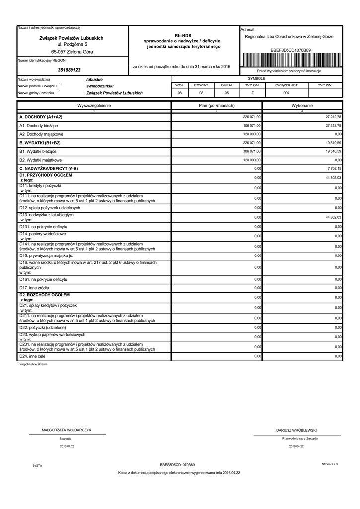 Nazwa i adres jednostki sprawozdawczej Związek Powiatów Lubuskich ul. Podgórna 5 65-057 Zielona Góra Numer identyfikacyjny REGON 361889123 Nazwa województwa Nazwa powiatu / związku Nazwa gminy / związku lubuskie Związek Powiatów Lubuskich 1) Regionalna Izba Obrachunkowa w Zielonej Górze BBEF8D5CD1070B89 za okres od początku roku do dnia 31 marca roku 2016 świebodziński 1) Adresat: Rb-NDS sprawozdanie o nadwyżce / deficycie jednostki samorządu terytorialnego WOJ. 08 POWIAT Wyszczególnienie A. DOCHODY (A1+A2) GMINA 08 05 TYP GM. Z Plan (po zmianach) 1 2 A1. Dochody bieżące ZWIĄZEK JST TYP ZW. 005 Wykonanie 226 071,00 3 106 071,00 A2. Dochody majątkowe B. WYDATKI (B1+B2) B1. Wydatki bieżące B2. Wydatki majątkowe C. NADWYŻKA/DEFICYT (A-B) D1. PRZYCHODY OGÓŁEM z tego: D11. kredyty i pożyczki w tym: D111. na realizację programów i projektów realizowanych z udziałem środków, o których mowa w art.5 ust.1 pkt 2 ustawy o finansach publicznych D12. spłata pożyczek udzielonych D13. nadwyżka z lat ubiegłych w tym: D131. na pokrycie deficytu D14. papiery wartościowe w tym: D141. na realizację programów i projektów realizowanych z udziałem środków, o których mowa w art.5 ust.1 pkt 2 ustawy o finansach publicznych D15. prywatyzacja majątku jst D16. wolne środki, o których mowa w art. 217 ust. 2 pkt 6 ustawy o finansach publicznych w tym: D161. na pokrycie deficytu D17. inne źródła D2. ROZCHODY OGÓŁEM z tego: D21. spłaty kredytów i pożyczek w tym: D211. na realizację programów i projektów realizowanych z udziałem środków, o których mowa w art.5 ust.1 pkt 2 ustawy o finansach publicznych D22. pożyczki (udzielone) D23. wykup papierów wartościowych w tym: D231. na realizację programów i projektów realizowanych z udziałem środków, o których mowa w art.5 ust.1 pkt 2 ustawy o finansach publicznych 1) Przed wypełnieniem przeczytać instrukcję SYMBOLE D24. inne cele 27 212,78 27 212,78 120 000,00 0,00 226 071,00 19 510,59 106 071,00 19 510,59 120 000,00 0,00 0,00 7 702,19 0,00 44 302,03 0,00 0,00 0,00 0,00 0,00 0,00 0,00 44 302,03 0,00 0,00 0,00 0,00 0,00 0,00 0,00 0,00 0,00 0,00 0,00 0,00 0,00 0,00 0,00 0,00 0,00 0,00 0,00 0,00 0,00 0,00 0,00 0,00 0,00 0,00 0,00 0,00 niepotrzebne skreślić MAŁGORZATA WŁUDARCZYK DARIUSZ WRÓBLEWSKI Przewodnic ząc y Zarządu Skarbnik 2016.04.22 BeSTia 2016.04.22 BBEF8D5CD1070B89 Kopia z dokumentu podpisanego elektronicznie wygenerowana dnia 2016.04.22 Strona 1 z 3 Dane uzupełniające: E. Finansowanie deficytu, zgodnie z art. 217 ust. 2 ustawy o finansach publicznych Wyszczególnienie Plan (po zmianach) 1 2) 2 4) E. FINANSOWANIE DEFICYTU (E1+E2+E3+E4+E5) z tego: Wykonanie 0,00 3) 3 0,00 E1. sprzedaż papierów wartościowych wyemitowanych przez jednostkę samorządu terytorialnego 0,00 0,00 E2. kredyty i pożyczki 0,00 0,00 E3. prywatyzacja majątku jednostki samorządu terytorialnego 0,00 0,00 E4. nadwyżka budżetu jednostki samorządu terytorialnego z lat ubiegłych E5. wolne środki jako nadwyżka środków pieniężnych na rachunku bieżącym budżetu jednostki samorządu terytorialnego, wynikających z rozliczeń wyemitowanych papierów wartościowych, kredytów i pożyczek z lat ubiegłych 0,00 0,00 0,00 0,00 2) jednostki wypełniają za I, II, III i IV kwartał 4) wypełniają jednostki, w których planowana lub wykonana różnica między dochodami a wydatkami jest ujemna 3) jednostki wypełniają tylko za IV kwartał F. Dane uzupełniające do wyliczenia relacji, o których mowa w art. 242 i 243 ustawy o finansach publicznych Wyszczególnienie Plan (po zmianach) 1 F1. Łączna kwota wyłączeń z relacji, o której mowa w art. 243 ust. 1 ustawy o finansach publicznych w okresie sprawozdawczym w tym: F11. kwota wyłączeń, o których mowa w art. 243 ust. 3 ustawy o finansach publicznych F12. kwota wyłączeń, o których mowa w art. 243 ust. 3a ustawy o finansach publicznych F13. wykup papierów wartościowych, spłata kredytów i pożyczek zaciągniętych na spłatę przejętych zobowiązań samodzielnego publicznego zakładu opieki zdrowotnej F14. wykup obligacji nominowanych w walutach obcych wyemitowanych na zagraniczne rynki przed 1 stycznia 2010 r. F2. Zobowiązania związku współtworzonego przez jednostkę samorządu terytorialnego przypadające do spłaty w roku budżetowym F3. Kwota związana z realizacją wydatków bieżących, o których mowa w art. 242 ustawy o 5) finansach publicznych 3 0,00 0,00 0,00 0,00 0,00 0,00 0,00 0,00 0,00 0,00 0,00 0,00 X F4. Kwota wydatków bieżących ponoszonych na spłatę przejętych zobowiązań samodzielnego publicznego zakładu opieki zdrowotnej przekształconego na zasadach określonych w ustawie o działalności leczniczej 5) Wykonanie 2 0,00 0,00 0,00 wypełniają jednostki tylko za IV kwartały MAŁGORZATA WŁUDARCZYK DARIUSZ WRÓBLEWSKI Przewodnic ząc y Zarządu Skarbnik 2016.04.22 BeSTia 2016.04.22 BBEF8D5CD1070B89 Kopia z dokumentu podpisanego elektronicznie wygenerowana dnia 2016.04.22 Strona 2 z 3 Wyjaśnienia do sprawozdania Rb-NDS MAŁGORZATA WŁUDARCZYK DARIUSZ WRÓBLEWSKI Przewodnic ząc y Zarządu Skarbnik 2016.04.22 BeSTia 2016.04.22 BBEF8D5CD1070B89 Kopia z dokumentu podpisanego elektronicznie wygenerowana dnia 2016.04.22 Strona 3 z 3